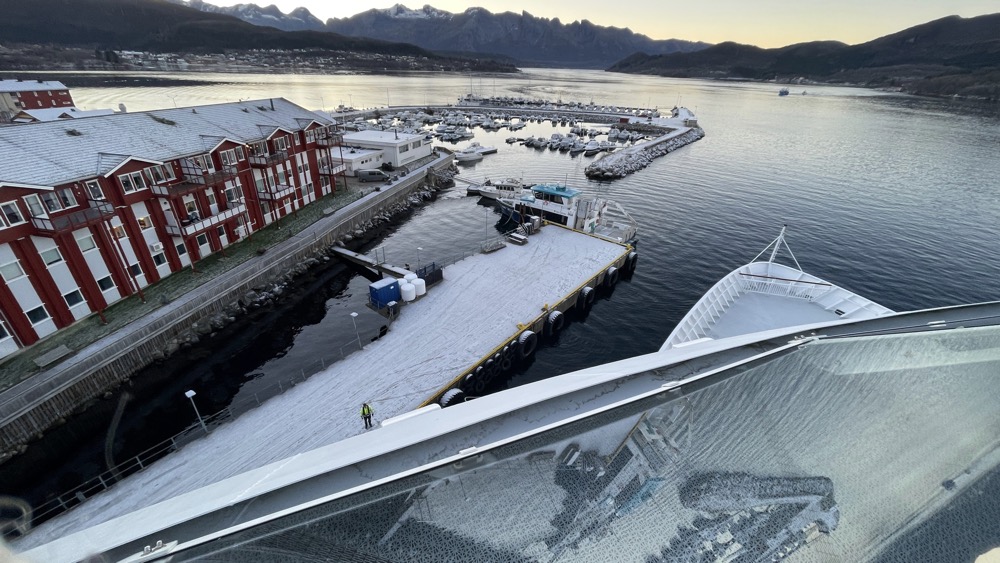 Om 10:00 uur varen we Ornes binnen, een mooie binnenkomst met eilandjes waar typische Noorse huizen staan. We blijven 10 minuten en in die tijd worden door een vorkheftruck vier enorme zakken van het schip naar de kade gereden, waarna direct de gangway weer opgehaald wordt en we snel afscheid nemen van Ornes.