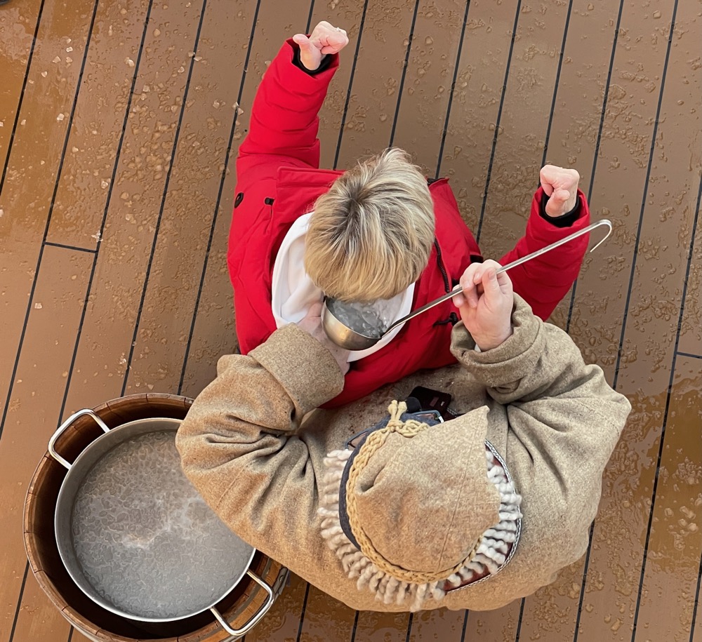 Wij varen rustig verder en de ‘evenementen’ volgen elkaar snel op. Zo snel dat mensen, na de ene bezienswaardigheid, met hun jas dicht weer binnen gaan zitten om te wachten op het volgende hoogtepunt. Je hoeft je niet te vervelen: om 10:30 uur start de viering van het passeren van de poolcirkel, eerder die morgen. Uiteraard met het nodige theater 😉 Wie wil, krijgt ijsblokjes in zijn nek om dit te vieren!