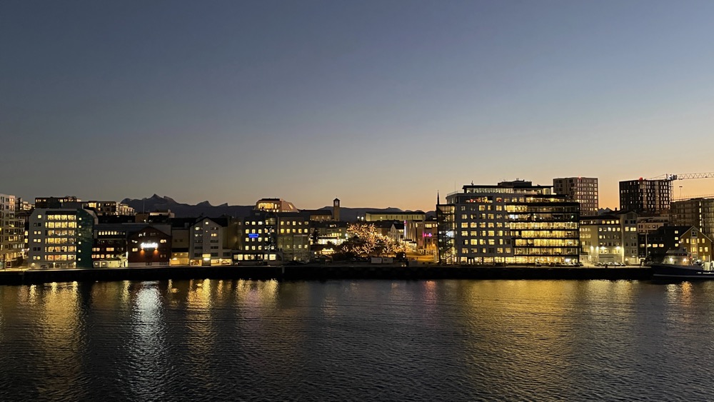 Ik zorg dat ik op tijd weer terug ben! Dus voor de veiligheid heb ik 15:00 aangehouden in plaats van 15:20 uur. Eenmaal op het schip gaat het rustige leven verder. Mensen zitten in de lounges, er zijn lokale inwoners ingestapt, of mensen zoeken hun hut op. Bij het vertrek van de Havila Capella is de zon ondergegaan en geniet ik van de vele lichtjes in de stad wanneer we langsvaren.