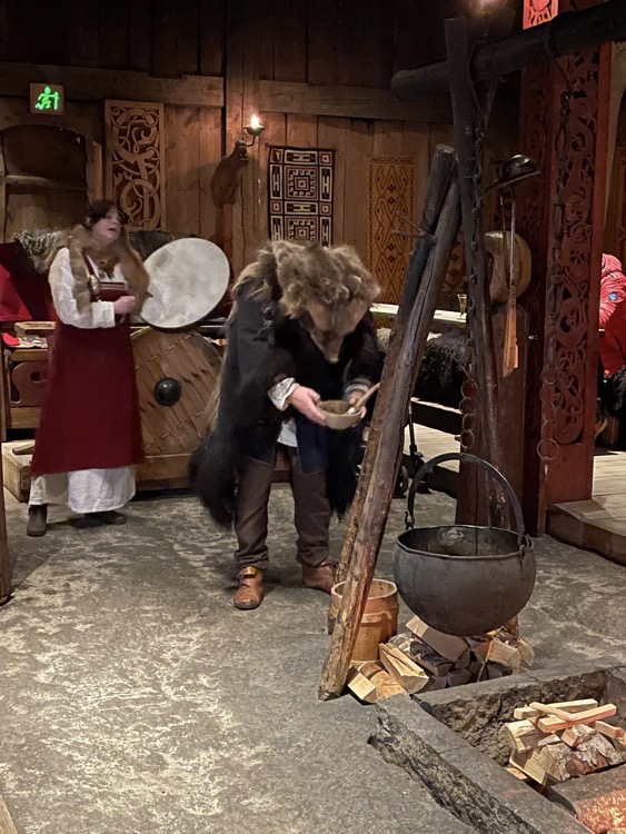 Het avondeten sla ik over want ik ga op excursie in Stamsund (19:15 uur), op de Lofoten eilanden waar je bergen vindt met hoge pieken. We stoppen er een kleine 25 minuten, maar tijd genoeg om uit te stappen. Ik ga naar een Vikingmuseum in Leknes, waar we een feestelijke Vikingmaaltijd krijgen aangeboden met uiteraard ‘echte’ Vikingen daarbij die met ons het Julfeest vieren. Een klein uur worden we getrakteerd op lamsvlees, eten zonder vork, aardappelen, groente en rijst. De bus rijdt ons vervolgens naar een andere haven waar de Capella inmiddels aan de kade ligt: Svolvaer. Onderweg zien we het Noorderlicht verschijnen omdat het wederom onbewolkt is.
