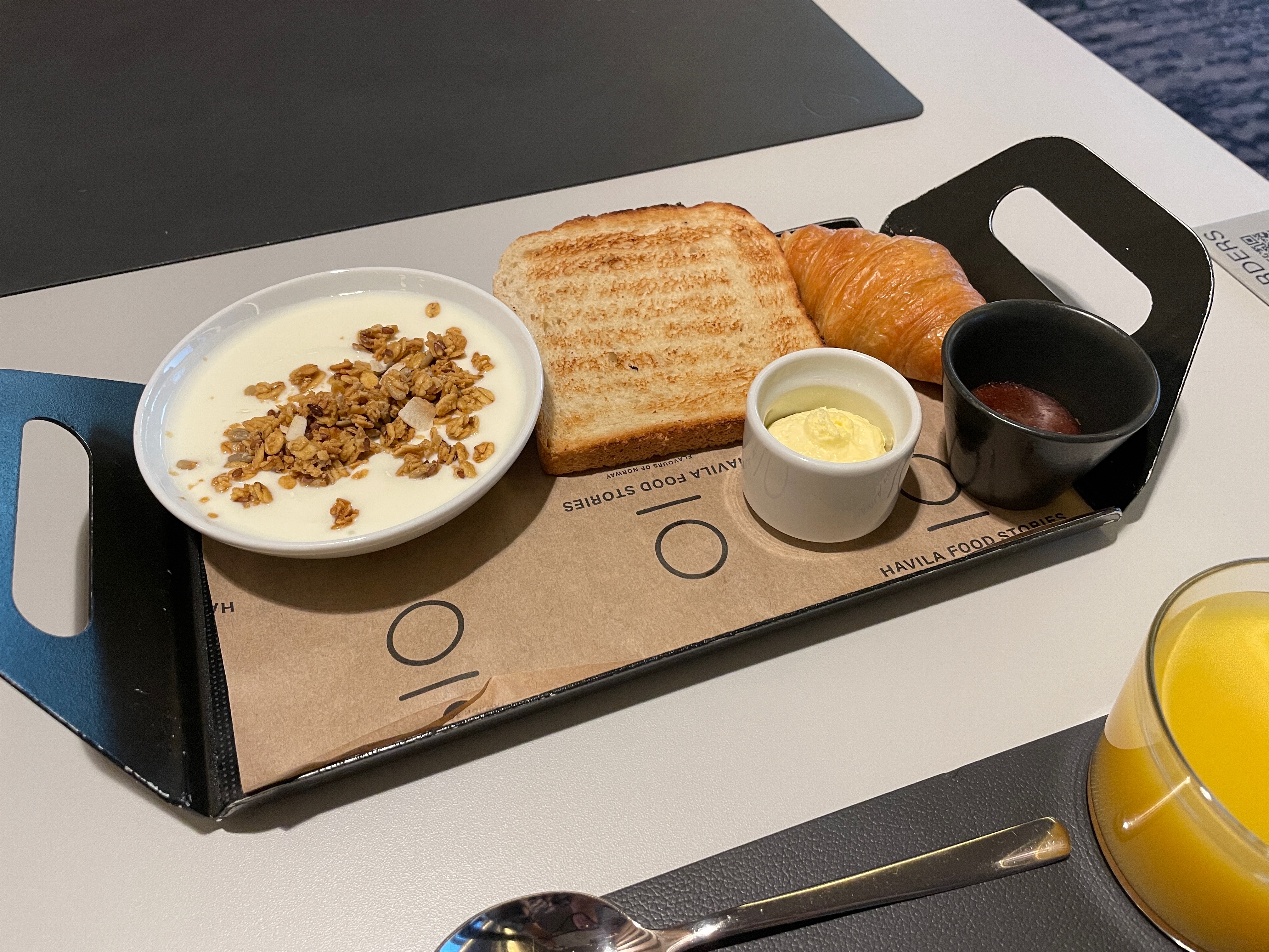 Om 09:00 loop ik voor mijn ontbijt binnen in restaurant Havrand voor mijn eerste ontbijt. Je kunt vanaf zeven uur ontbijten, maar ik heb gekozen voor negen uur. Vannacht is de Havila Capella nog gestopt in Brønnøysund, Sandnessjøen en Nesna, waarvan ik zeer weinig gemerkt heb. Ik zie wel bij het ontbijt wat nieuwe gezichten, lokale reizigers die op- en afstappen op de route. Net als het lunch en diner, kan ik voor mijn ontbijt uit diverse kleinere gerechten kiezen. Uiteraard kan je altijd bijbestellen als je meer wilt.