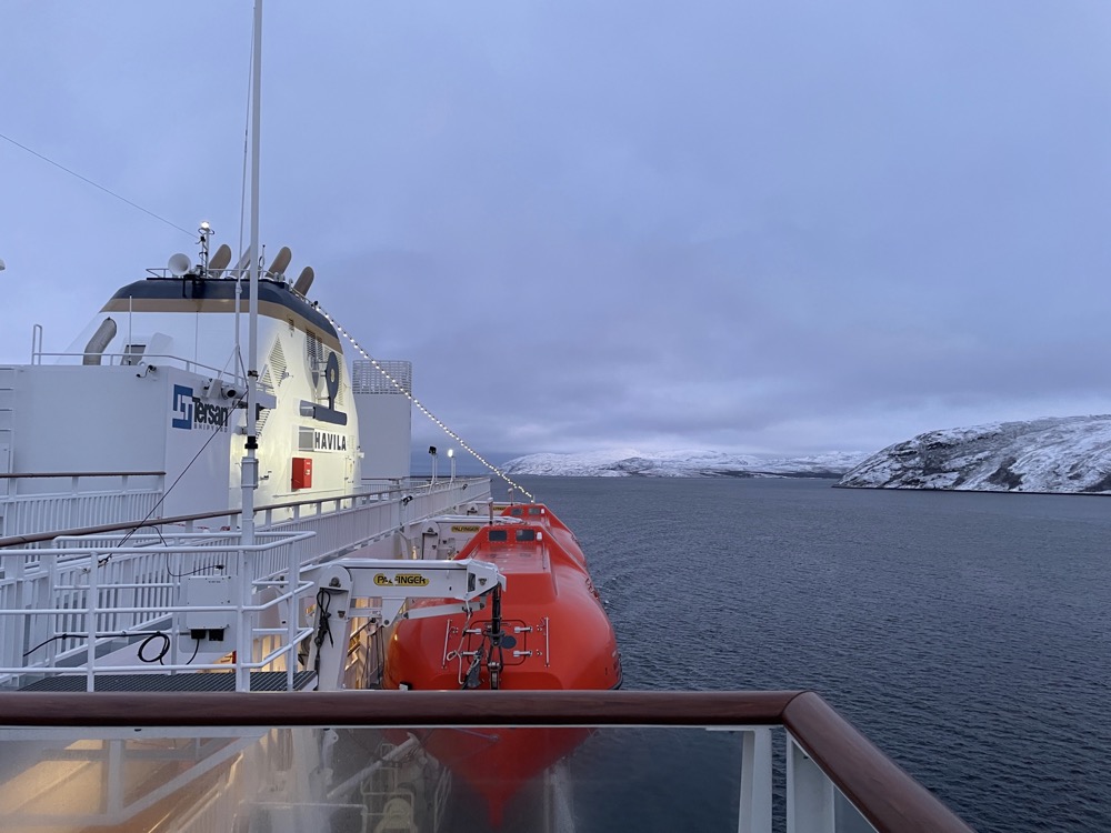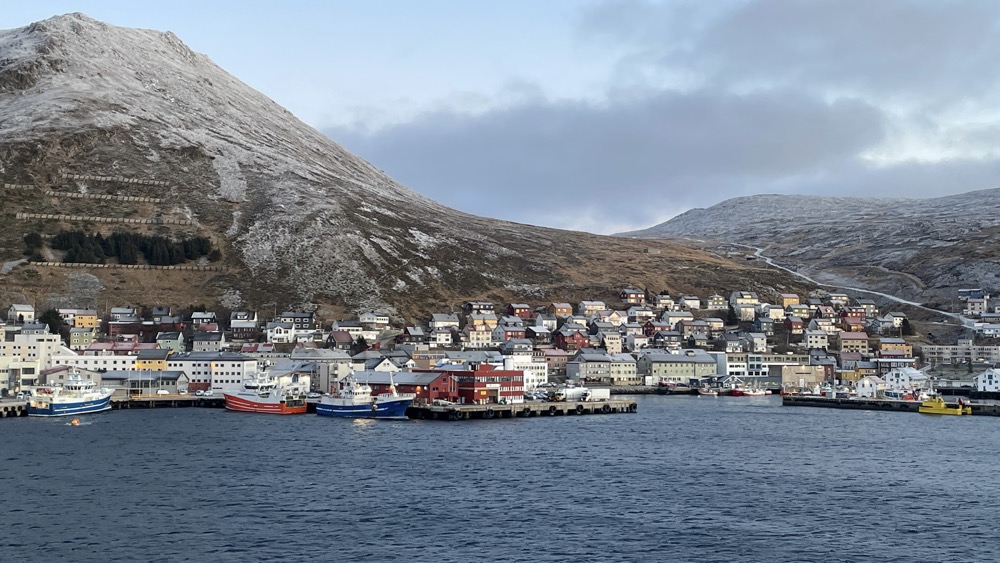 Vannacht had ik wat onrustig geslapen, voor het eerst eigenlijk, doordat het weer wat onrustiger was én omdat ik het aanmeren bij enkele dorpjes nu voelde. De Capella moest alle motoren bijzetten om aan de kade te geraken. Van de dorpjes Skjervoy (22:10 uur), Oksfjord (01:50 uur), Hammerfest (05:05 uur) en Havoysund (08:30 uur) heb ik dus toch wat meegekregen. Ik kan me overigens voorstellen dat, als het echt slecht weer is, je behoorlijk zeeziek kunt worden als je geen zeebenen hebt. Nadat ik wakker word, zet ik direct op de tv de boegcamera aan waar ik nog precies kan zien wat er voor het schip gebeurt.