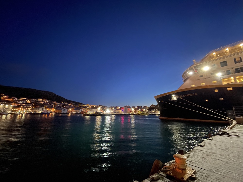 Om half 3 is het echt donker geworden in Honningsvåg en vertrekken we naar de volgende langere stop, Kirkenes, waar we morgenochtend om 09:00 uur arriveren. In de tussentijd staan nog eens 6 dorpjes op de route, maar in de avond blijkt dat er eentje geannuleerd wordt. Het weer slaat iets om, met meer deining, maar zeker niet heel slecht.