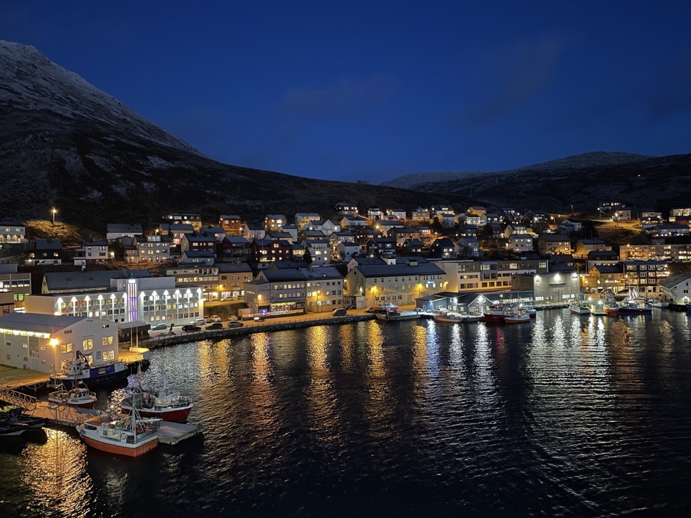 We arriveren we in Honningsvåg om 11:05. Wat een spannend moment! Honningsvåg is een mooi vissersdorp, groter dan ik verwacht had, dat een lange roerige historie kent. Zo is in de Tweede Wereldoorlog vrijwel alles afgebrand, behalve de kerk.