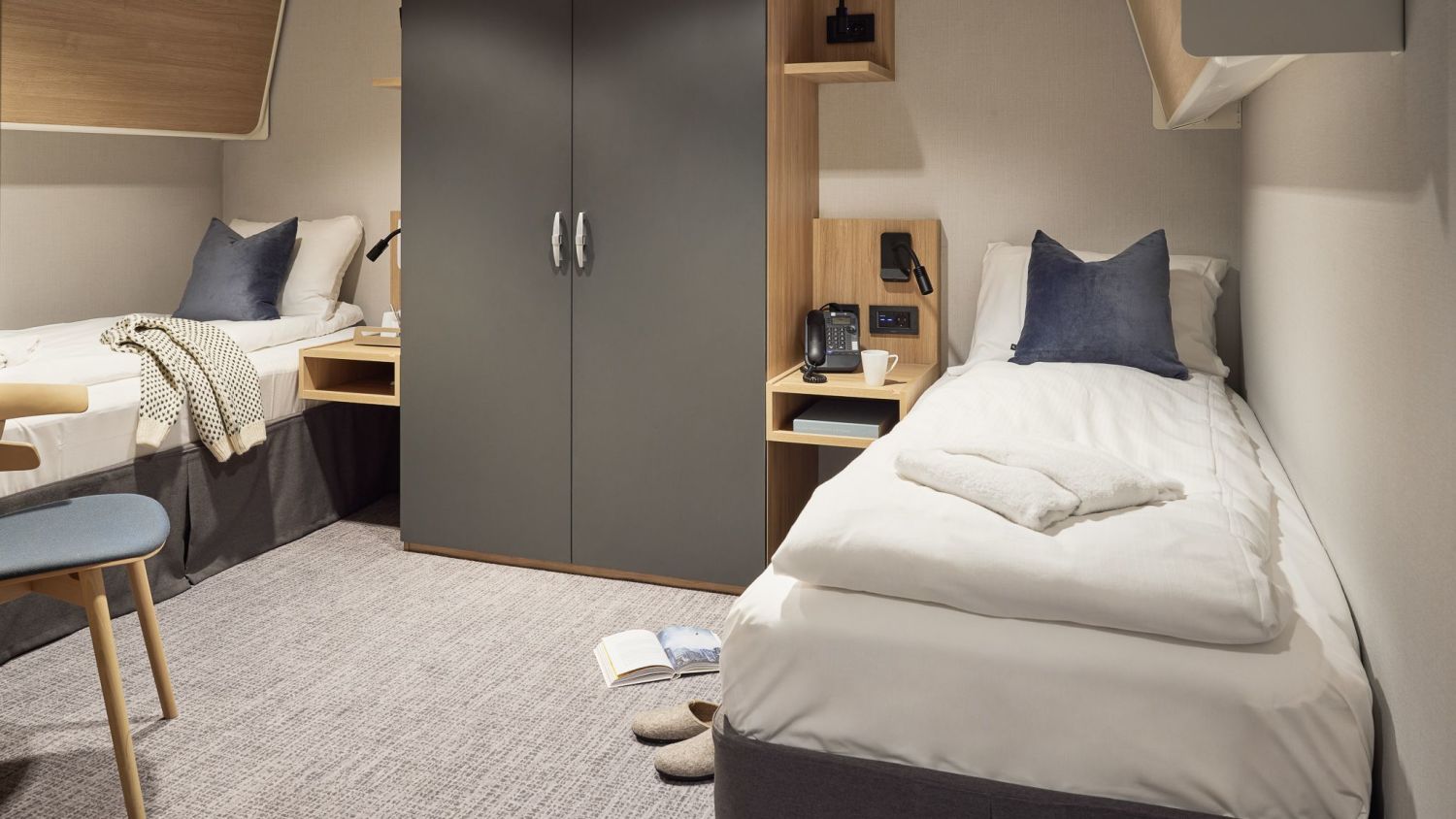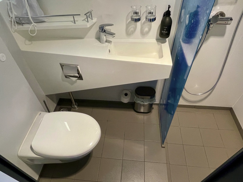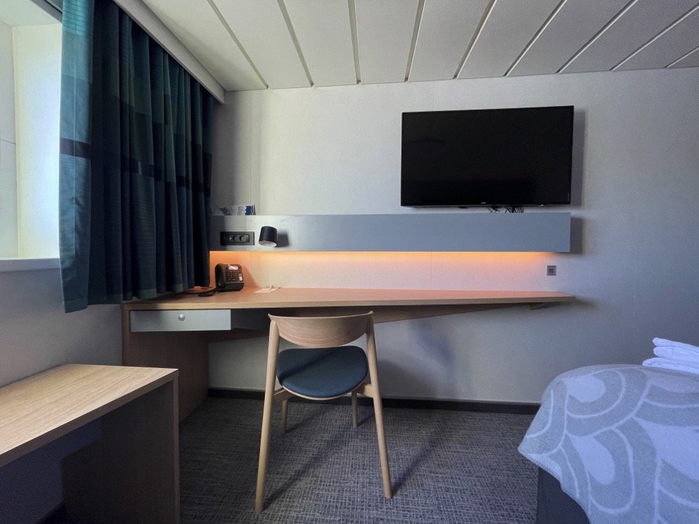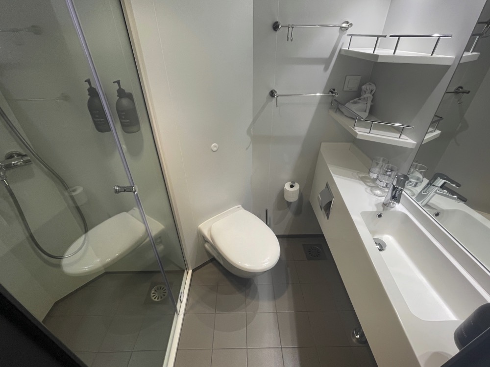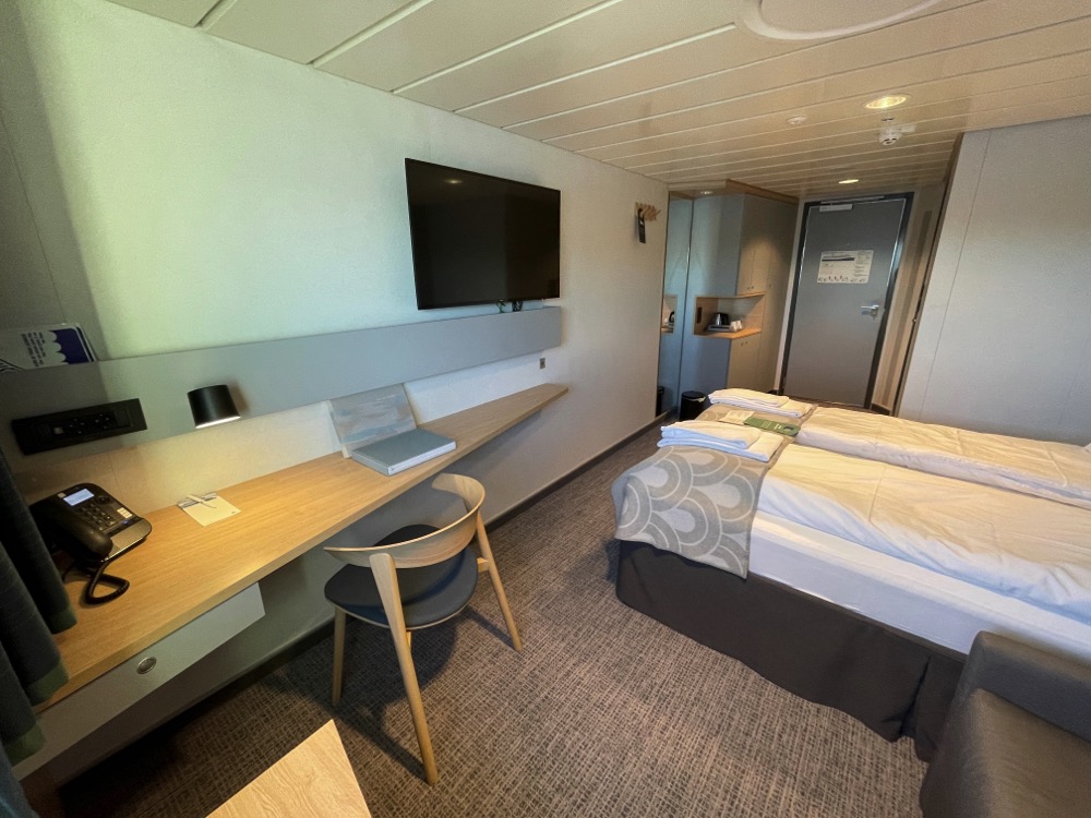 De hut van 15 m2 is uitgerust met badkamer, een bankje (ook te gebruiken voor 2 extra personen als sofabed), bureau, tv, waterkoker, koelkast en de gratis wifi. Wat mij vooral opviel in de mooie rustig ingerichte hutten, waren dat de kastdeuren allemaal een echt stevige sluiting hadden. Dat is echt niet voor niets omdat de wateren waarin het schip vaart, behoorlijk onstuimig kunnen zijn.