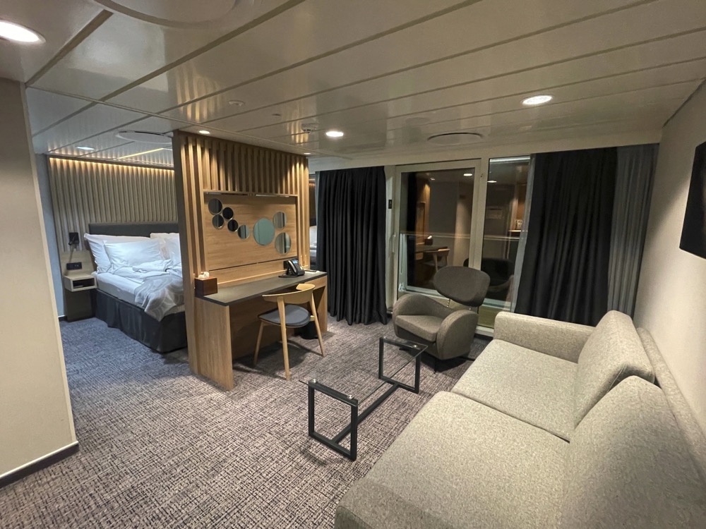 Doordat niet alle hutten bezet waren, heb ik later in de cruise een kijkje voor je kunnen nemen in een aantal van de suites. De juniorsuite is 22-25 m2 en heeft een afgescheiden woonkamer. Uiteraard heb je ook hier een balkon. Het verschil ten opzichte van de deluxe balkonhut zit in de extra faciliteiten: bijvoorbeeld een koffieapparaat, badjas en slippers, welkomstpakket en het Havila gold – pakket (meer keuzes bij ontbijt, lunch & diner, ontbijt in het fine dining restaurant). Ik mocht deze suite in de donkere uren even bewonderen, dit is nr.