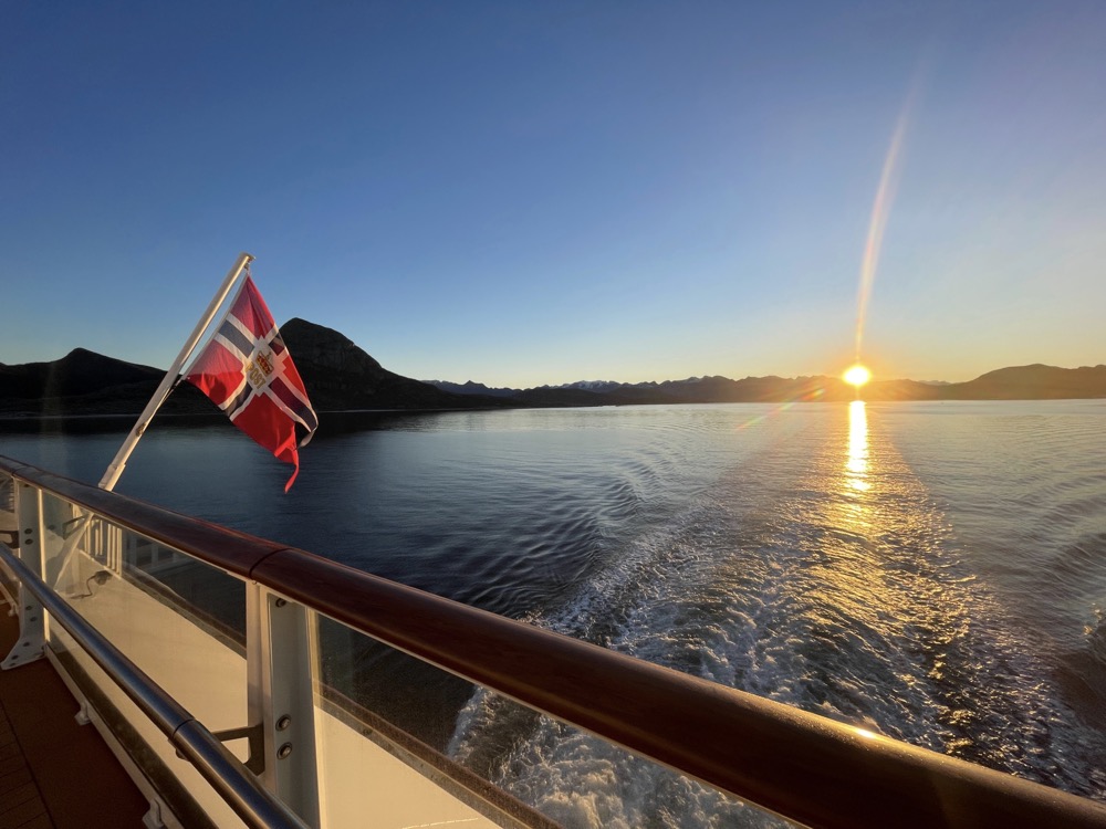 De mooiste plek vind ik zelf het achterdek, feitelijk op 2 dekken gelegen. Je hebt hier fantastische uitzichten met de vlag van de Noorse post.