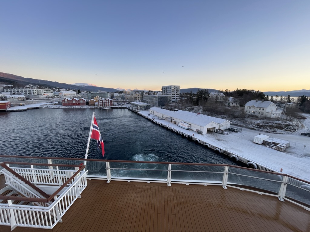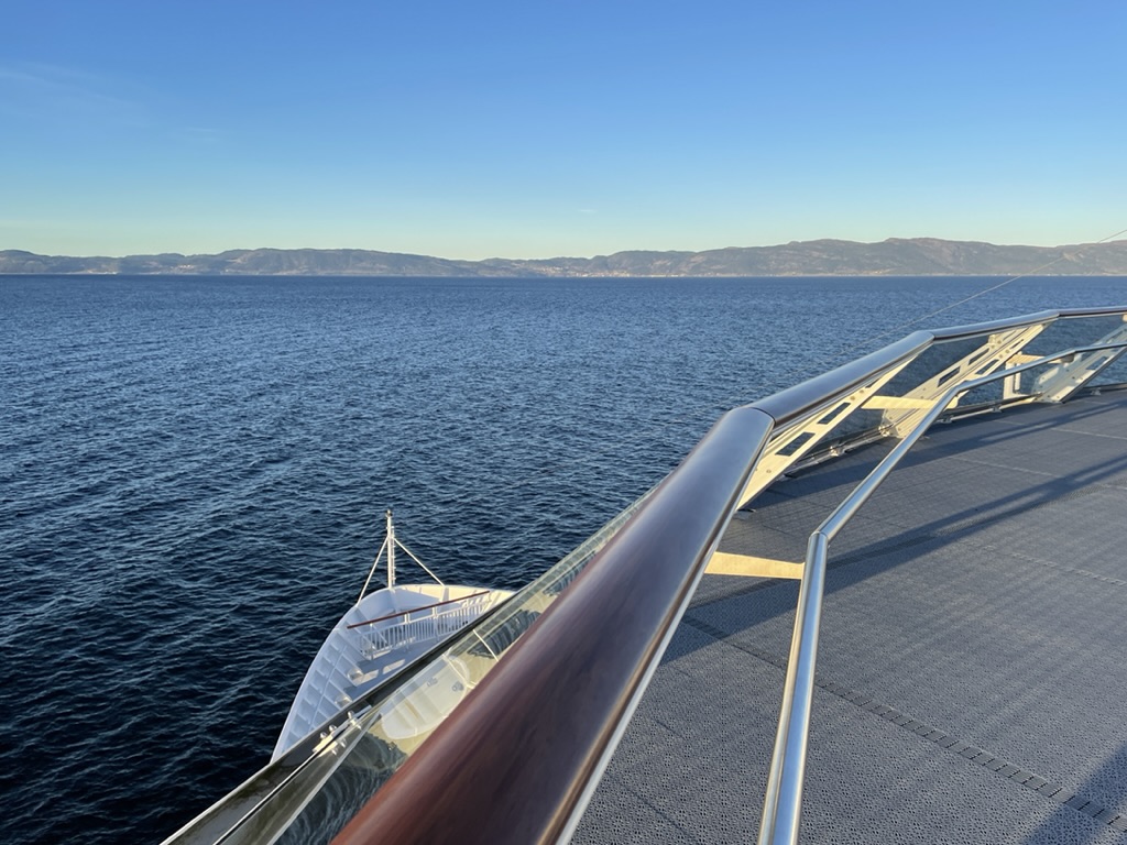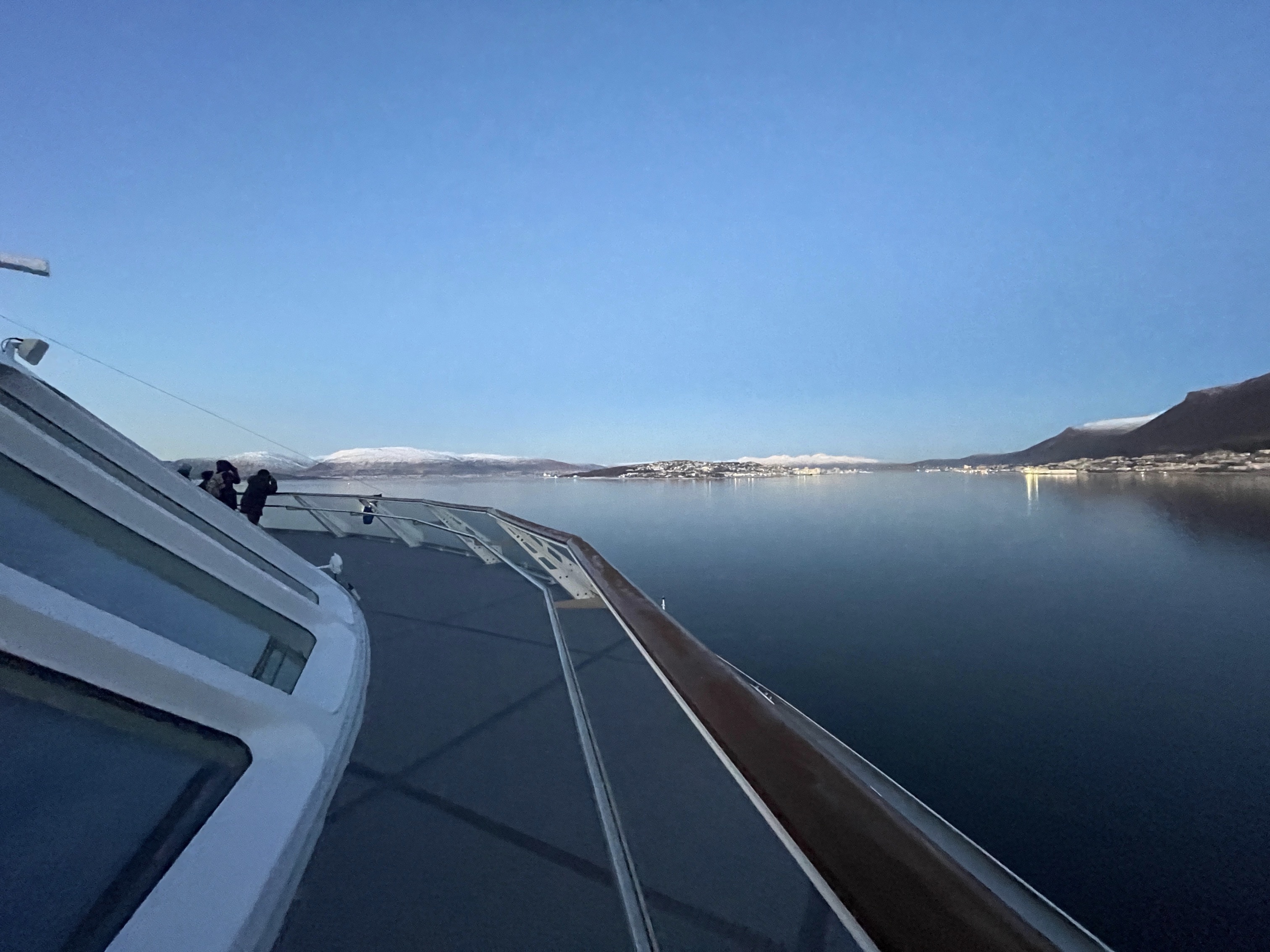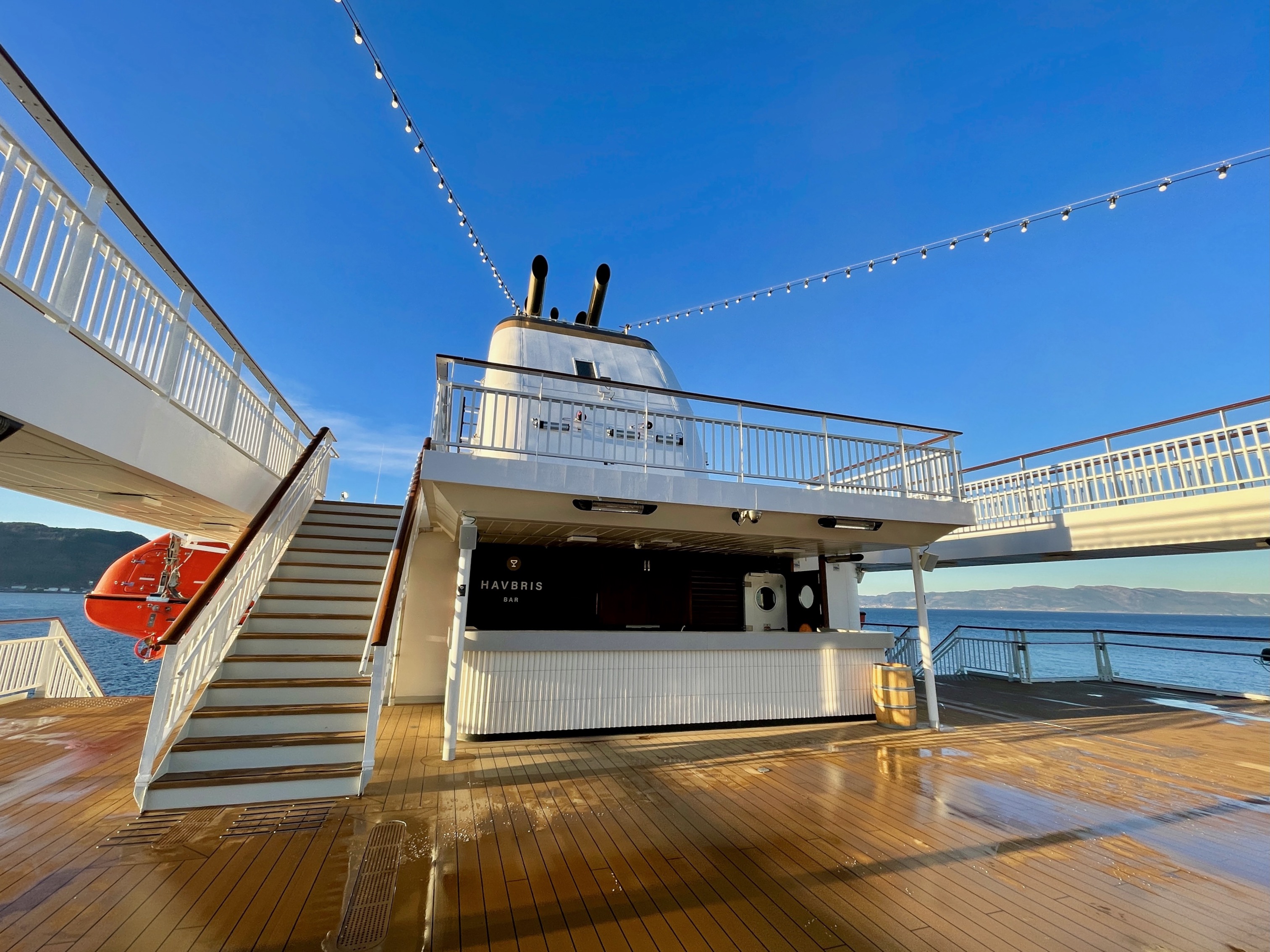 De Havila Capella heeft veel buitendekken, waar in de zomer ligbedden staan en in de winter onder de overkapping (met heaters!) stoelen. Hieronder zie je de voorboeg, waar je feitelijk bovenop de brug staat. Aan een van de zijden buiten, is een buiten rook plek.