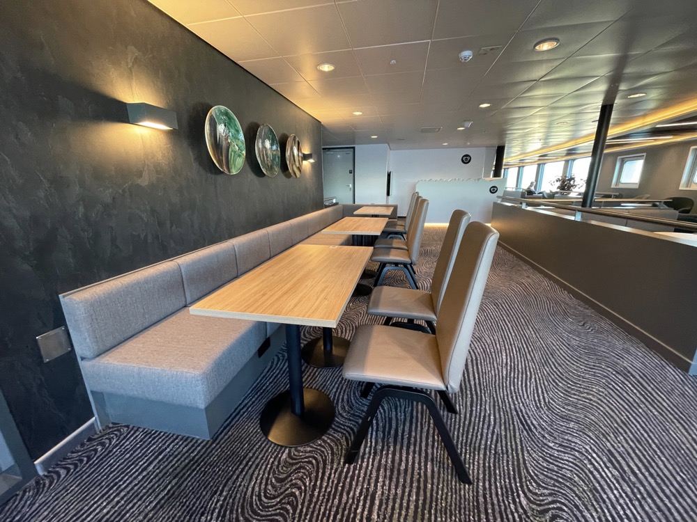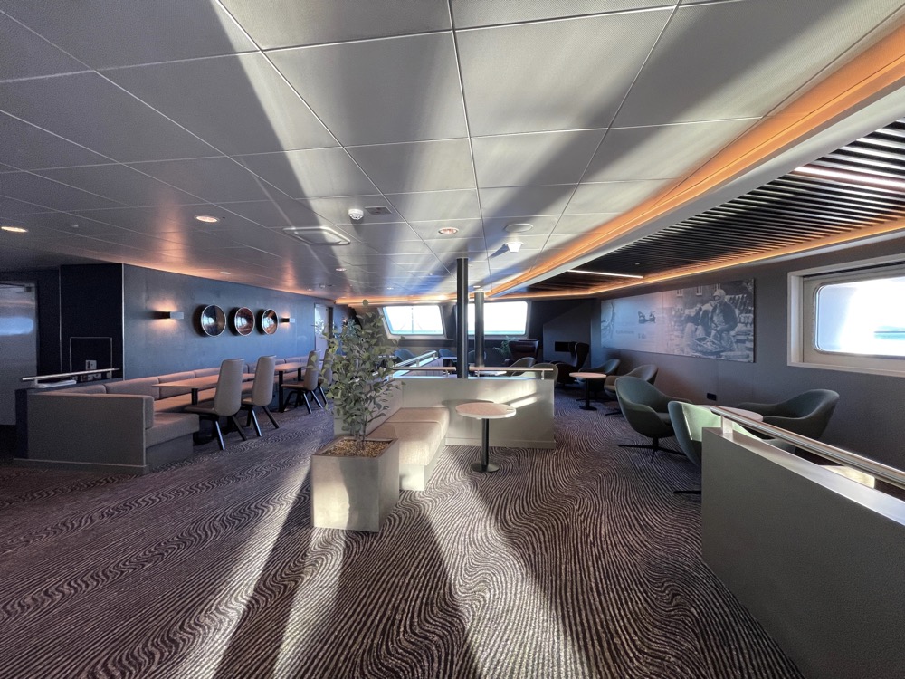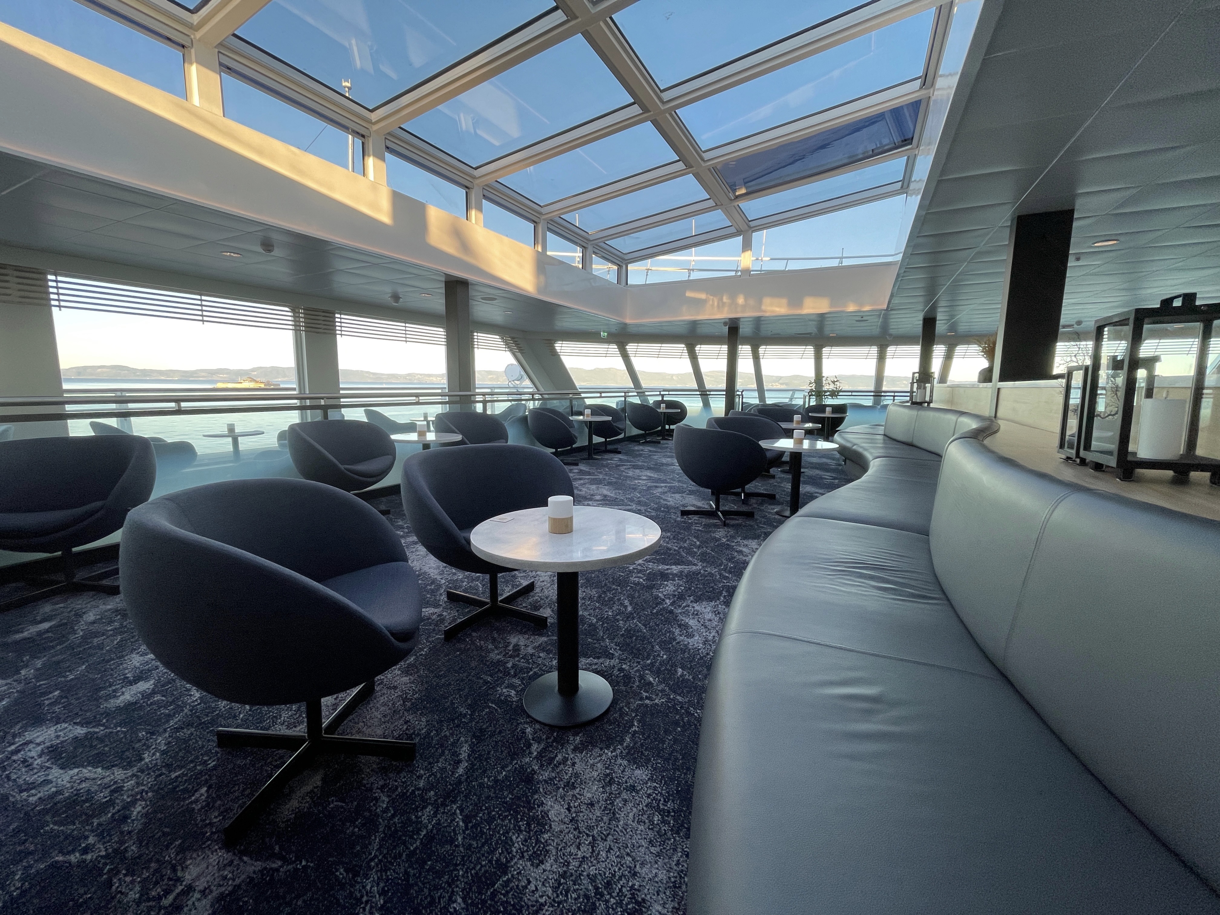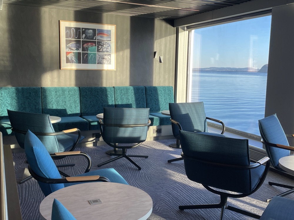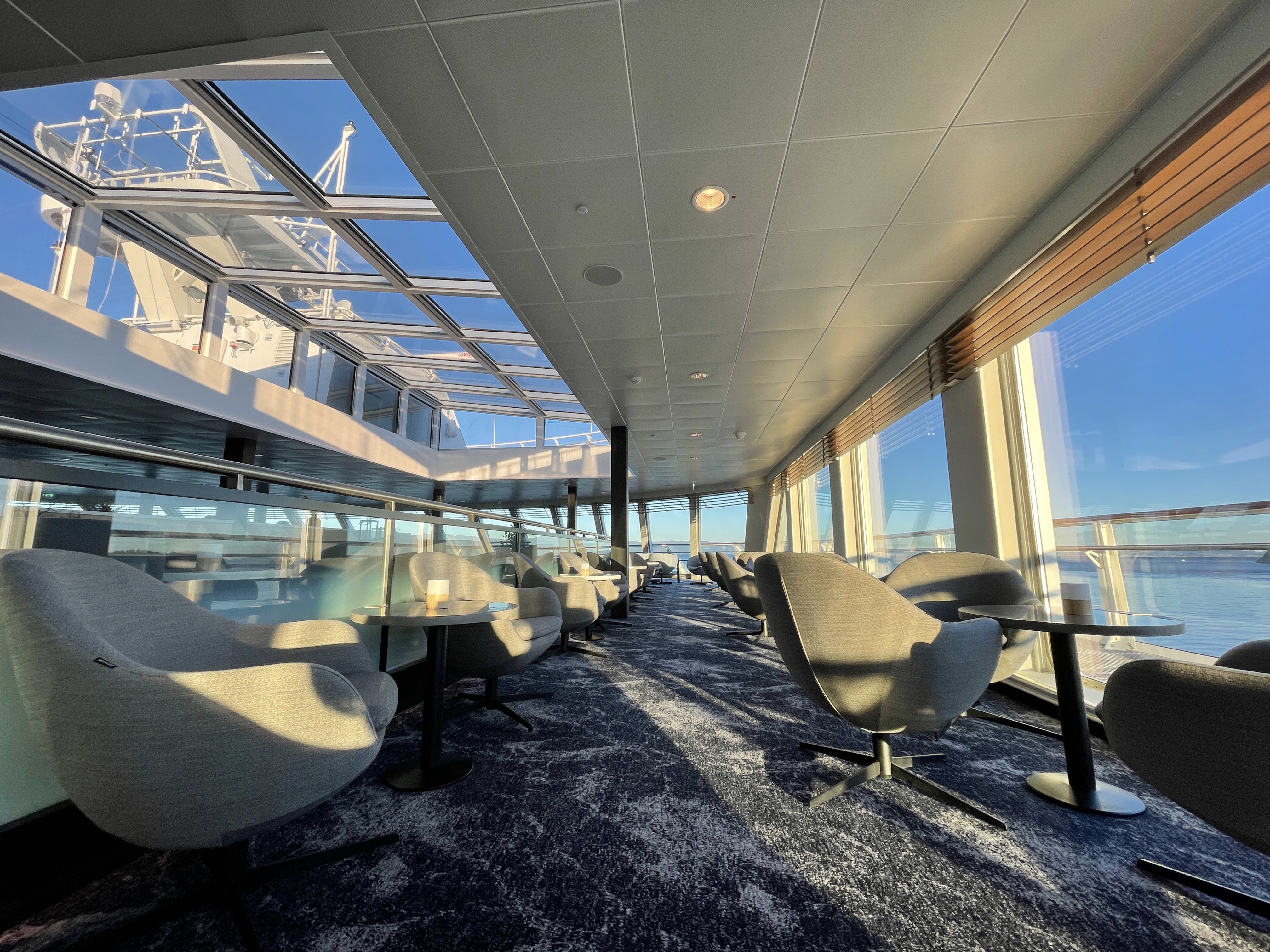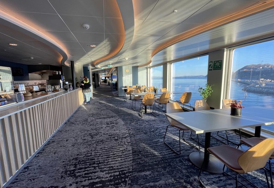 De populairste lounge ligt op dek 9: Havblikk. Met een fantastische panoramadak en veel ramen heb je hier het meest fantastische uitzicht, overdag maar zeker ook ’s avonds als je het Noorderlicht wilt zien. In de lounge bar haal je je drankjes.