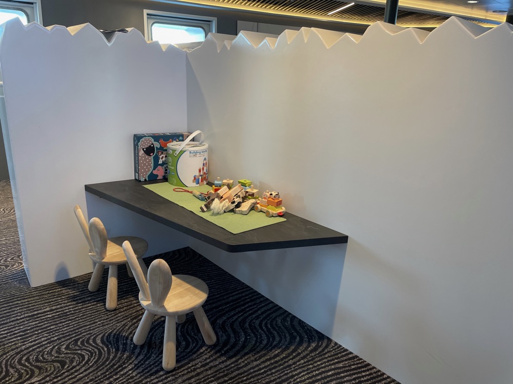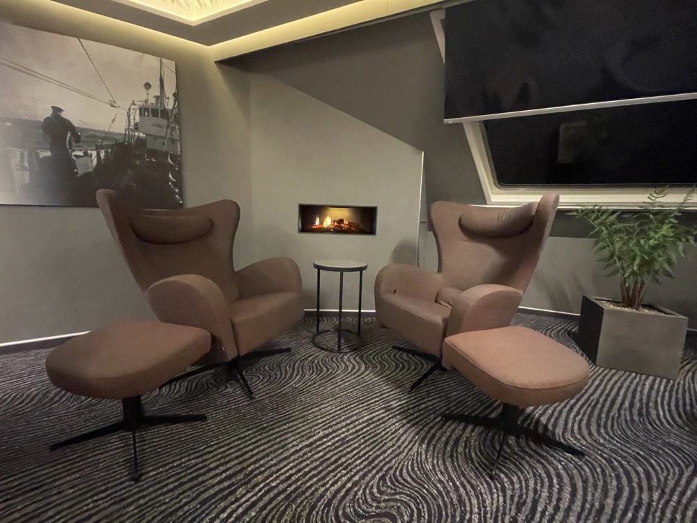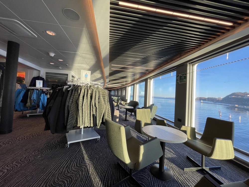 Geheel vooraan op dek 6 ligt de lounge die niet zo heel veel gebruikt wordt, waarschijnlijk omdat je hier niet zoveel ramen met prachtig uitzicht hebt. Een gezellig (nep) haardvuur is dan wel weer een zeer aardige plek om te zitten. Wat kleinere kinderen hebben bovendien hier een speelplek en zijn er in deze lounge boeken (je kunt ze ook achterlaten voor toekomstige passagiers). In de winkel daarnaast zijn veel Noorse outdoorproducten en kleding van Havila te vinden. Wil je bovendien een excursie boeken, dan doe je dat hier bij het expeditieteam.