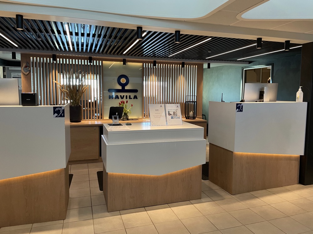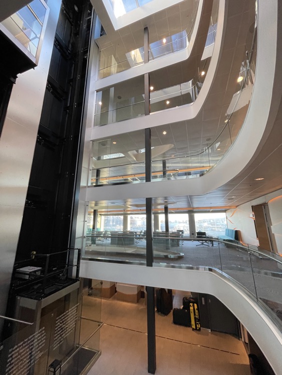 Via de voorste ingang aan bakboord, in vaartrichting links, loop je aan boord via de trappen. Voor mindervaliden is ook een stoeltjeslift beschikbaar. De binnenkomst mag er zijn aan boord: het grote atrium gaat van dek 4 tot aan het glazen dak op dek 9. Je boordpas wordt gescand en de receptie is dichtbij voor het inchecken. De dames van Havila staan daar dag en nacht voor je paraat; uiteraard ook voor de lokale passagiers die soms midden in de nacht aan boord komen. Rondom het atrium vind je op elk dek veel zitplaatsen om te genieten van het uitzicht.