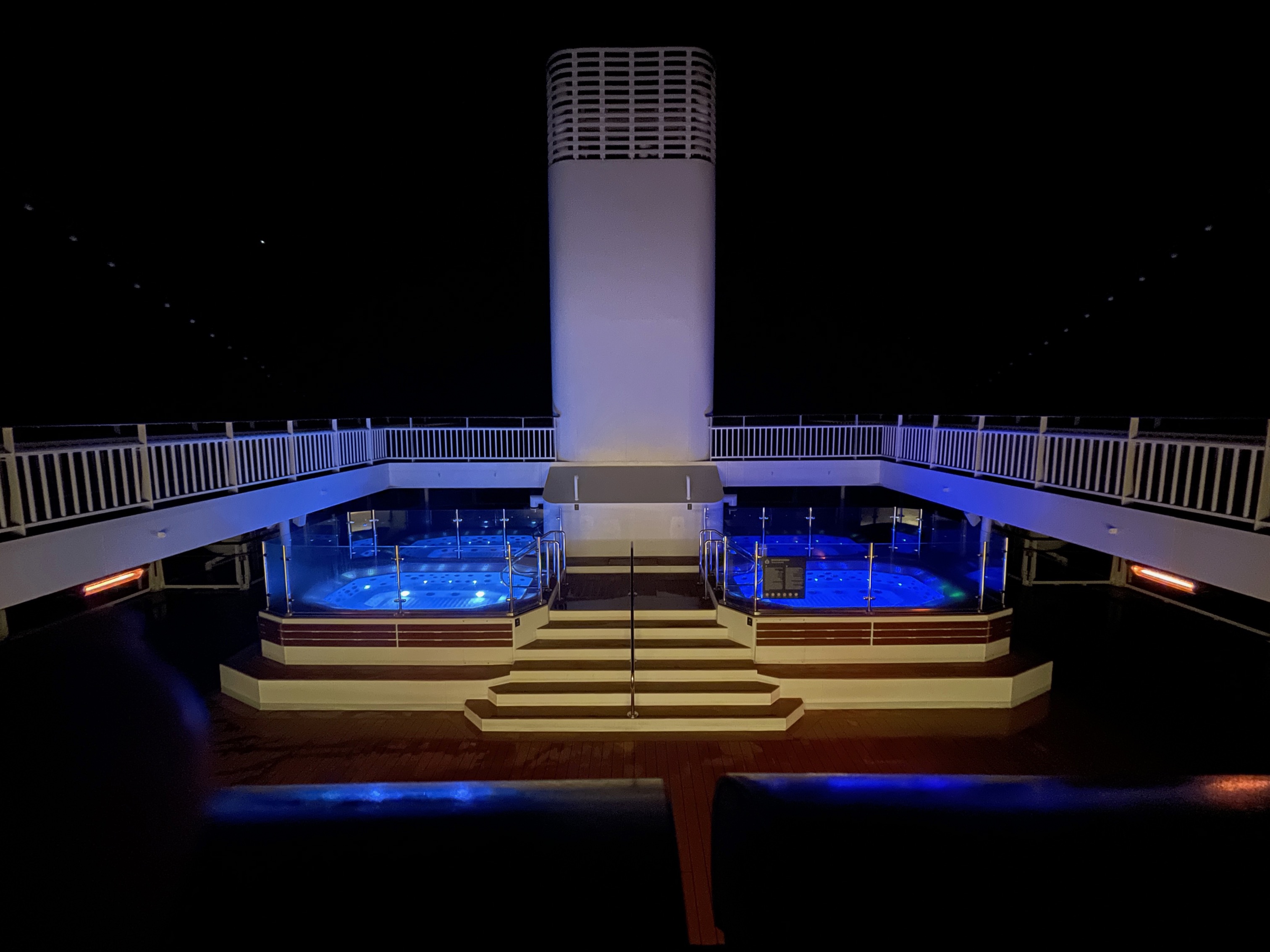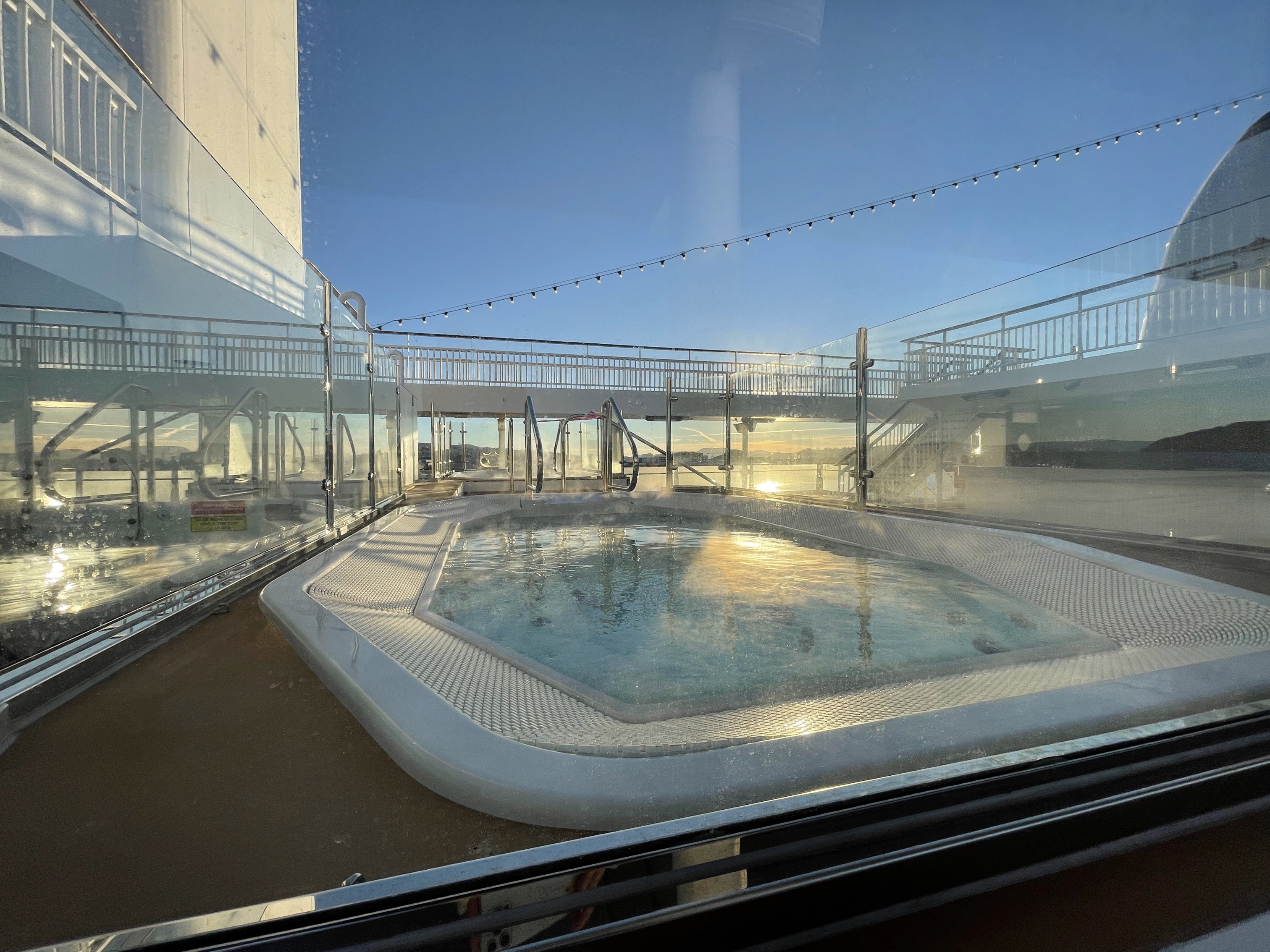 Heerlijk om op te warmen zijn de twee whirlpools aan boord. In de winter zie je dat deze door de gasten wordt gebruikt die net in de nabij gelegen sauna’s zijn geweest. De schoorsteen achter de whirlpools is overigens van de LNG motor, ofwel nauwelijks uitstoot.