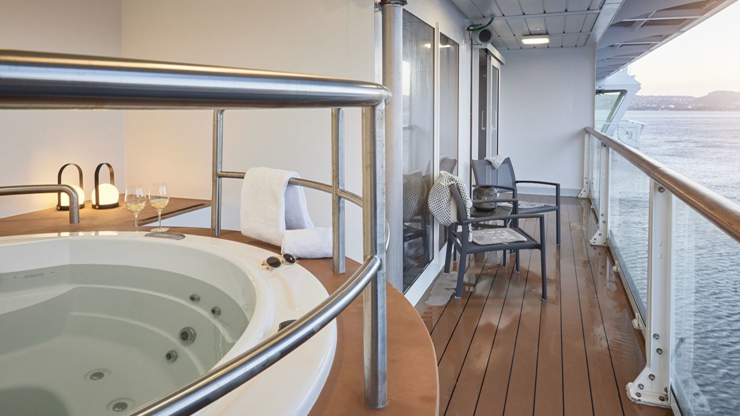De Lighthouse suites omvatten als extra een whirlpool op het balkon. Uiteraard ontvang je ook bij deze suite het Havila Gold-pakket, maar ook onder andere een gevulde minibar die dagelijks wordt bijgevuld. Hieronder zie je één van de de meest luxueuze suites aan boord: