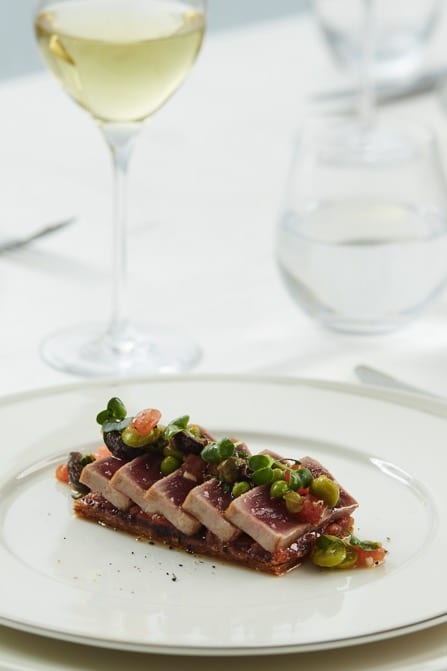 5. Fil Rouge biedt Frans geïnspireerde internationale gerechten in een intieme ambiance. Het decor heeft zeshoekige vormen die contrasteren met witte muren, een eerbetoon aan tijdloze elegantie in zijn puurste vorm.