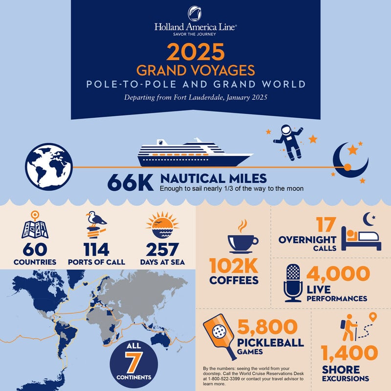 De Grand Voyage: Pole-to-Pole aan boord van Volendam stelt cruisereizigers in staat om vijf continenten te bezoeken op een reis die van zuid naar noord reist, terwijl de Grand World Voyage aan boord van Zuiderdam zes continenten bestrijkt op een oost-naar-west route. Beide starten in van Fort Lauderdale, Florida.