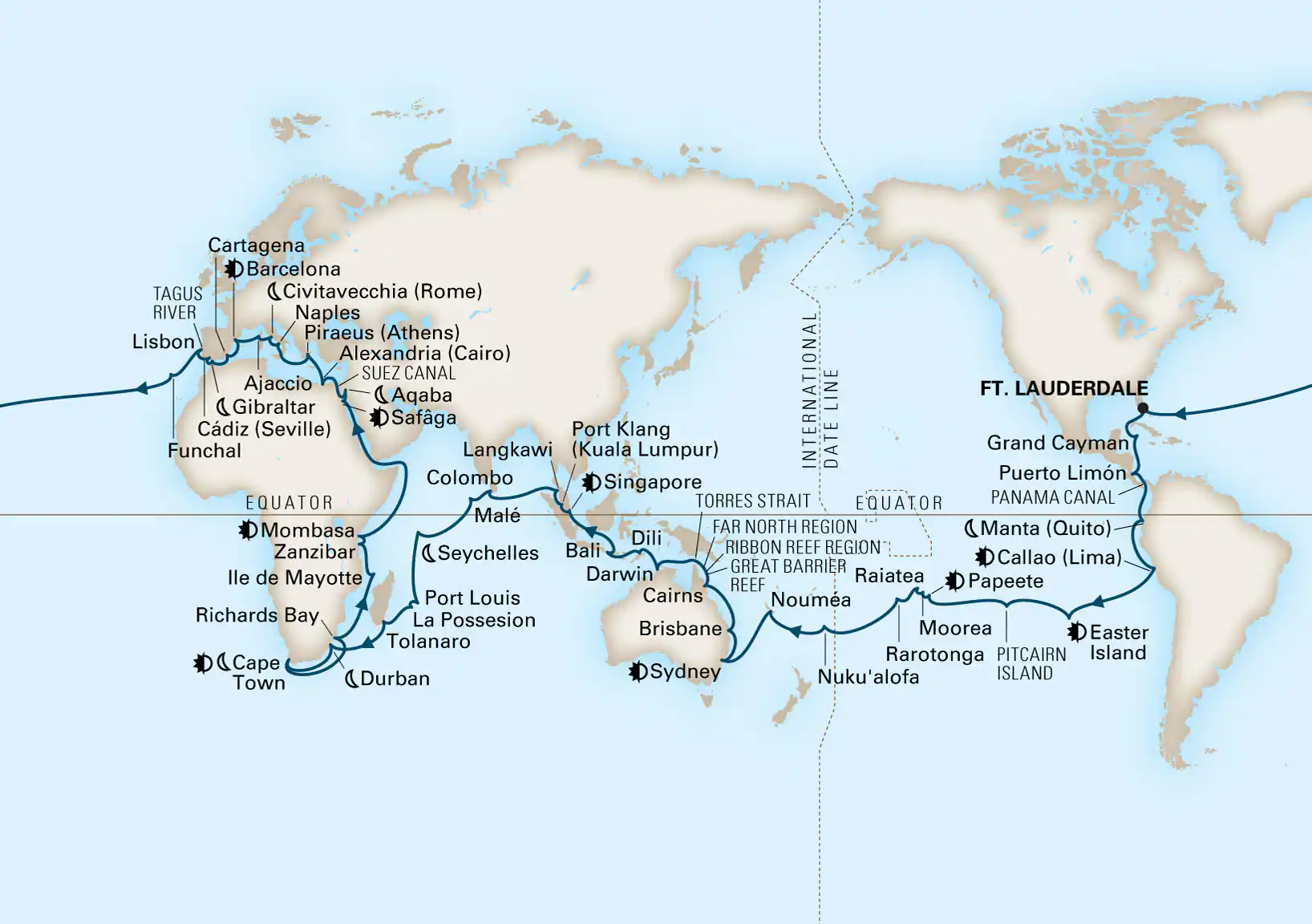 het Panamakanaal om door te gaan naar Paaseiland alvorens de Stille Zuidzee over te steken naar Australië. Je verkent het Great Barrier Reef op weg naar Indonesië en Sri Lanka. Daarna gaat het vervolgens zuidwaarts naar Kaapstad, Zuid-Afrika, via de Seychellen, terug omhoog langs de oostkust van Afrika. Je gaat door het Suezkanaal naar Portugal voordat de Zuiderdam de Atlantische Oceaan oversteekt.