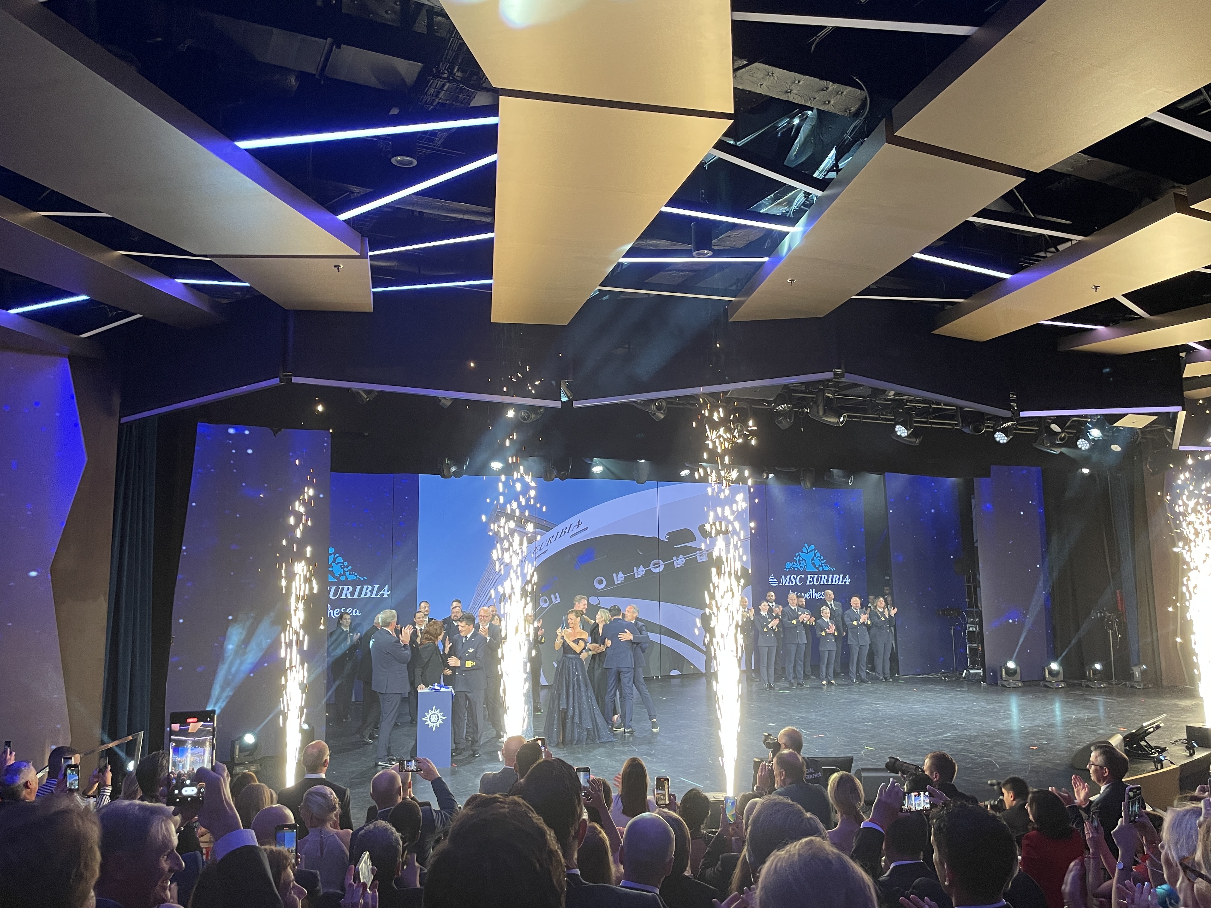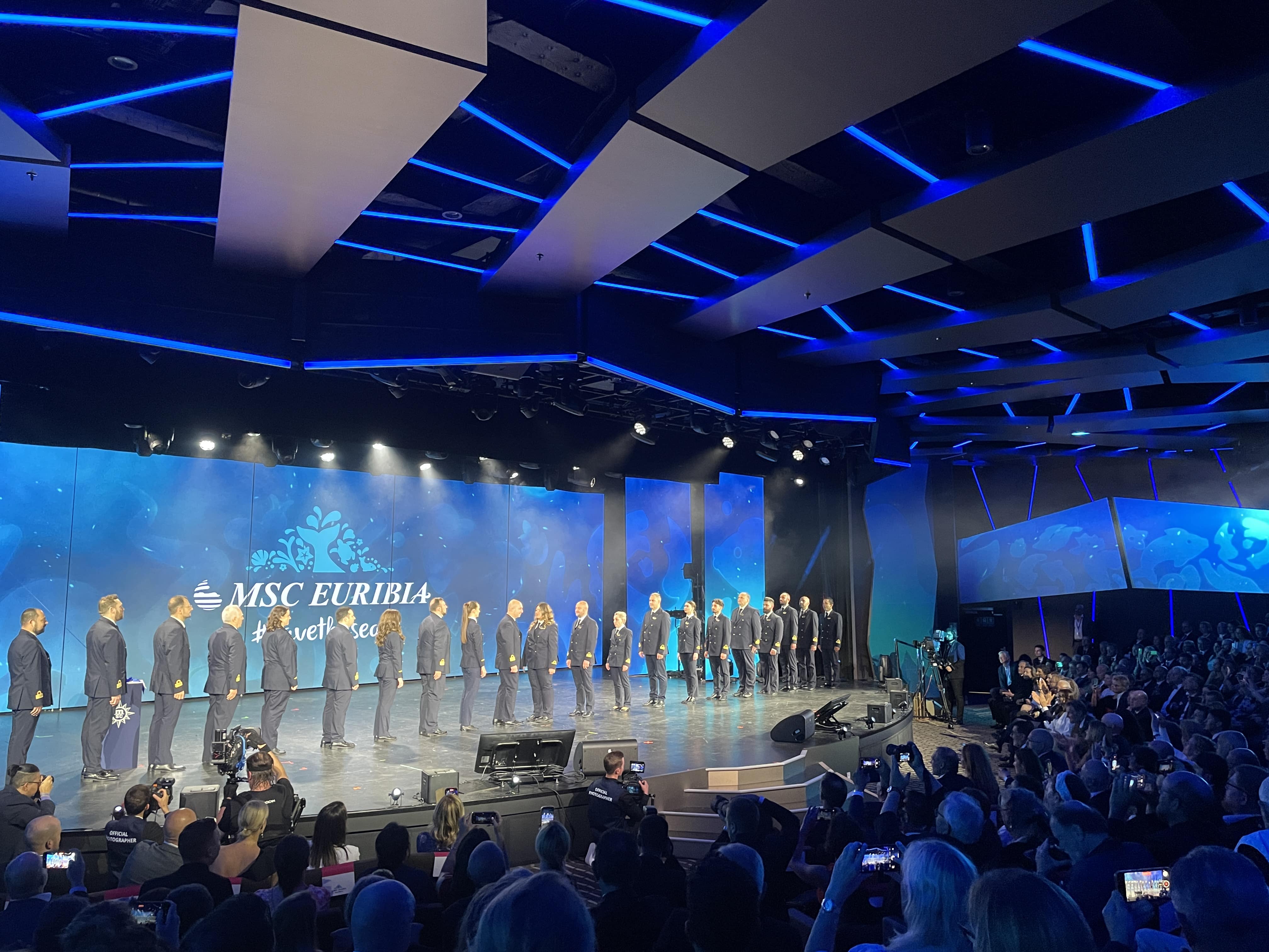 Traditie was de officiersparade, met alle officieren van de MSC Euribia die het podium opgelopen kwamen. Doopmoeder van de vloot van MSC Cruises, Sophia Loren, kwam vervolgens op het podium met kapitein Stefano Battinelli. Na een emotioneel welkom en aftelmoment, knipte zij het blauwe lint door waarna buiten een champagnefles tegen de boeg brak. Met vuurwerk op het podium werd de ceremonie in het Delphi theater afgesloten.