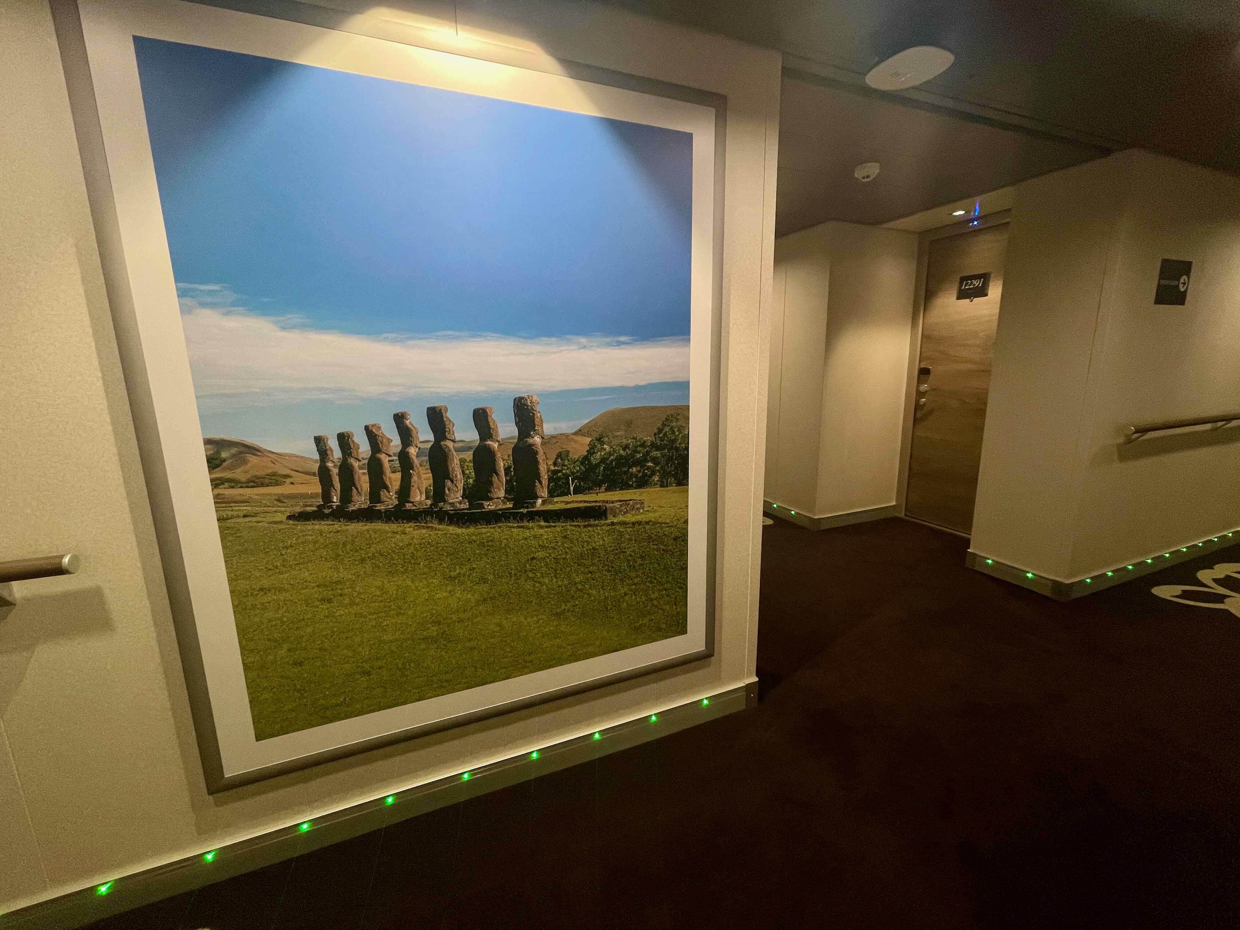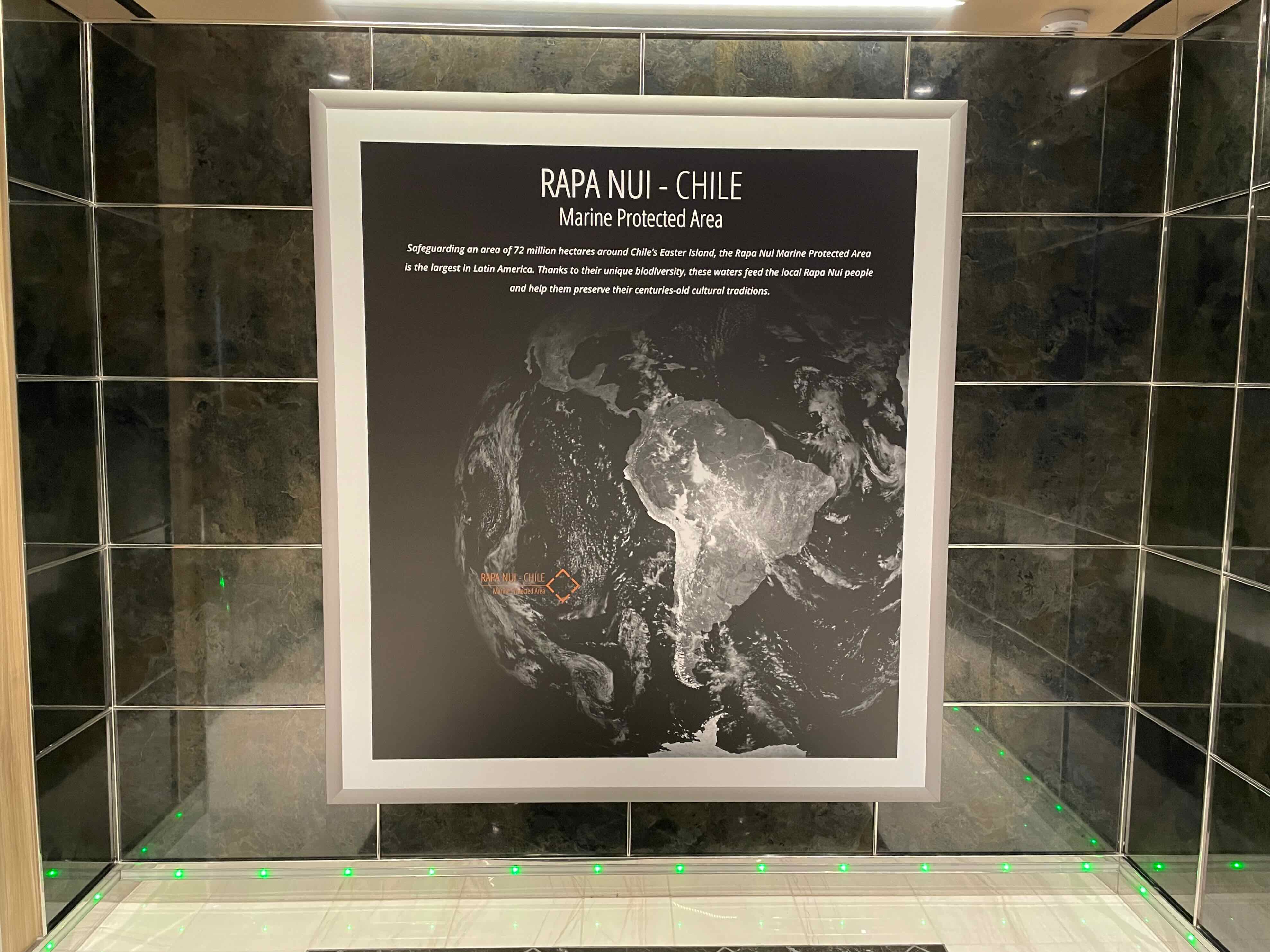 Aan boord van MSC Euribia staat het zeeleven en duurzaamheid centraal. Zo zijn alle dekken vernoemd naar natuurgebieden die een UNESCO werelderfgoed zijn, zoals Elbe, Cinque Terre, Rapa Nui of Galapagos. Je vindt op elk dek een toelichting bij de liften over het betreffende gebied. De kunstwerken op dat dek tonen dat gebied. Ik zat op dek 12, waar Rapa Nui de hoofdrol speelde, oftewel Paaseiland!