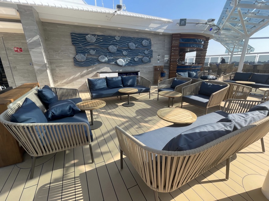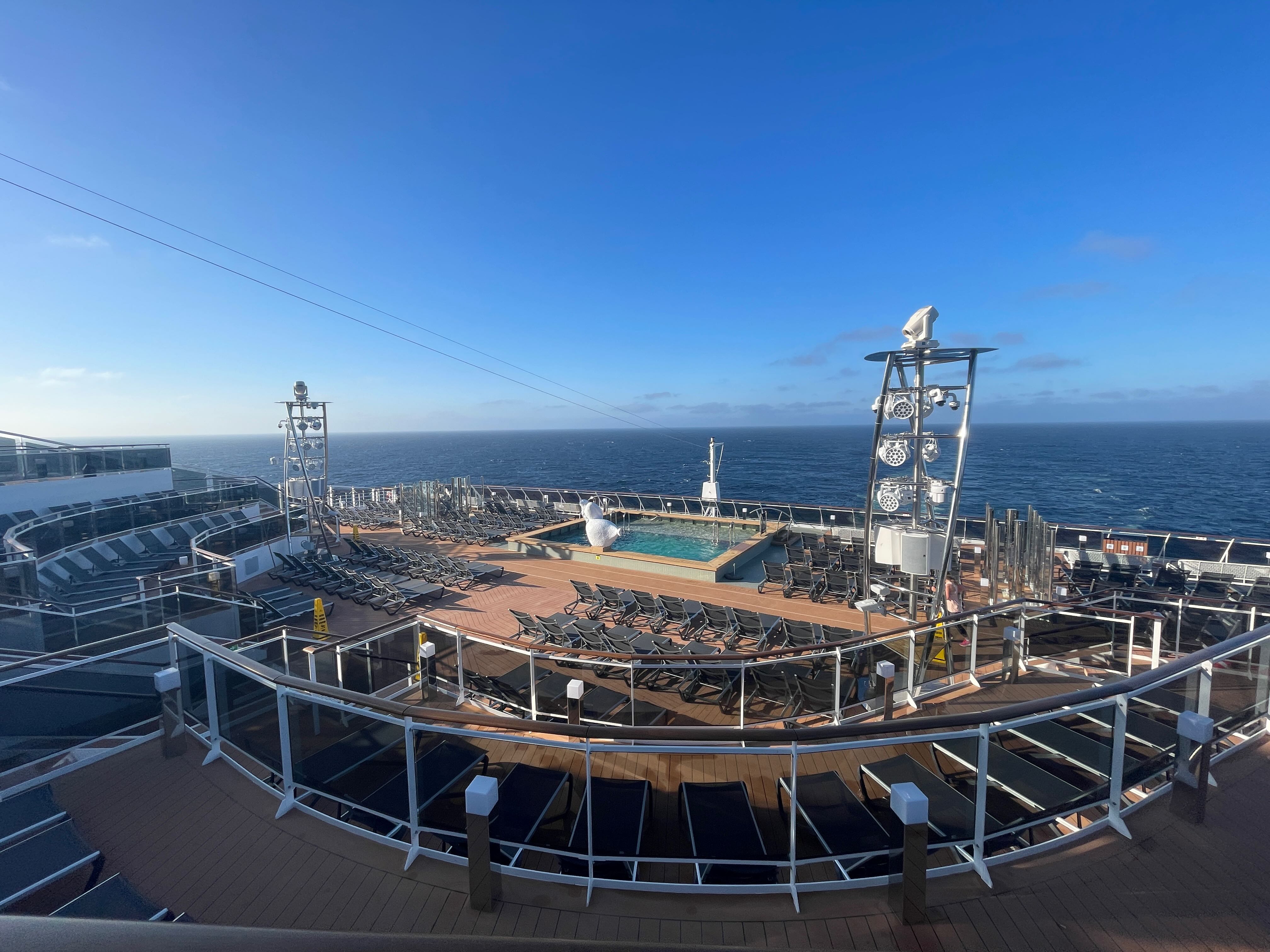 Het middenzwembad is de plek waar je moet zijn voor de muziek en entertainment. Een podium met tv scherm, een bar en een counter voor hamburgers en ander fastfood zijn hier ook gelegen. Aan stuurboord en bakboord liggen zeer mooie lange bubbelbaden.