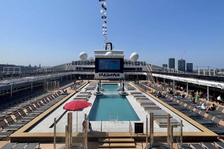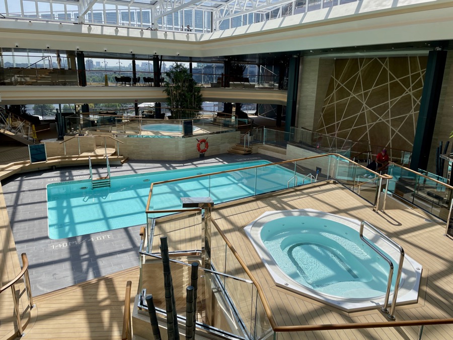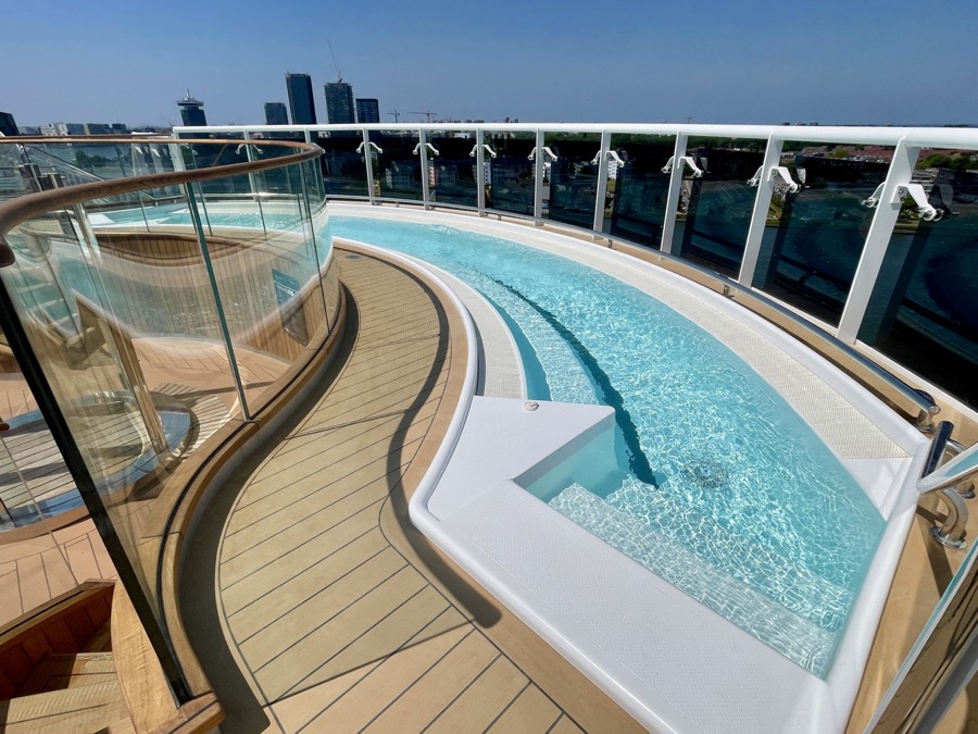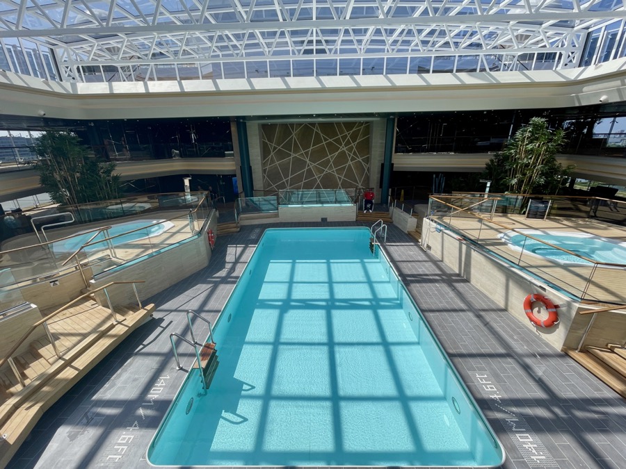 Loop je verder naar voren op het schip, dan kom je bij het binnenzwembad met een schuifdak dat geopend kan worden.
