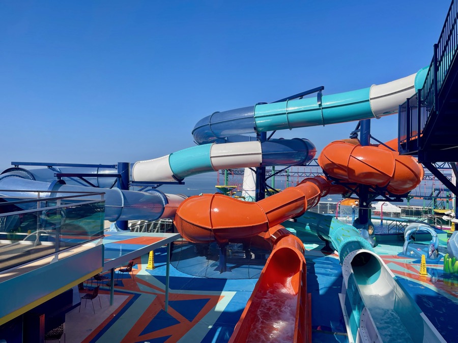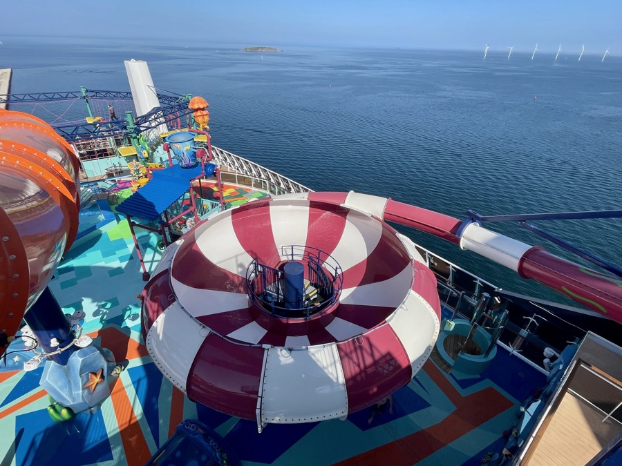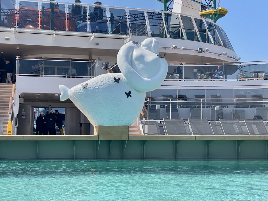 Ik loop ze allemaal even langs: op het achterdek (16) staat een zeemeermin aan de rand van het zwembad. Dit is een vrij rustig zwembad, met daar dichtbij het Aquapark voor de kinderen. Er zijn drie glijbanen (met personeel erbij) en tal van waterspelen.