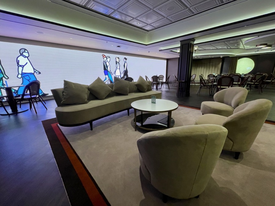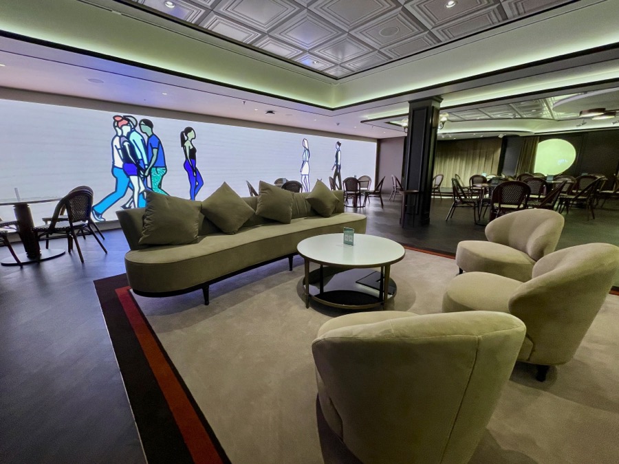 De Carousel lounge is een speciaal ontworpen theater en lounge ineen. Deze ligt op een prachtige locatie: aan de achterkant van het schip waar je dan ook een mooi uitzicht op hebt. Overdag is de bar open, en bij je drankje kan je een hapje uitzoeken. In de ochtend een licht ontbijt, en later op de dag taartjes.