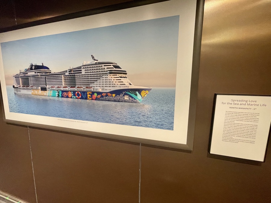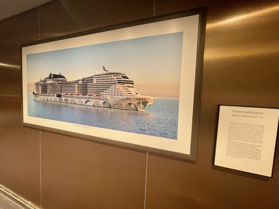Wat je zeker ook niet mag missen is een kleine tentoonstelling over de wedstrijd die MSC heeft uitgeschreven voor de boegbeschildering. De Duitse kunstenaar Flämig won uiteindelijk, maar de 5 die een eervolle vermelding kregen, hangen in een tentoonstelling.