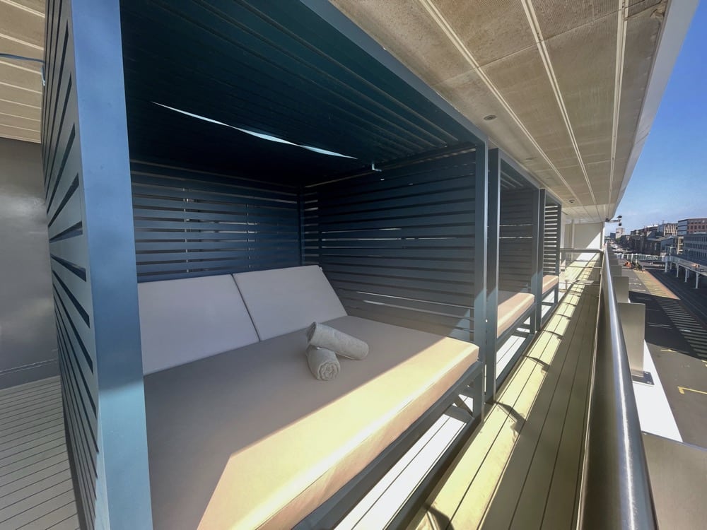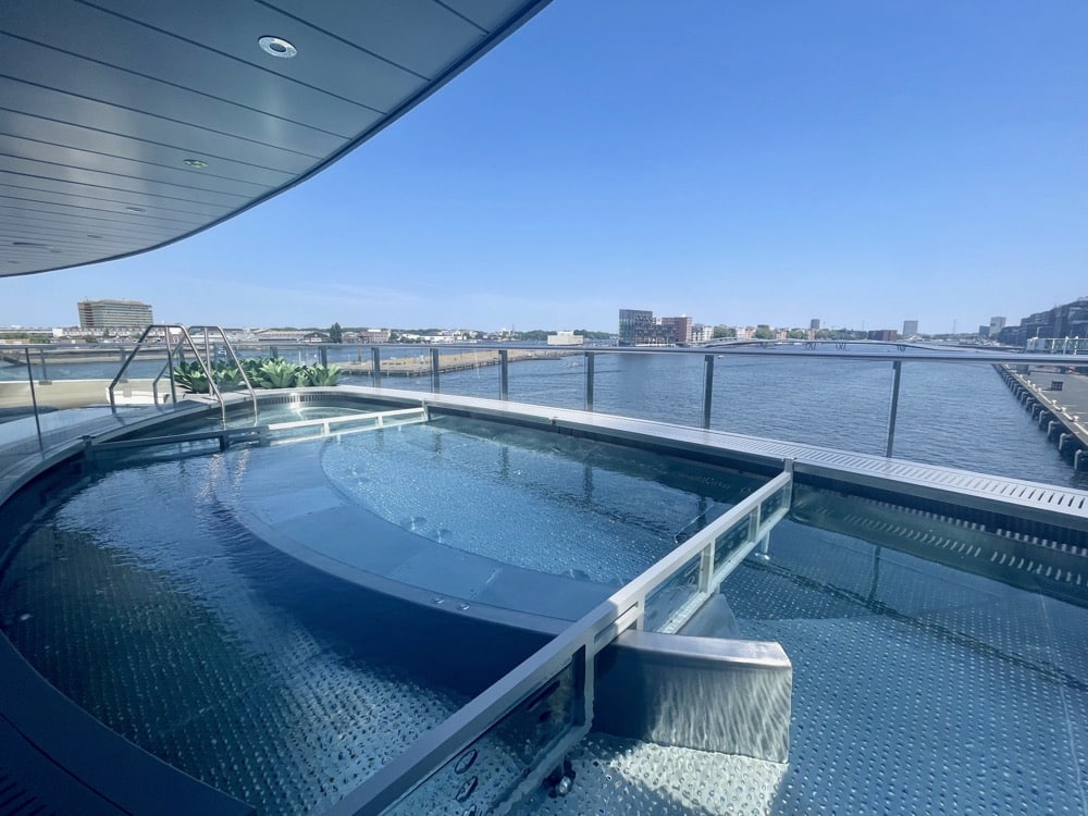 De Scenic Eclipse II heeft een klein aantal verbeteringen waaronder het fijnste, het zwembad, gelegen op het allerhoogste dek 1o. De overdekte Skybar, is heel fijn als het wat kouder weer is in bijvoorbeeld de poolgebieden. Bij mooi weer geniet je van de vele zitjes, fantastische ligmatrassen met fabuleus uitzicht en kun je in het water een drankje nuttigen. Zoals het bij een jacht hoort :-). De cabanas aan de beide zijkanten kun je gebruiken om al liggend van het uitzicht te genieten, heel fijn gelegen bij het zwembad en de Sky bar. Overigens heeft zusterschip Scenic Eclipse I alleen whirlpools op deze plek en geen zwembad. Wat overigens meteen opvalt in het water zijn een soort rekken met gaten: zij dienen ervoor om bij ruw weer, het water in het bad te houden.
