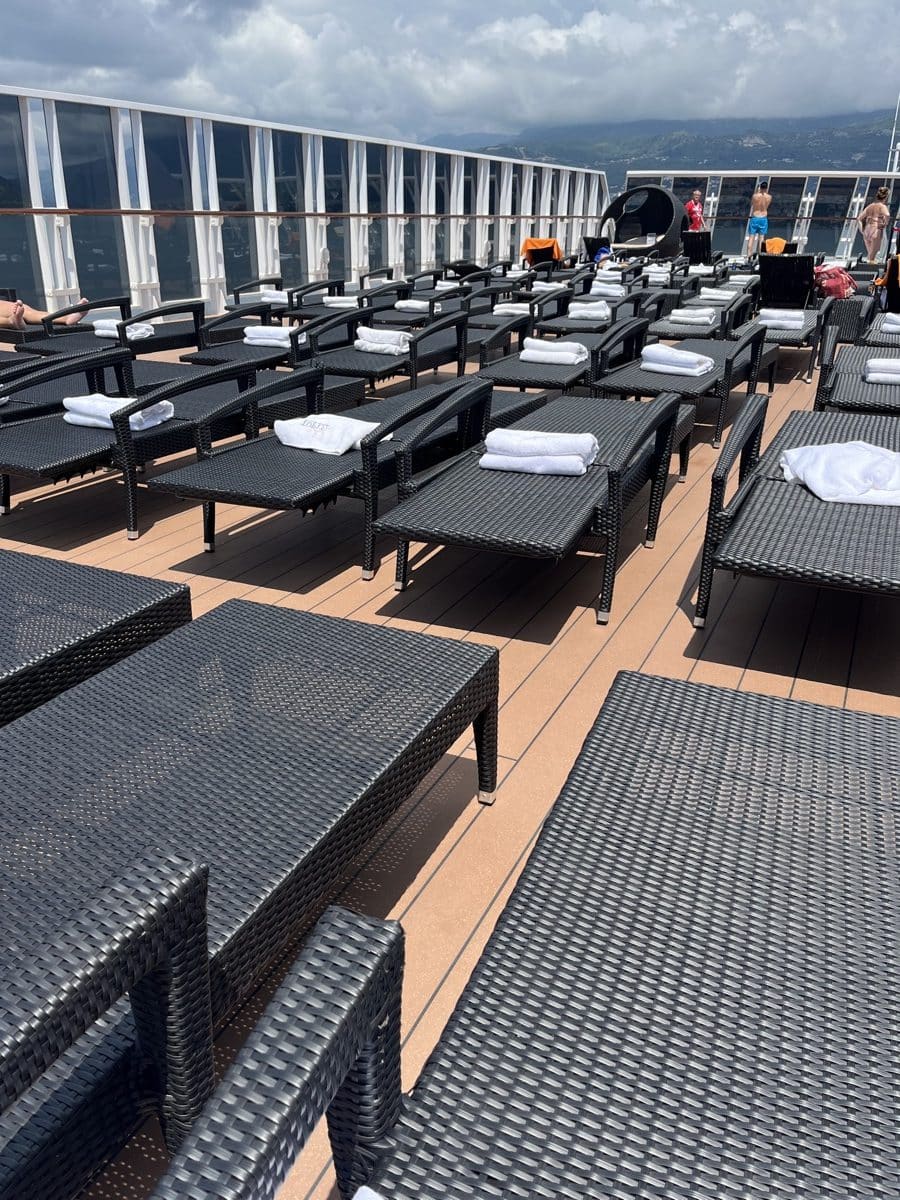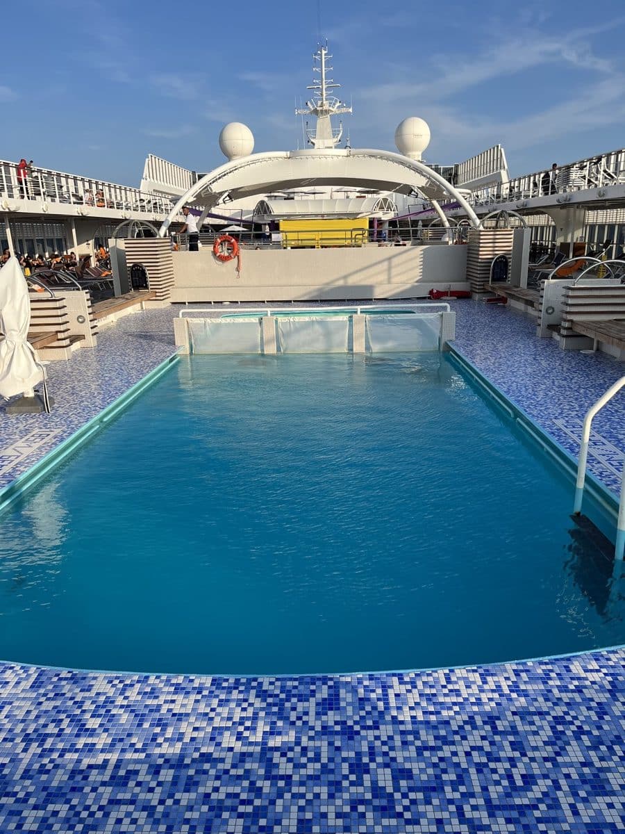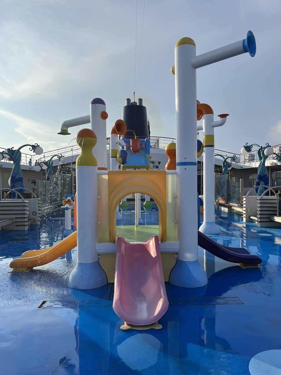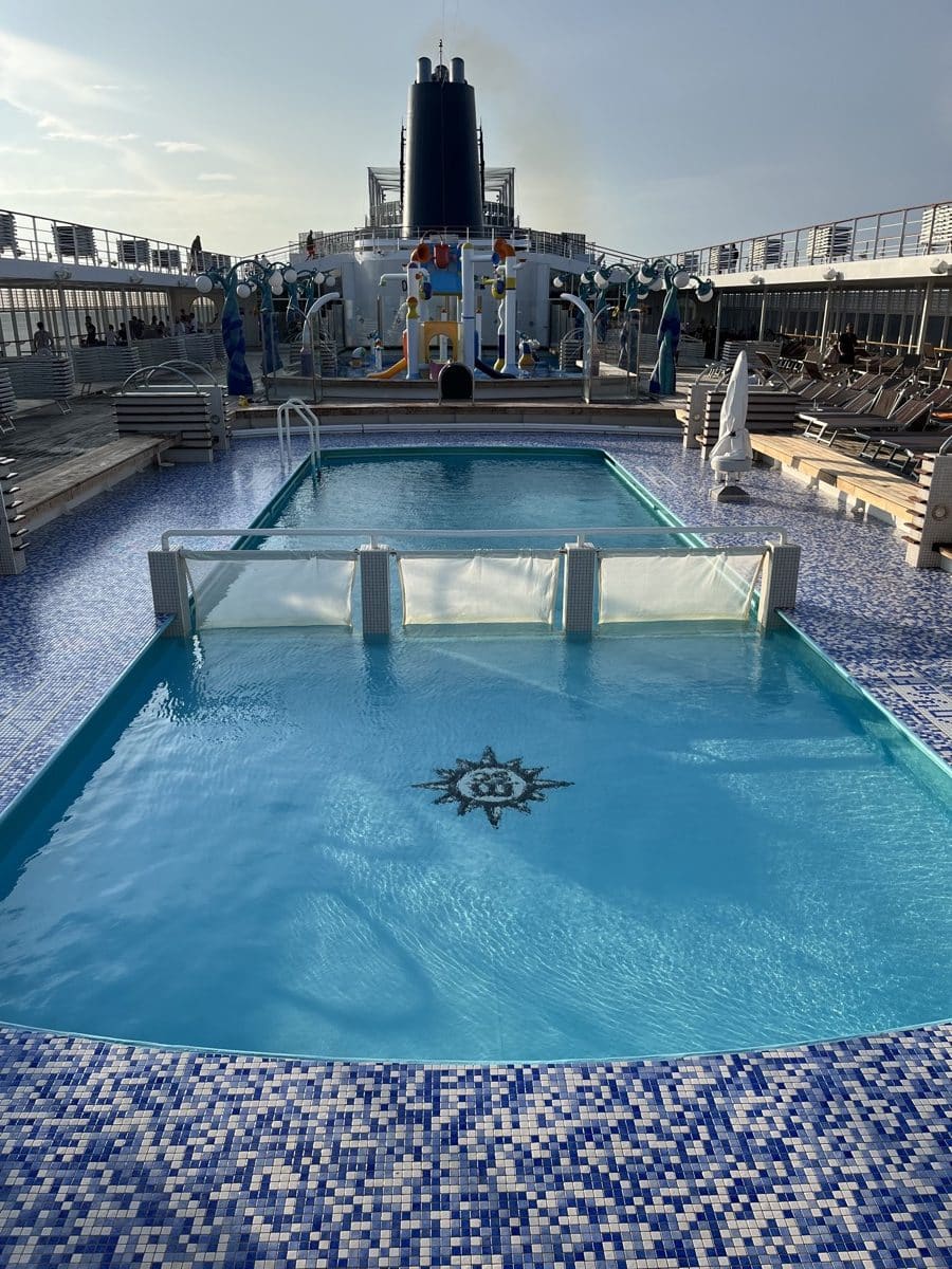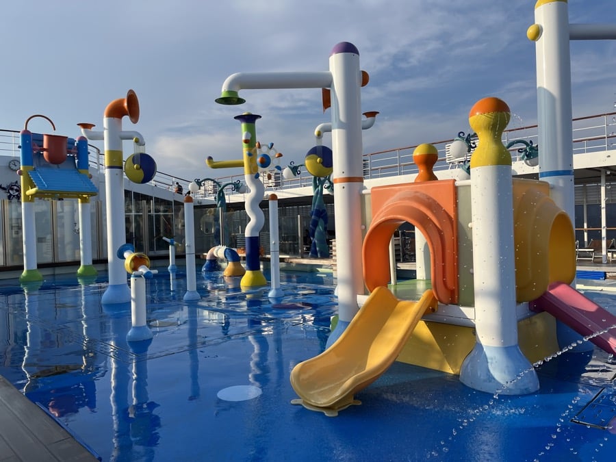 Op deck 11 bevinden zich 2 zout water zwembaden, 2 whirlpools en een kinderbad, volop fonteinen en emmers (het spray park). Dit bad is eigenlijk voor kinderen, maar volwassenen genieten er ook ter verkoeling 😊 Lifeguards houden de boel goed in de gaten. Wees er vroeg bij, want de bedjes zijn snel vol op de zeedagen. Gelukkig is er op het Aurea deck op deck 13 veel ruimte met bedjes.