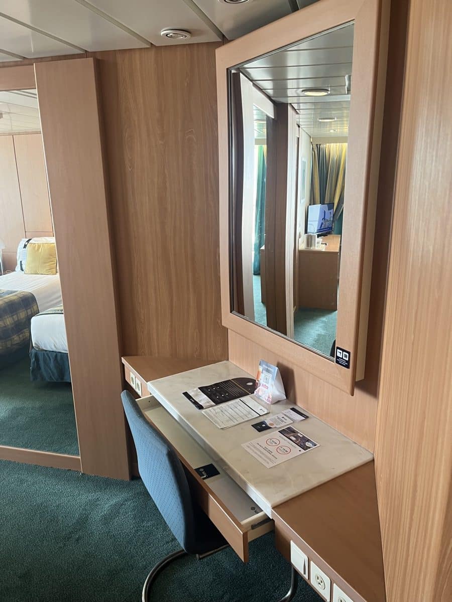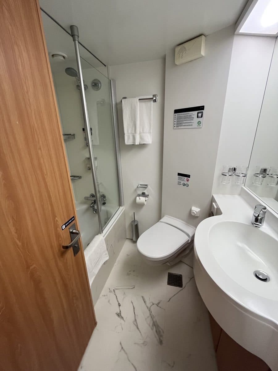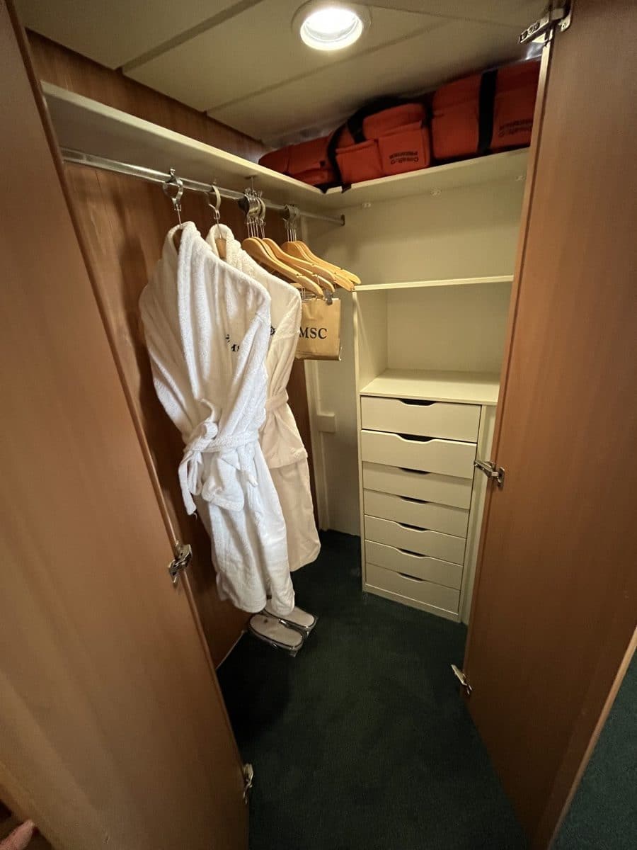 De suite op MSC Armonia is ruim, heeft veel kastruimte (met een inloopkast) waar we onze leuke jurkjes voor de thema avonden goed kwijt kunnen. Ook de badkamer is ruim, met bad, waar je ook in doucht.