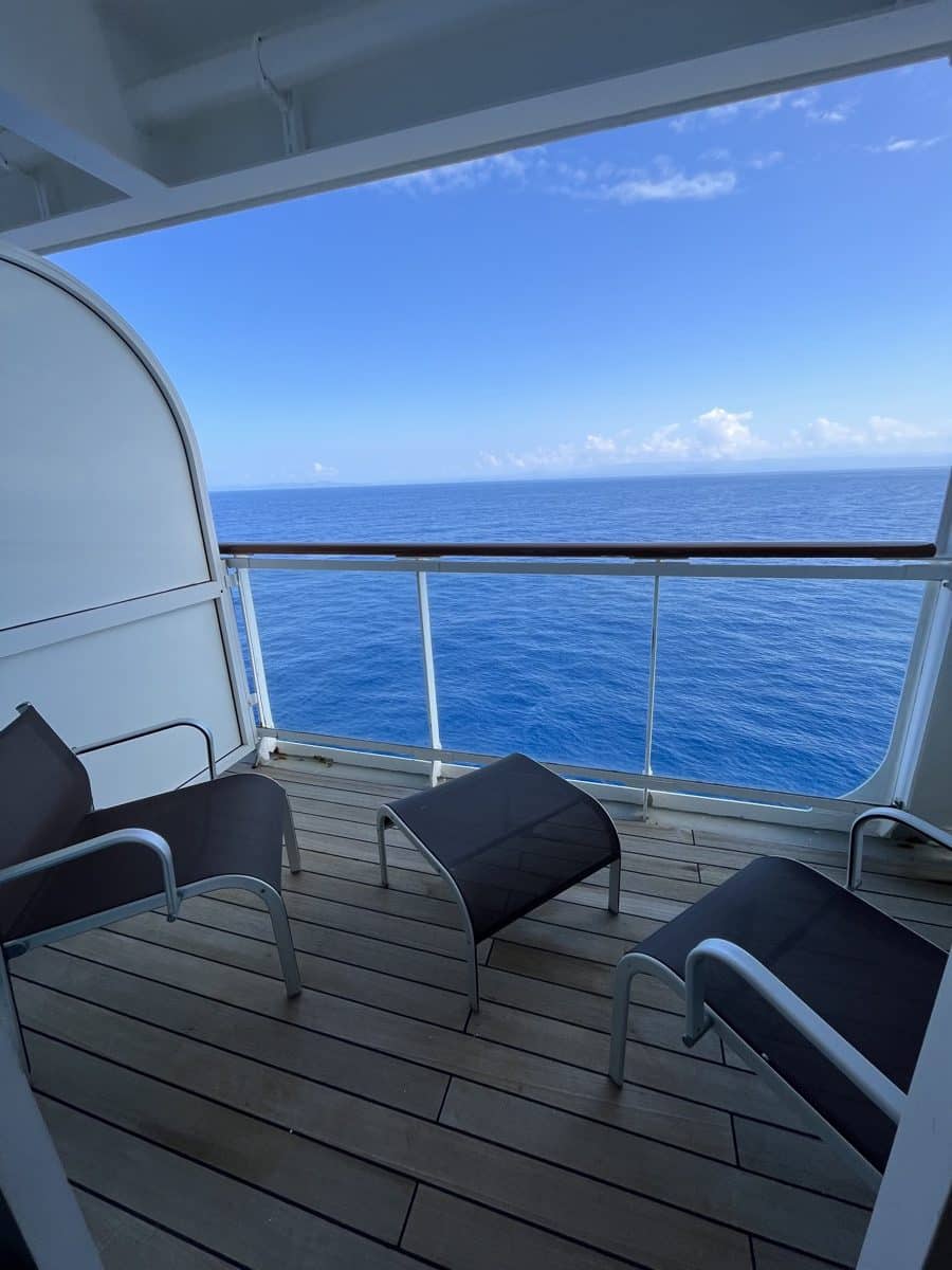 De suite oogt extra groot uit door de grote spiegels tegenover de bedden. Op het balkon is het heerlijk vertoeven met 2 stoelen en een tafeltje. Her en der zijn wel wat gebruikssporen te zien, maar hier stoor ik me niet aan. Deze suite van 22 m2 (en een balkon van 5 m2) is beschikbaar vanaf ongeveer €1600 per persoon voor een week.