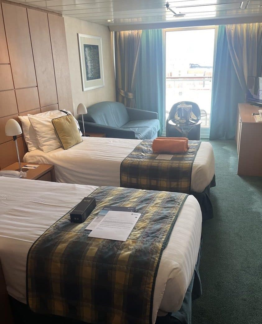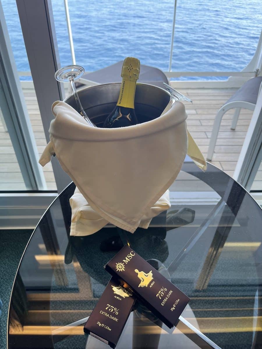 We verblijven op deck 10 (Tormalina deck) in een suite. We zijn erg leuk welkom geheten, want bij aankomst stond er een koude fles champagne en een paar welkomstkado’s (geurstokjes en lekkere chocolaatjes) klaar.