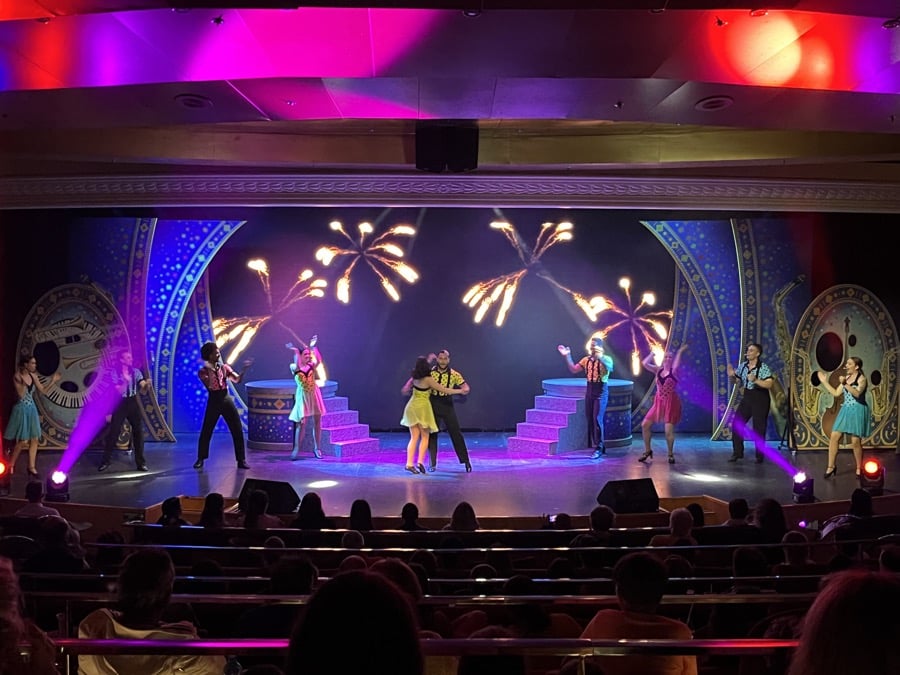 De shows in het theater zijn ge-wel-dig en van zeer hoge kwaliteit. Maar liefst 6 dansers en 4 zangers en zangeressen nemen je mee van een swing show, naar variety, tot idols. Acrobatiek in de lucht maakt grote indruk en de stemmen van de zangers bezorgen je kippenvel.