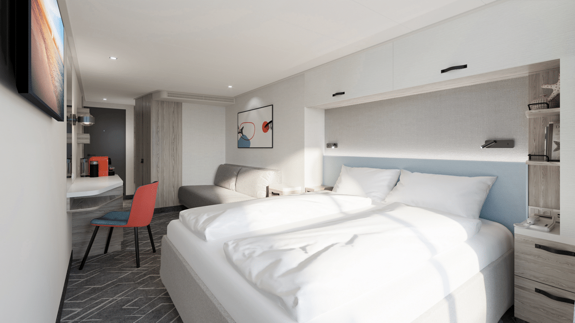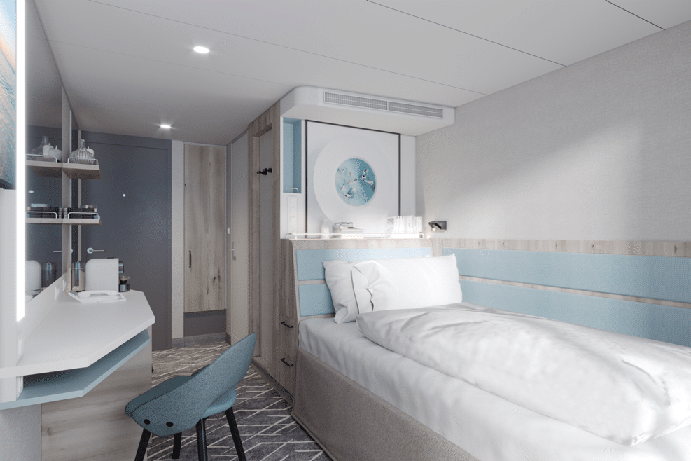 Het achtste schip in de Mein Schiff-vloot van TUI Cruises, het eerste in een nieuwe klasse schepen, belooft haar gasten een nieuw gevoel van welzijn te ervaren, ook in hun hutten. Naast de binnen- en buitenhutten voor alleenreizenden, die al beschikbaar zullen zijn op Mein Schiff 7, biedt het achtste schip nu ook 1-persoons balkonhutten