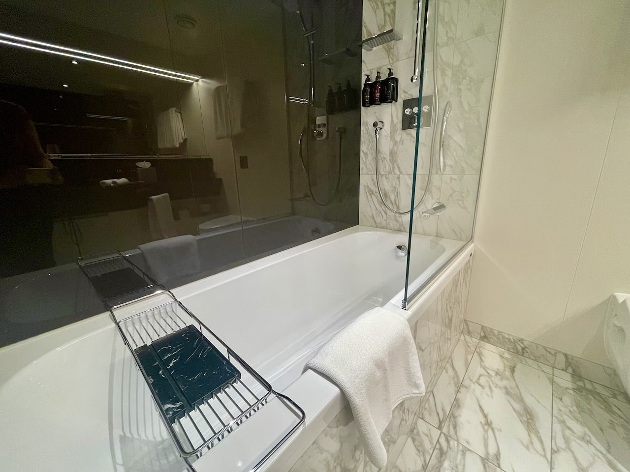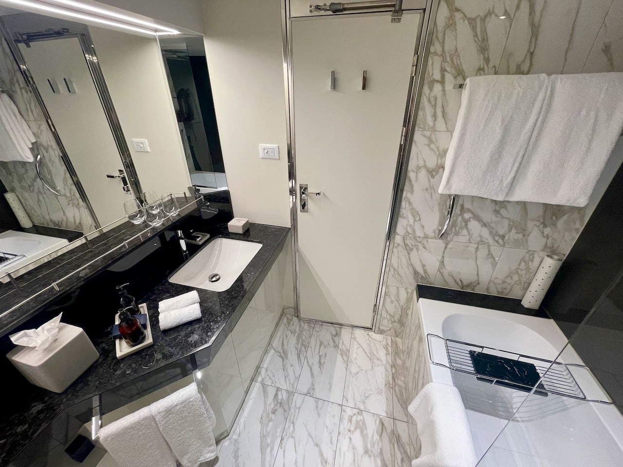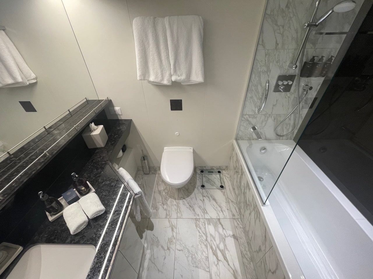 Een drempel leidt je naar de badkamer, waar in mijn geval een bad in zit. Er zijn ook suites met een grote douche. Fijn is de vloerverwarming die mijn kamerjongen al aan gezet had, en tal van toiletspulletjes zoals je verwacht (shampoo, conditioner, body lotion, zeepje van Explora’s eigen merk Mandala, maar ook wattenschijfjes). Handig vind ik het rek op het bad zodat je daar wat op kunt leggen zonder dat het in het water valt 😉