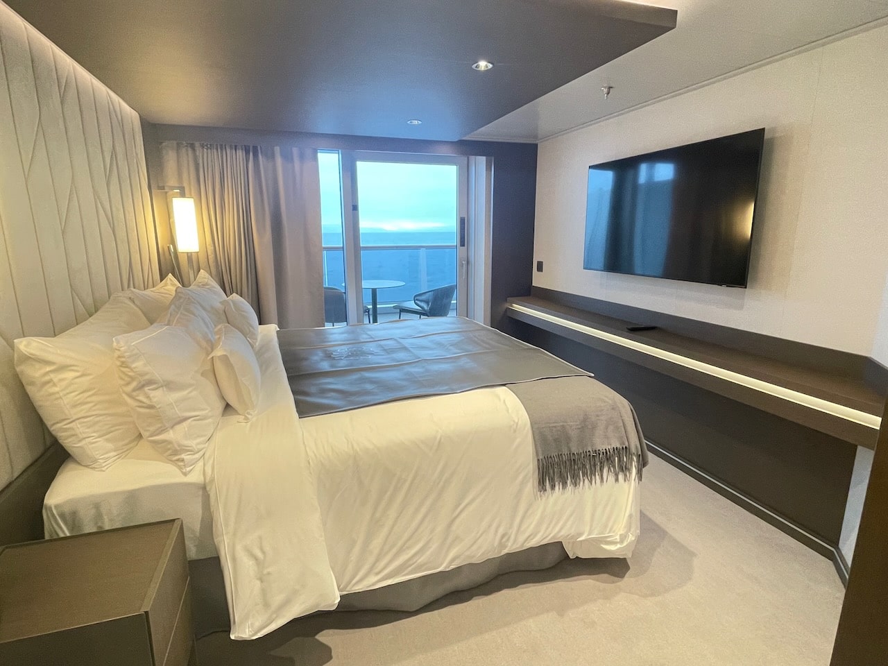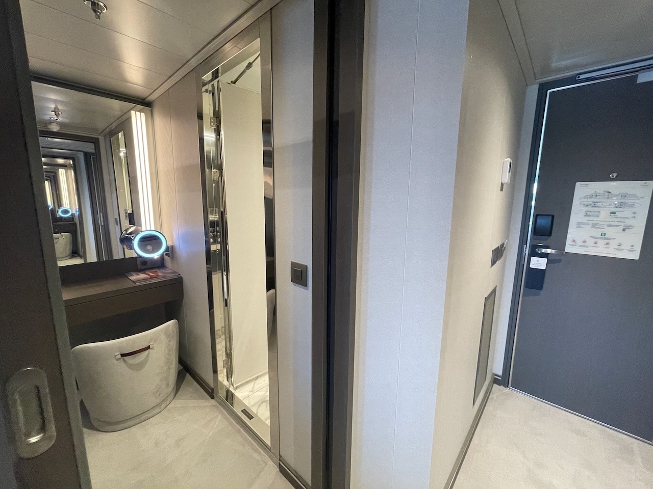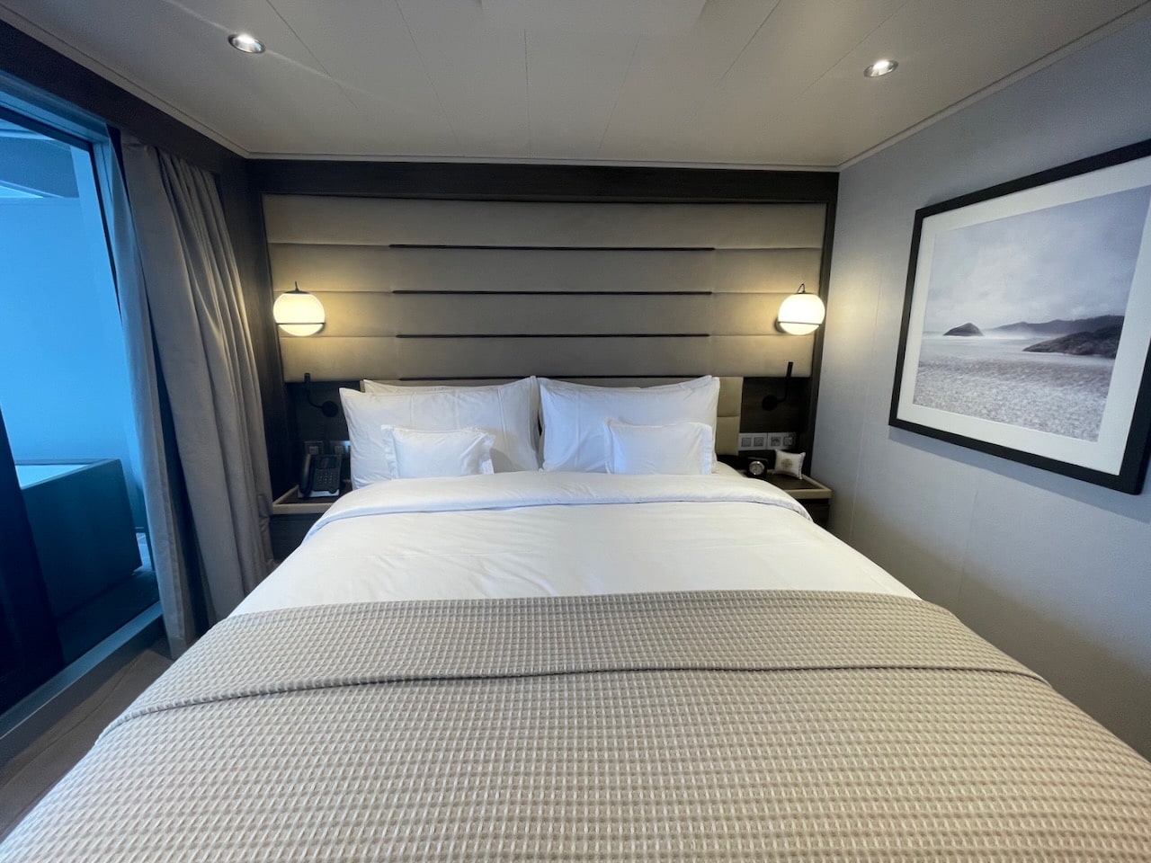 We starten dit overzicht met de instapcategorie suite, de Ocean Terrace Suite. Dit is een 35 m2 grote suite met balkon. Van deze categorie zijn er het meeste aan boord. De suite bestaat uit een badkamer, walk-in gedeelte voor de garderobe, kaptafel, een bed, sofa met tafel en een balkon. Hieronder zie je foto’s van suite no. 9070, waar ik zelf in verbleef. Een fijne locatie, dichtbij de liften.