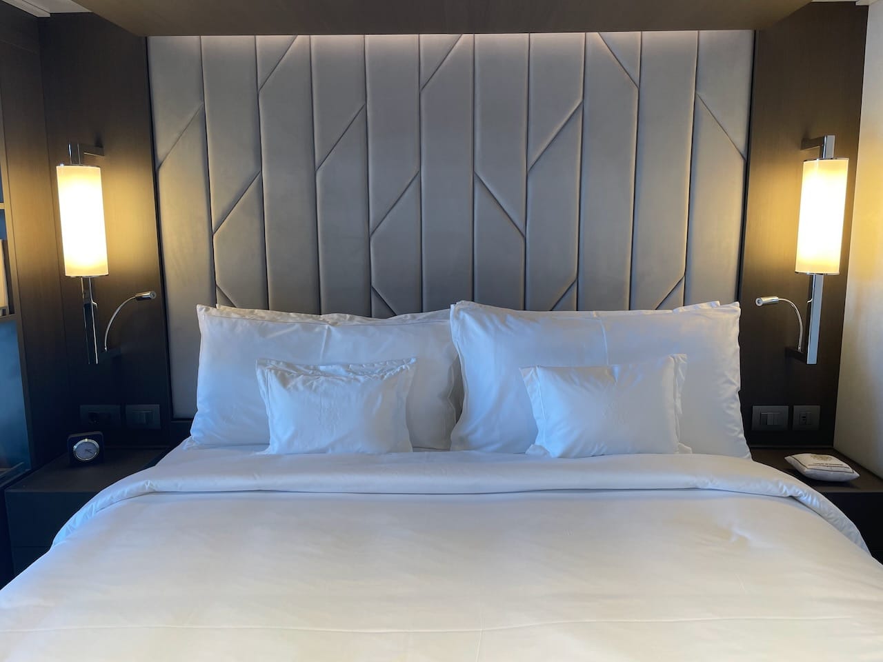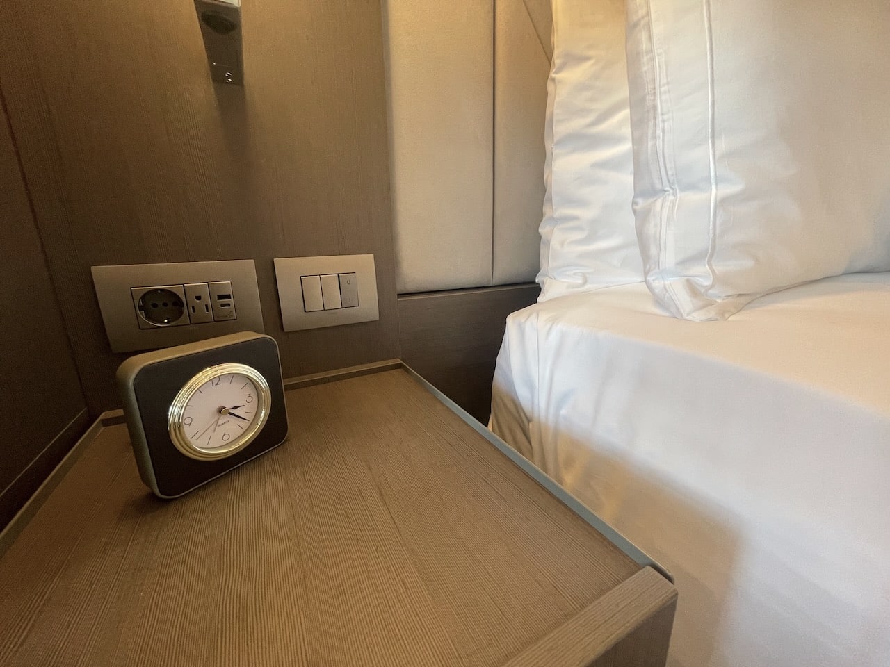 Bij het bed staat aan elke kant een nachtkastje, met een onderaan een licht dat aanschiet als je in de buurt komt. Als je ’s nachts dus even eruit moet, schiet gelijk dit subtiele licht aan. Stekkers en usb poorten zijn ruim voorhanden naast het bed, vooral aan de linkerkant. Uiteraard zijn er keuzes in de soorten kussens. Een minikussen herinnert de gasten aan duurzaamheid.