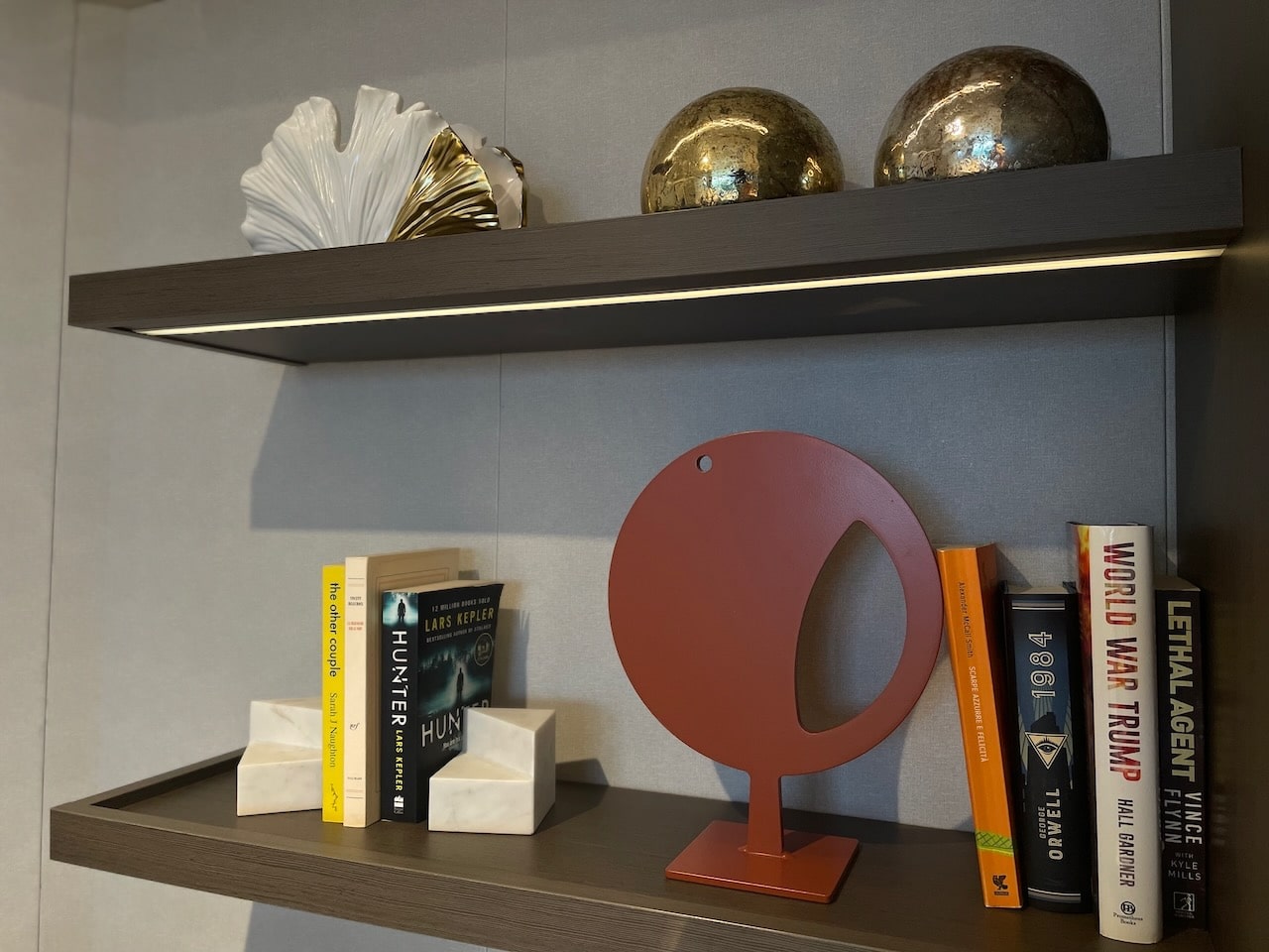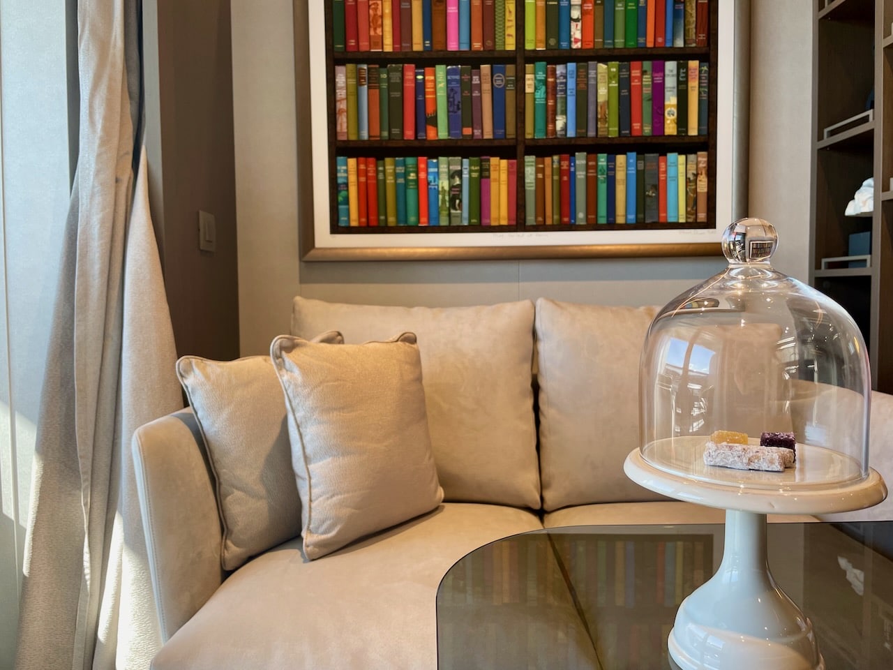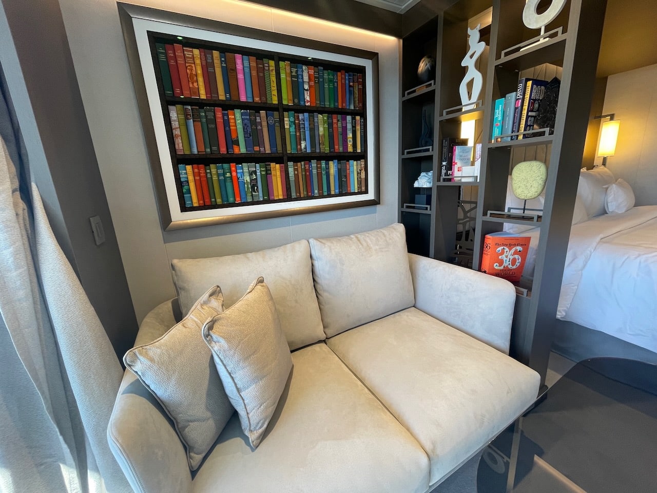 De leefruimte en het bed worden door een blokkenkast afgescheiden van elkaar. Deze staat vol met kunstobjecten en boeken, met onder andere een reisboek, natuurboek en diverse andere genres. Deze zijn wel in het Engels, Frans en Duits. Een bijpassend schilderij met boekenruggen daarop afgebeeld maakt de mini-bieb af.