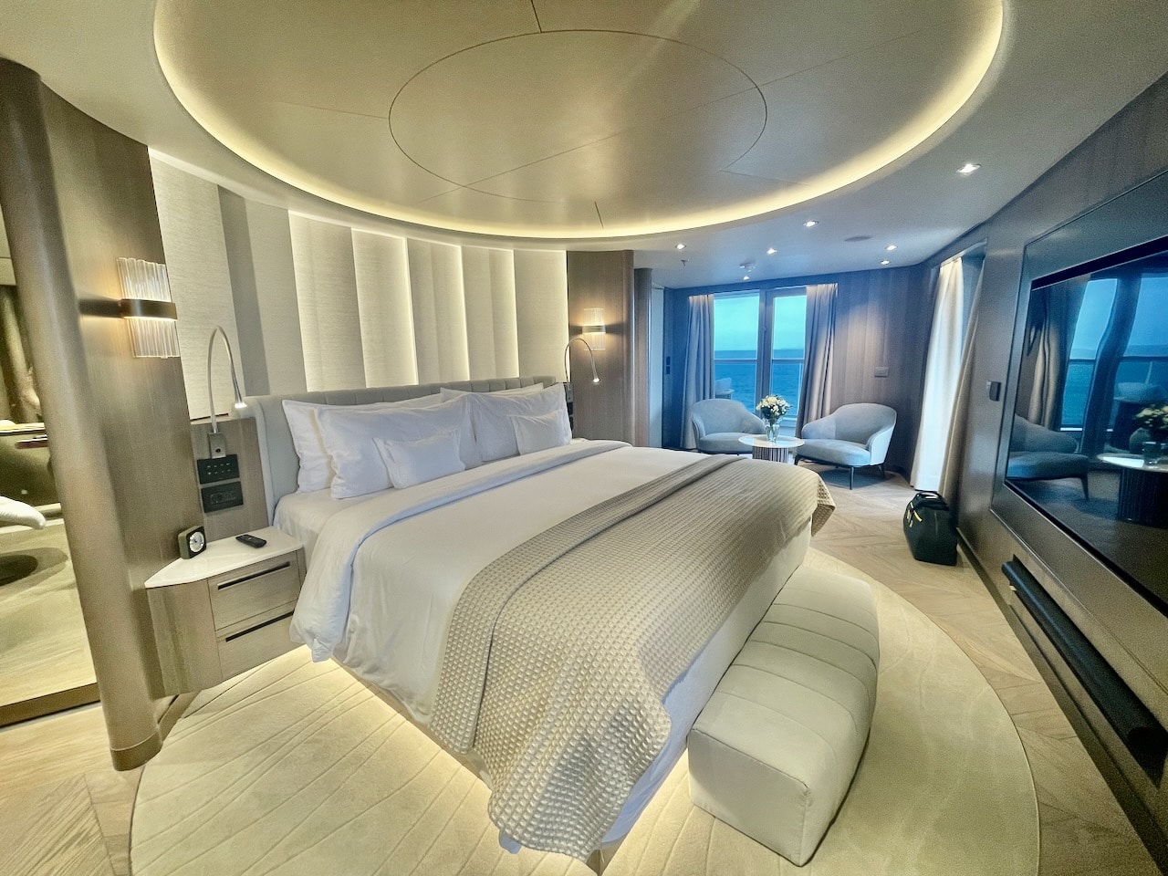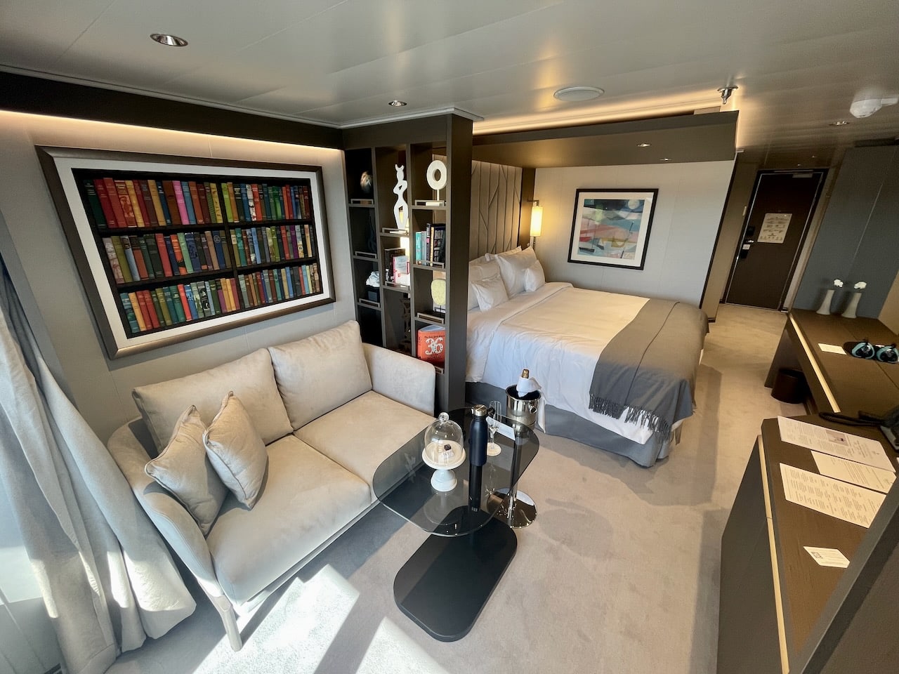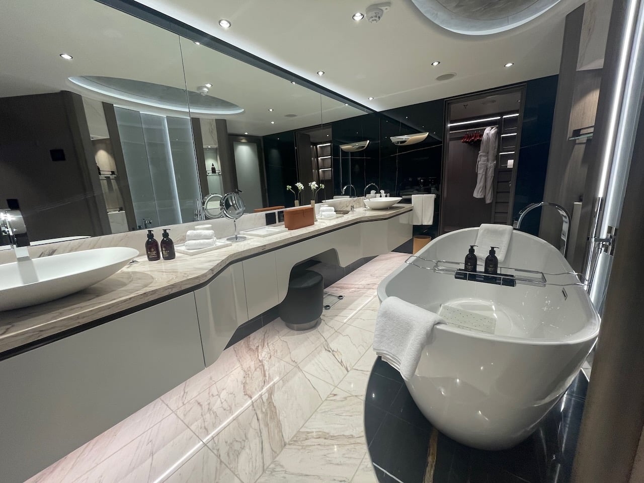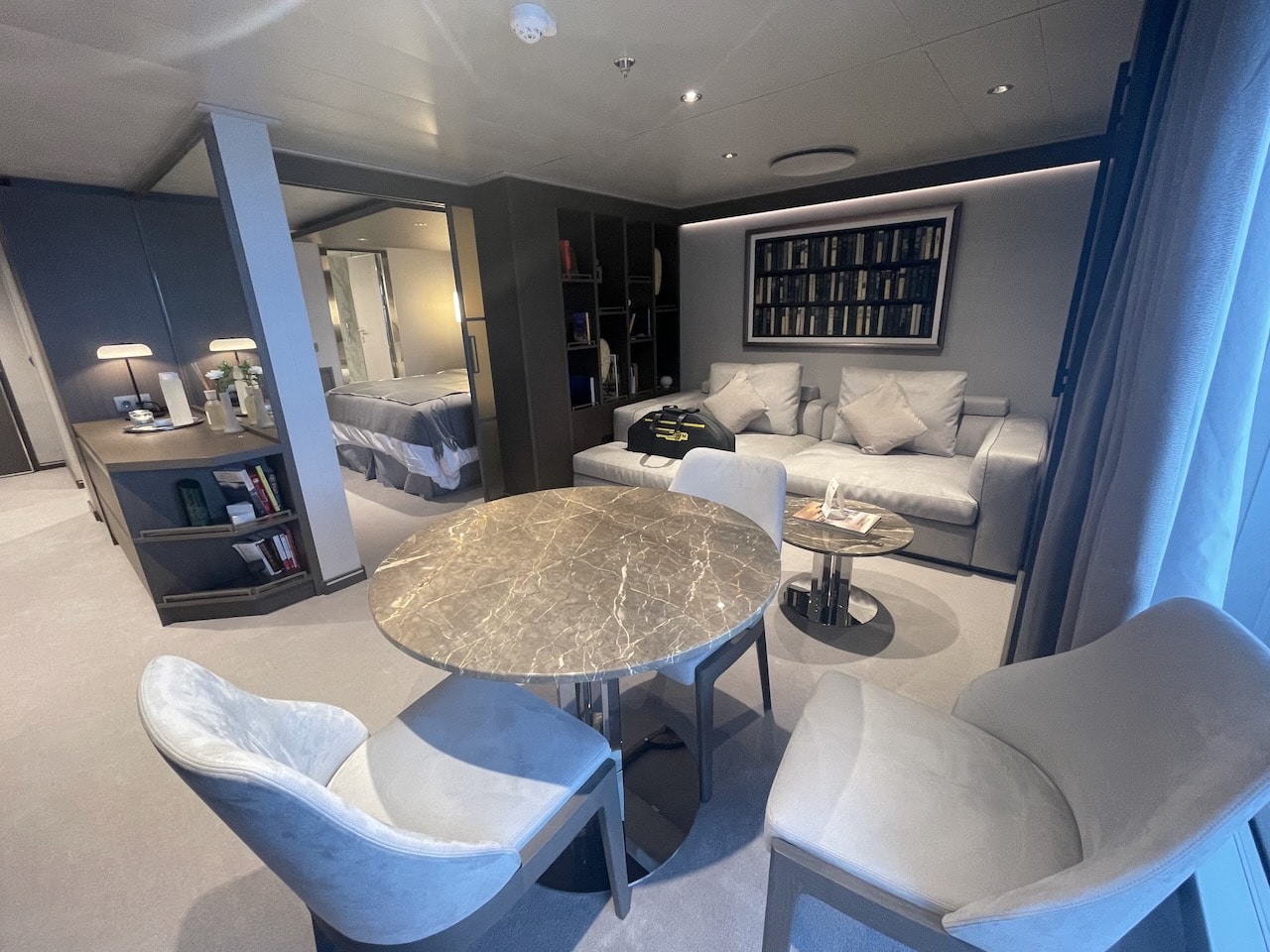 Aan boord zijn vier soorten Penthouse Suites – Penthouse, Deluxe Penthouse, Premium Penthouse en Grand Penthouse – waarvan ik er twee heb kunnen bezoeken. Penthouses zijn net even wat groter dan de vorige categorie. Ze variëren in grootte van 43 m2 tot 68 m2. Ze hebben elk een eettafel voor vier personen en een zithoek. Gasten hebben in deze categorie de beschikking over een aantal extra’s: een Technogym trainingstas met trainingsmateriaal zoals elastische banden, yogamat etc. In het bijbehorende boek vind je oefeningen. Verder staan in elke penthouse geurstokjes klaar, een duurder type verrekijker en bij welkomst een luxere champagne, een Moët Chandon Vintage 2015. Overigens kan de Technogym tas ook door gasten uit de Ocean Terrace Suite worden aangevraagd om te gebruiken!