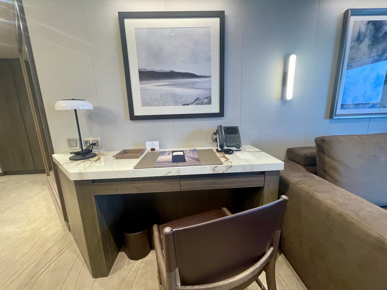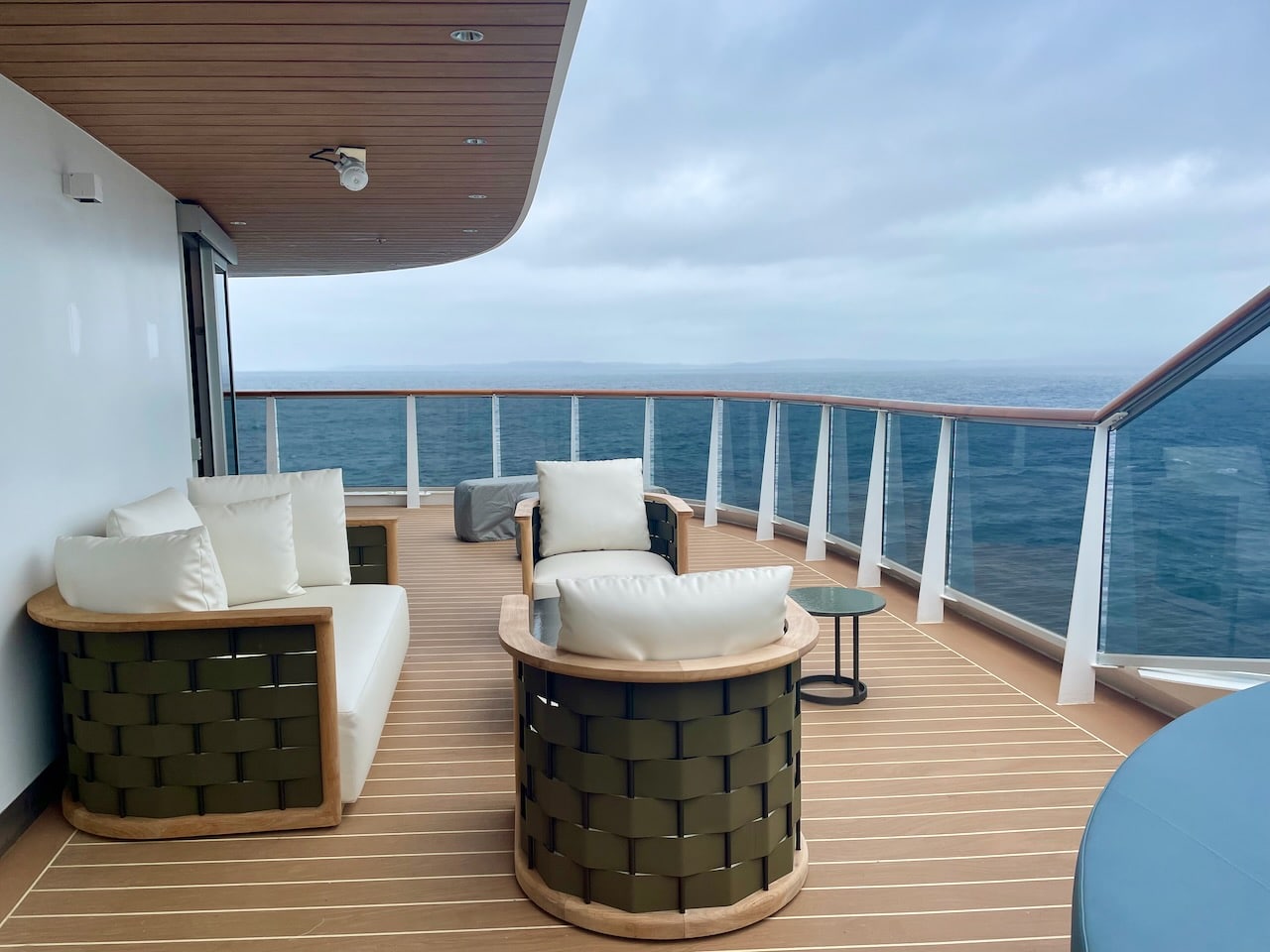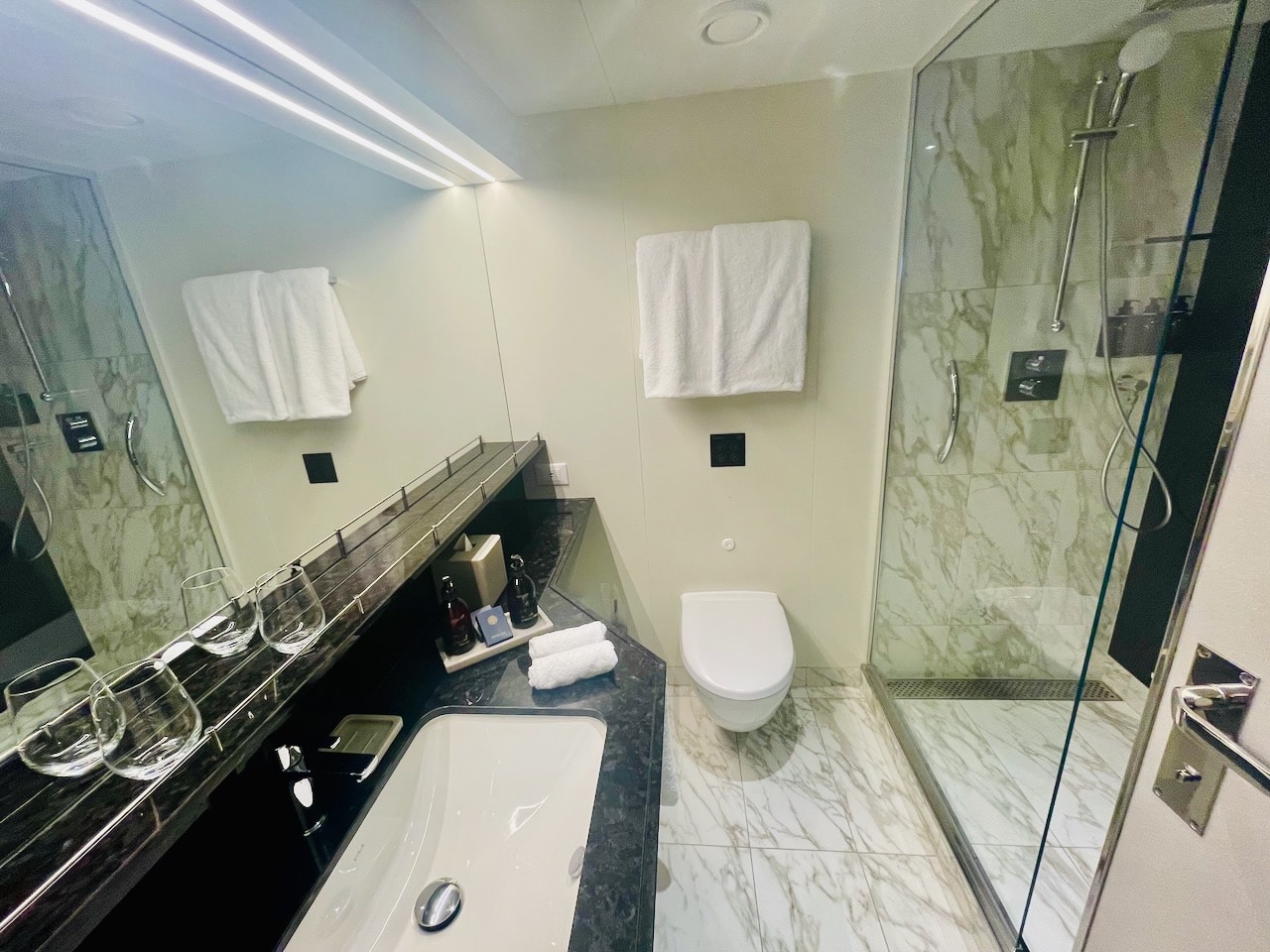 Aan boord zijn vier soorten Penthouse Suites – Penthouse, Deluxe Penthouse, Premium Penthouse en Grand Penthouse – waarvan ik er twee heb kunnen bezoeken. Penthouses zijn net even wat groter dan de vorige categorie. Ze variëren in grootte van 43 m2 tot 68 m2. Ze hebben elk een eettafel voor vier personen en een zithoek. Gasten hebben in deze categorie de beschikking over een aantal extra’s: een Technogym trainingstas met trainingsmateriaal zoals elastische banden, yogamat etc. In het bijbehorende boek vind je oefeningen. Verder staan in elke penthouse geurstokjes klaar, een duurder type verrekijker en bij welkomst een luxere champagne, een Moët Chandon Vintage 2015. Overigens kan de Technogym tas ook door gasten uit de Ocean Terrace Suite worden aangevraagd om te gebruiken!