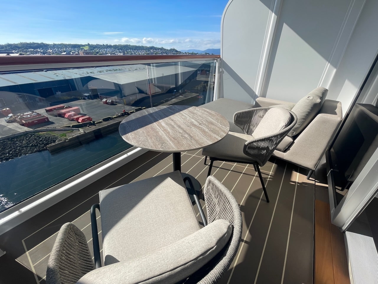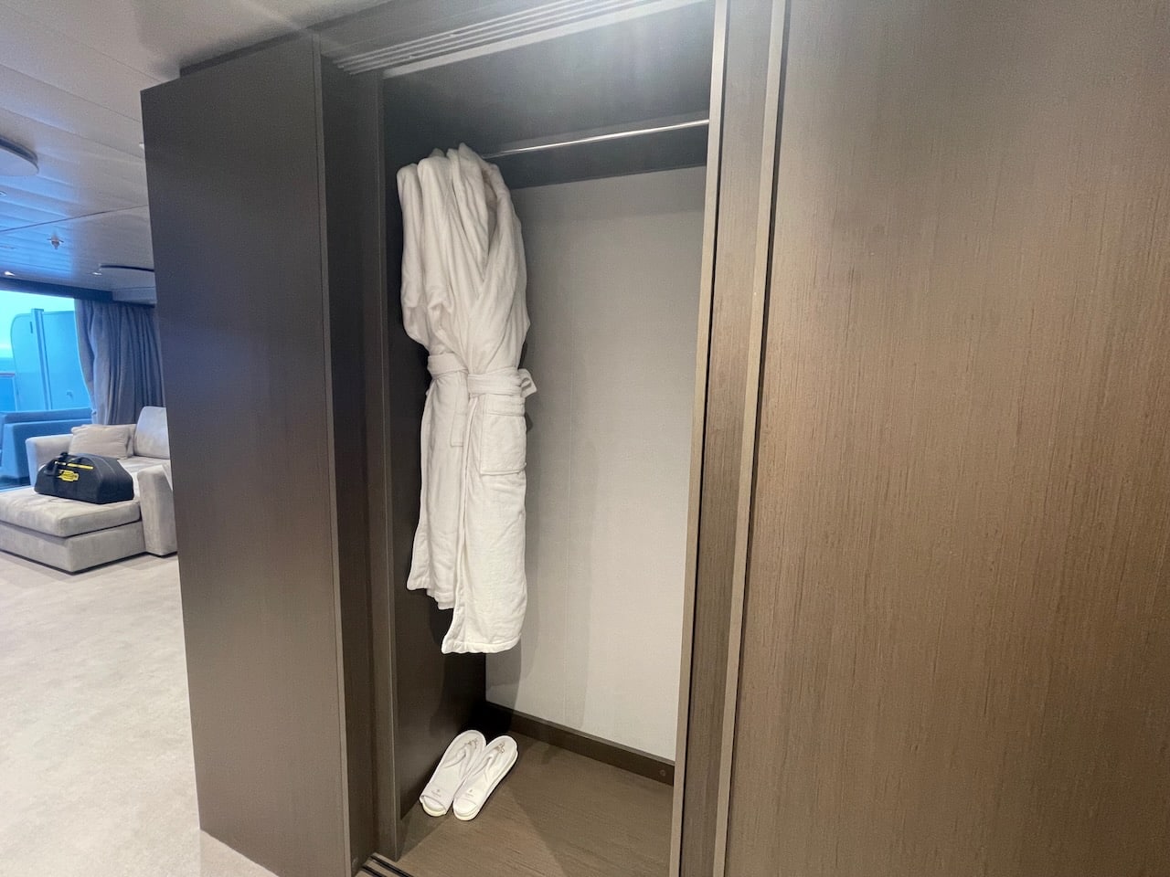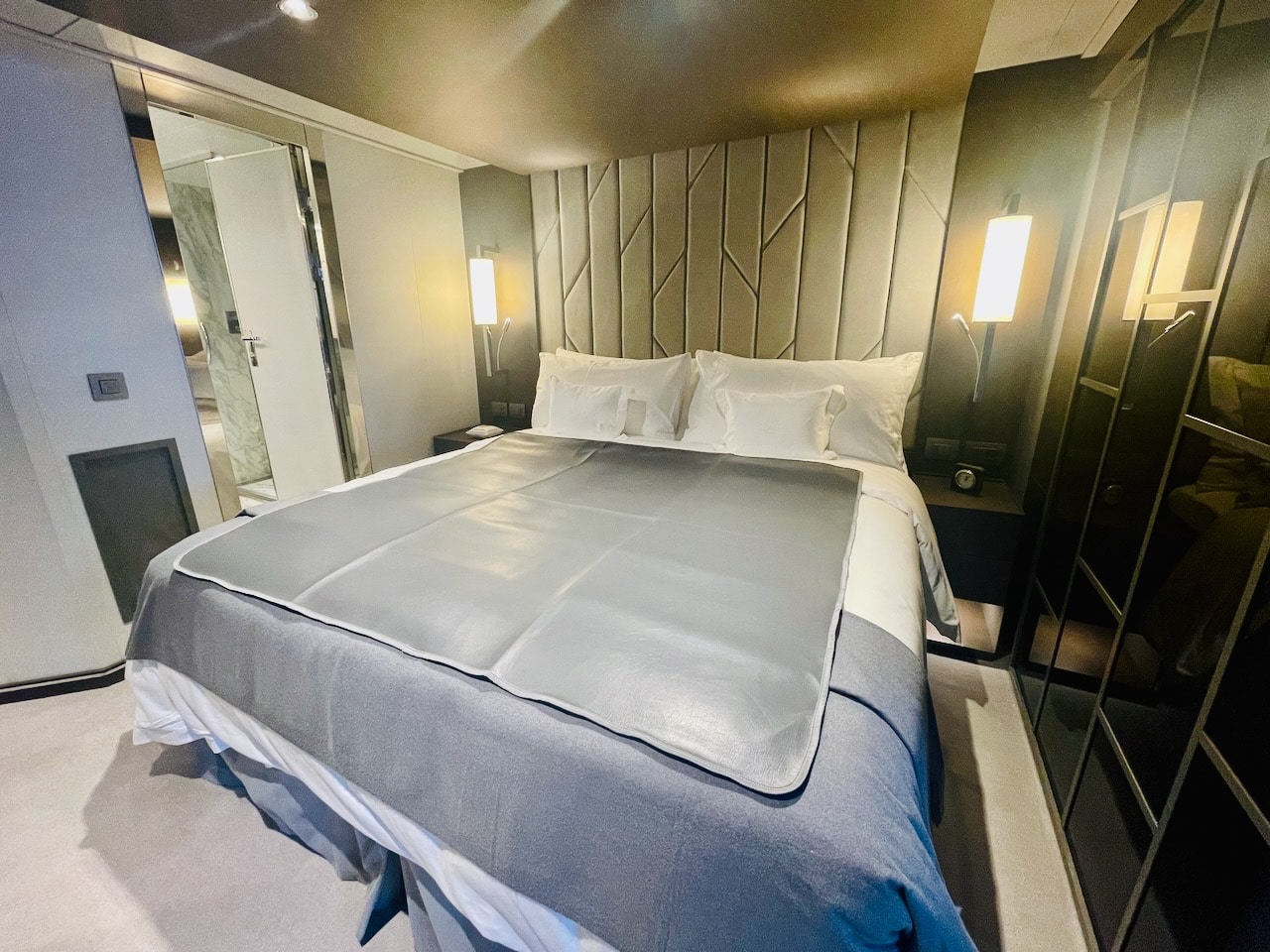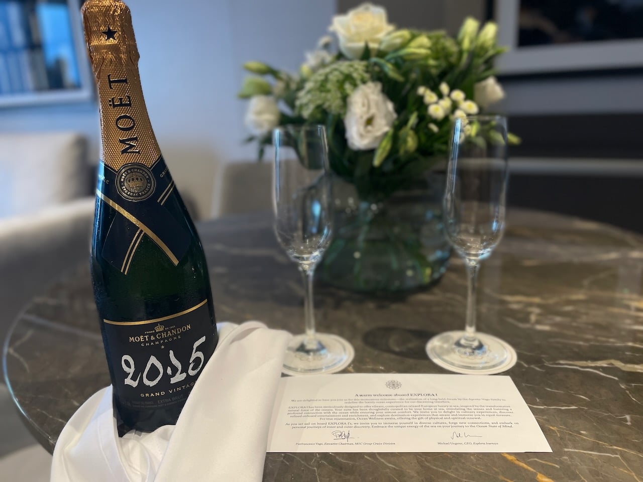 Aan boord zijn vier soorten Penthouse Suites – Penthouse, Deluxe Penthouse, Premium Penthouse en Grand Penthouse – waarvan ik er twee heb kunnen bezoeken. Penthouses zijn net even wat groter dan de vorige categorie. Ze variëren in grootte van 43 m2 tot 68 m2. Ze hebben elk een eettafel voor vier personen en een zithoek. Gasten hebben in deze categorie de beschikking over een aantal extra’s: een Technogym trainingstas met trainingsmateriaal zoals elastische banden, yogamat etc. In het bijbehorende boek vind je oefeningen. Verder staan in elke penthouse geurstokjes klaar, een duurder type verrekijker en bij welkomst een luxere champagne, een Moët Chandon Vintage 2015. Overigens kan de Technogym tas ook door gasten uit de Ocean Terrace Suite worden aangevraagd om te gebruiken!