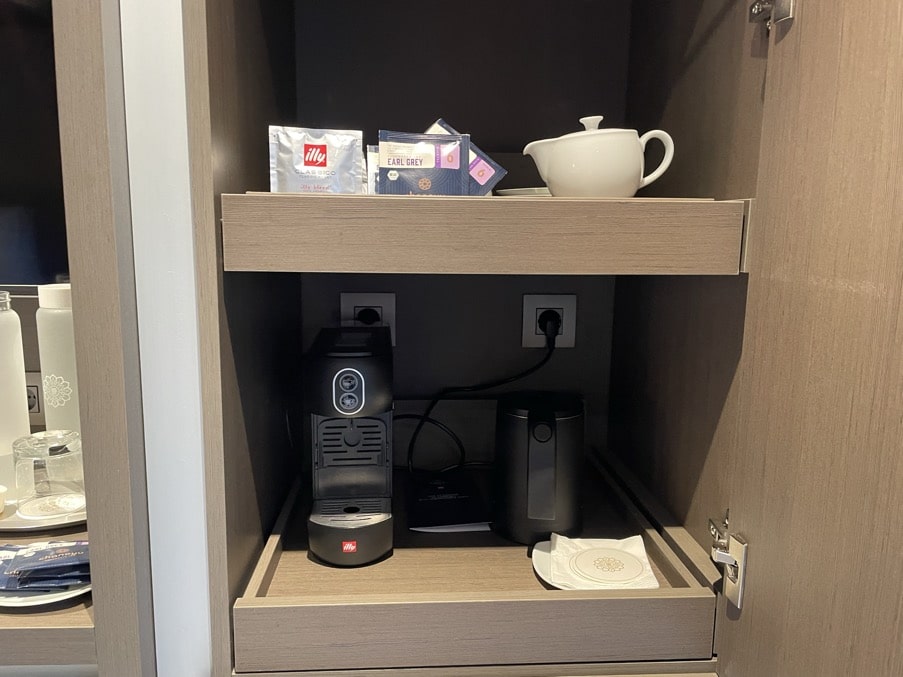 Je hebt de beschikking over een minibar: een gevulde koelkast (ook naar wens sterke drank), koffiezet espresso apparaat van Illy, waterkoker (met theepotje) en flessen met water, alsook een persoonlijke waterfles die je kunt gebruiken aan boord of op excursie. Er zijn waterpunten zo her en der aan boord. Een kluis is in één van de lades te vinden. Je hebt de keuze uit een in-dining roomservice menu (24 uurs) en uitgebreide ontbijt roomservice.