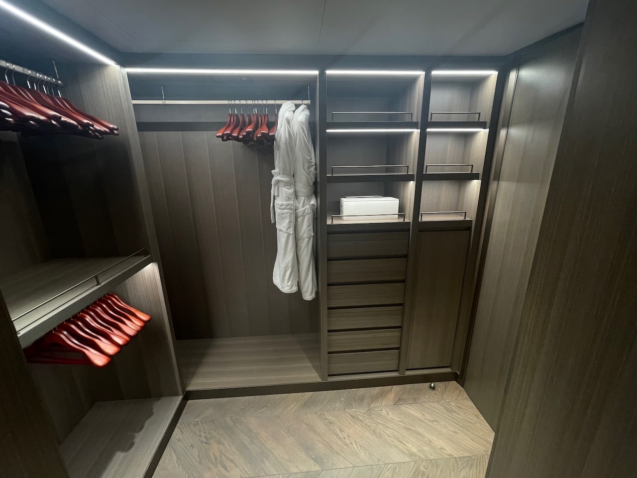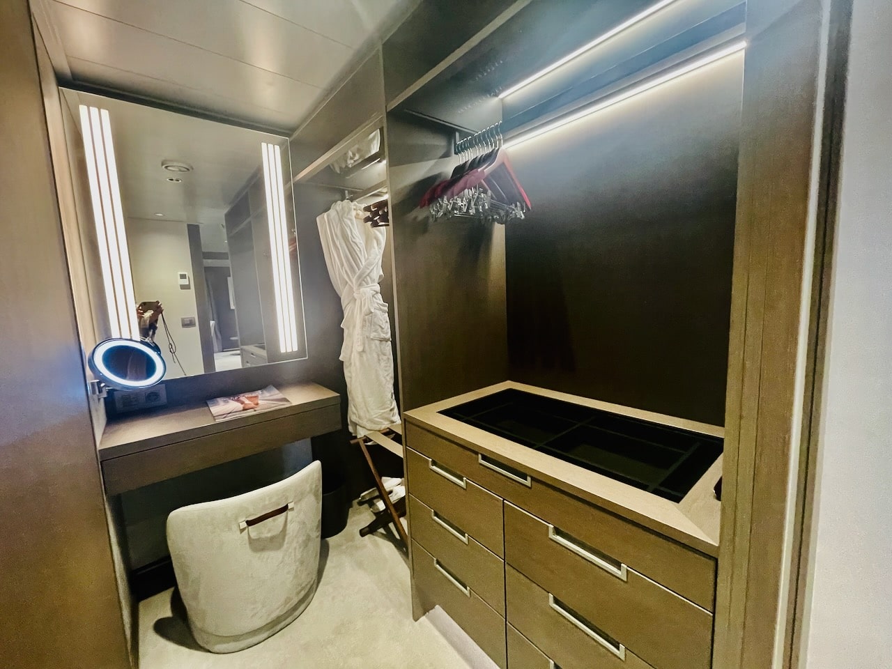 Lopen we verder dan komen kom je een verrekijker tegen bij de grote spiegel en daarna arriveren we bij het inloopgedeelte. Je hebt er twee hangrekken en een kast met 6 lades. Kleine spullen kan je ook kwijt in de bovenste vakkenla. Badjassen en badslippers hangen en staan klaar. De kaptafel heeft in de la een Dyson föhn en make-up spiegel.