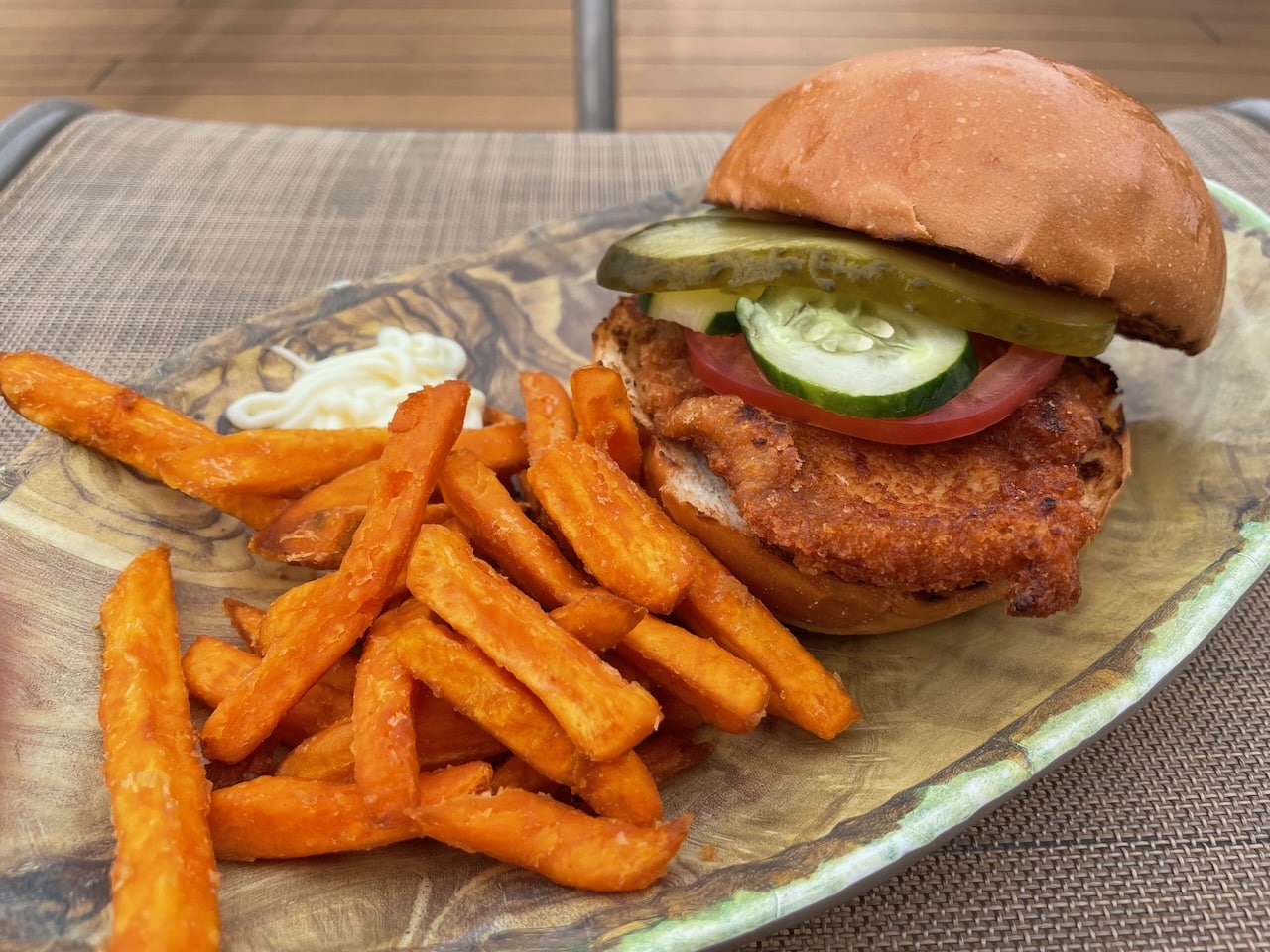 Buiten bij het achterdek, bij het zwembad, kan je vanaf 12 uur ’s middags versgemaakte hamburgerbroodjes, frites en salade halen.
