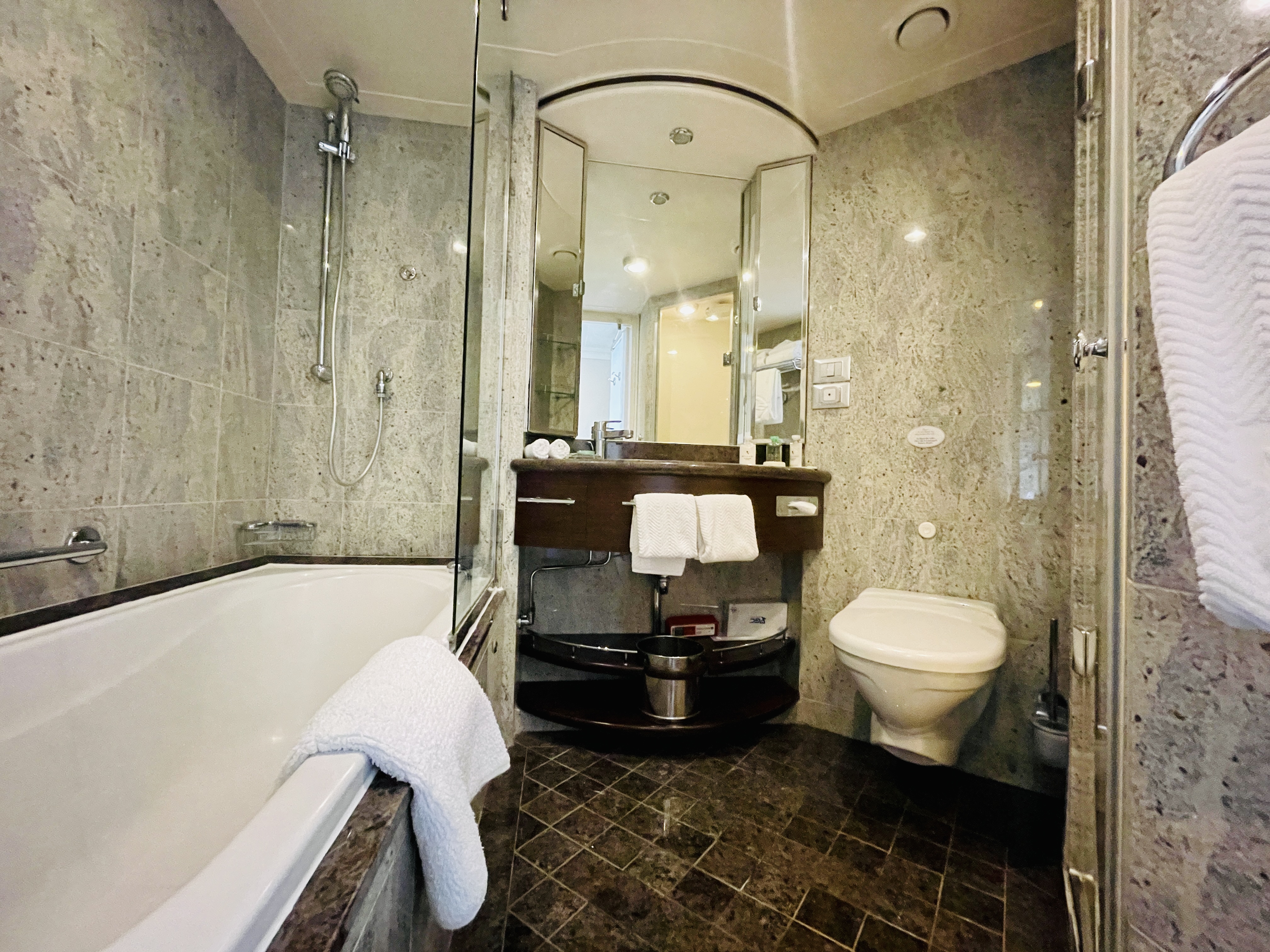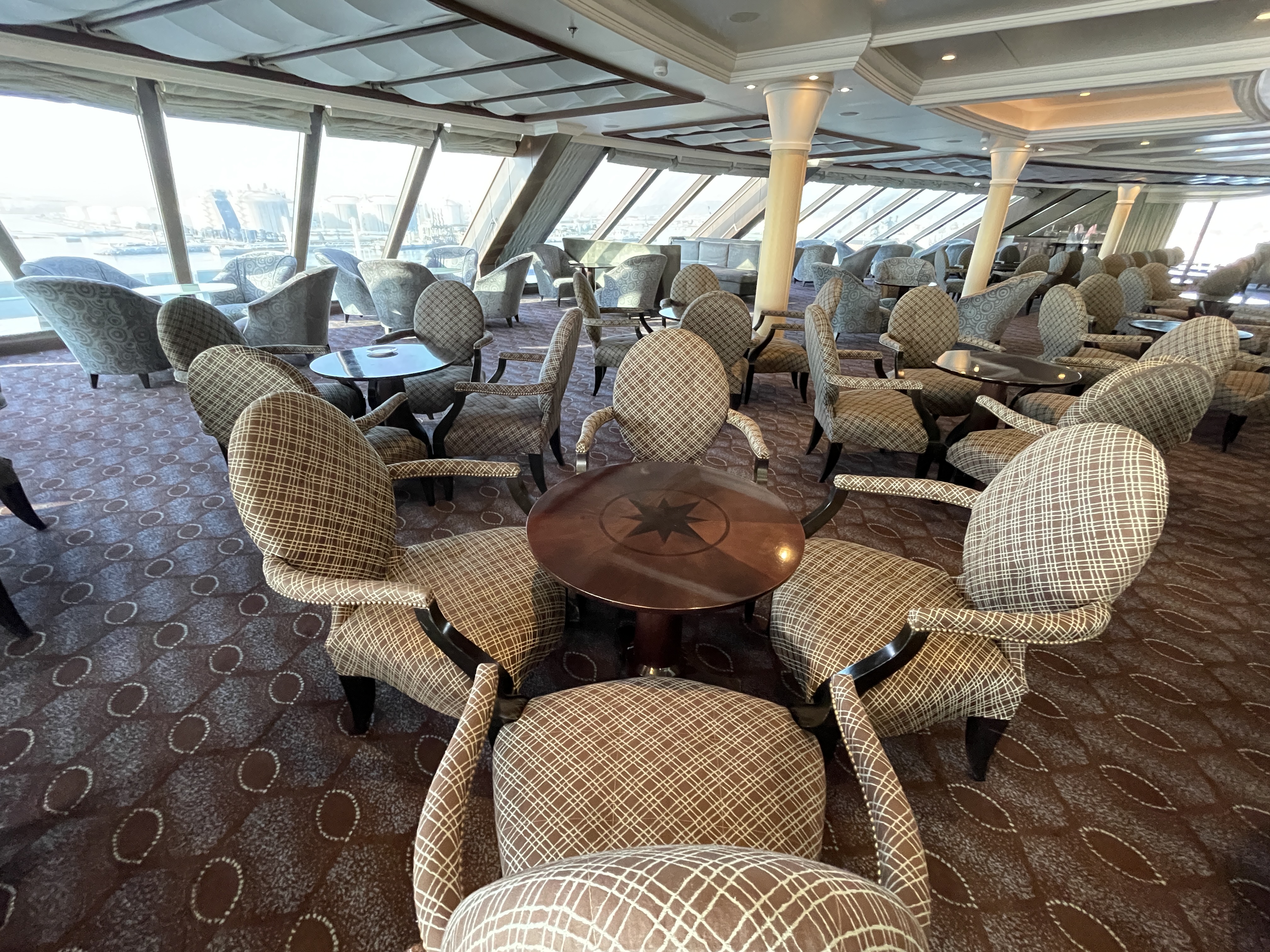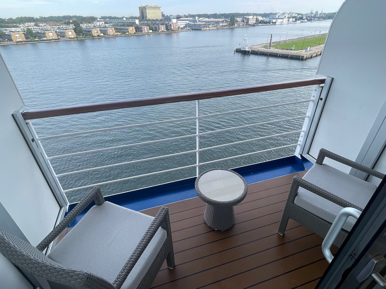 Bij binnenkomst stap ik direct binnen in het atrium, majestueus, en eigenlijk – zo zal later blijken – een van de weinige ruimtes die zo groots aan doet. De rest van het schip kenmerkt zich door fijne kleinere intieme ruimtes, zeer sfeervol ingericht. De 1200 passagiers hebben veel ruimte tot hun beschikking in een van de 629 hutten, waarvan het merendeel overigens een balkon heeft – slechts 28 niet.