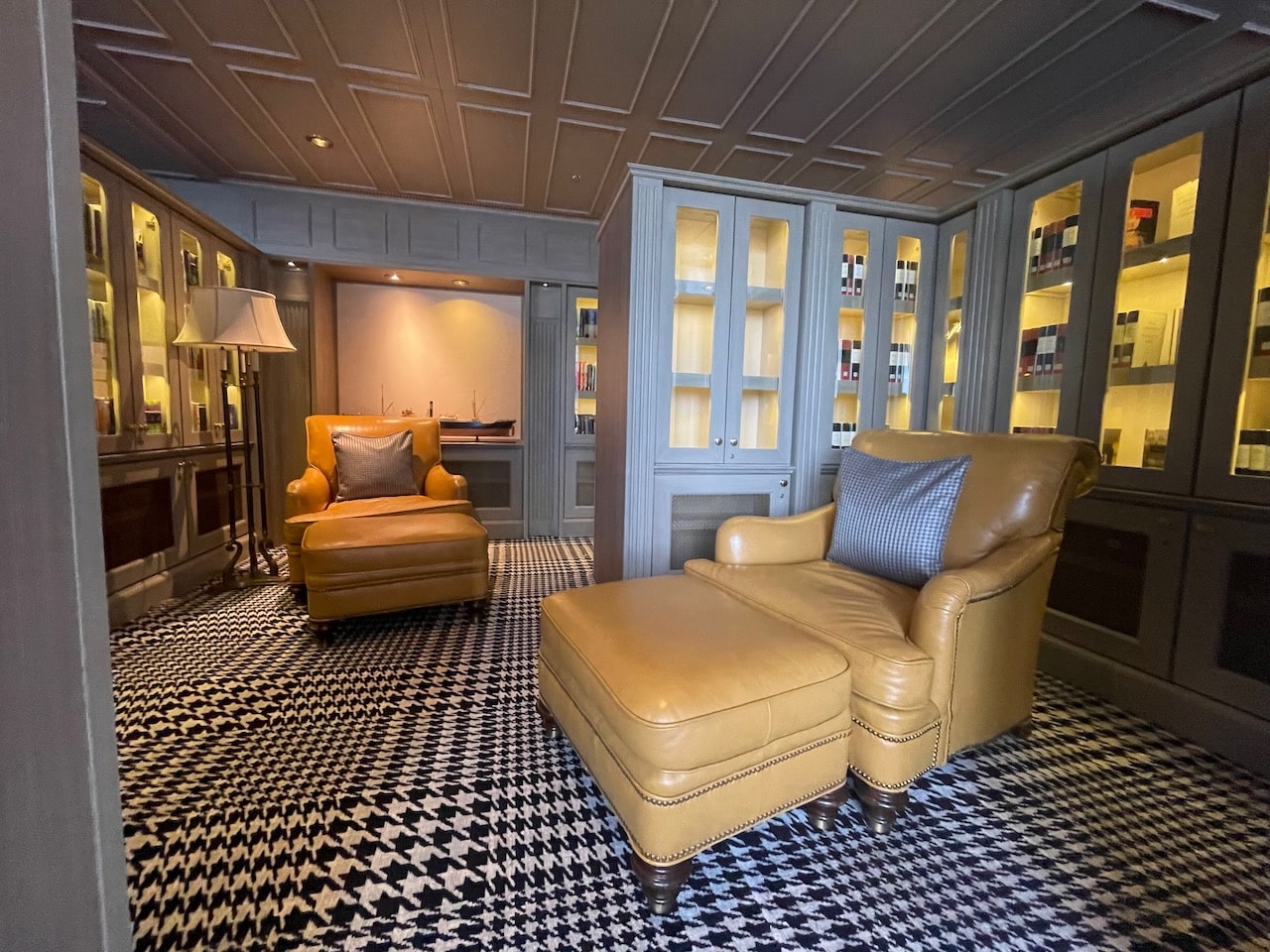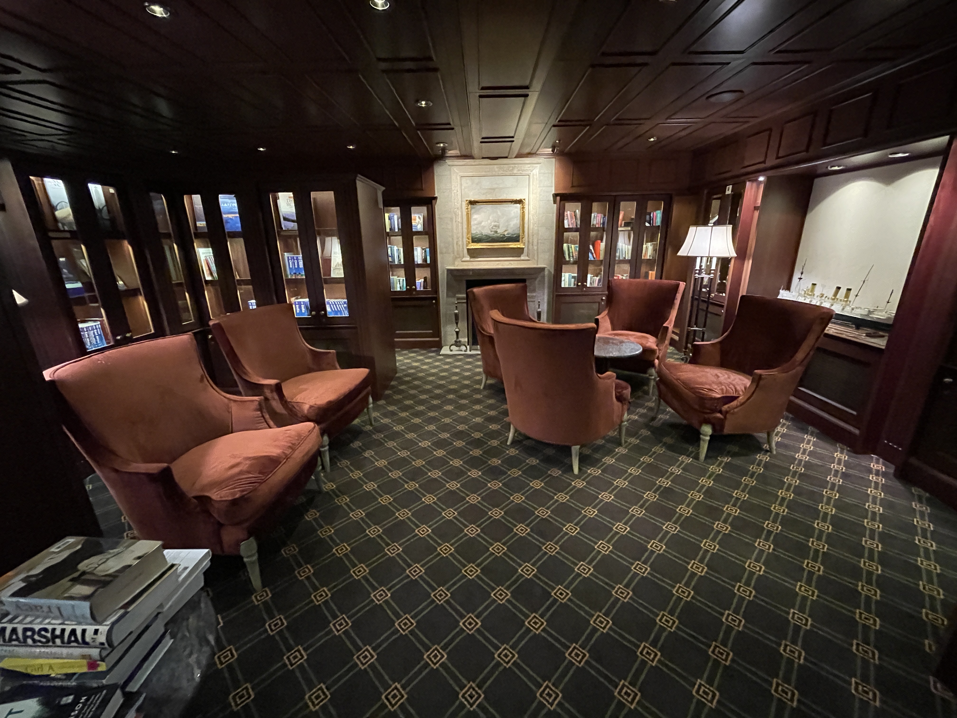 Een favoriet aan boord blijft de klassieke bibliotheek, nog steeds klassiek heringericht maar misschien nog wel sfeervoller dan voorheen.