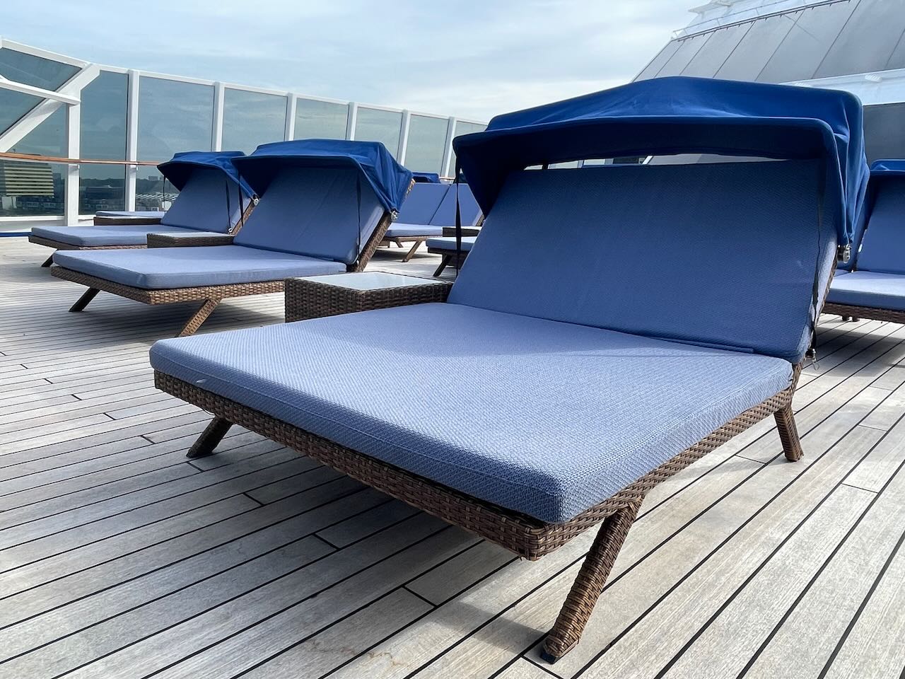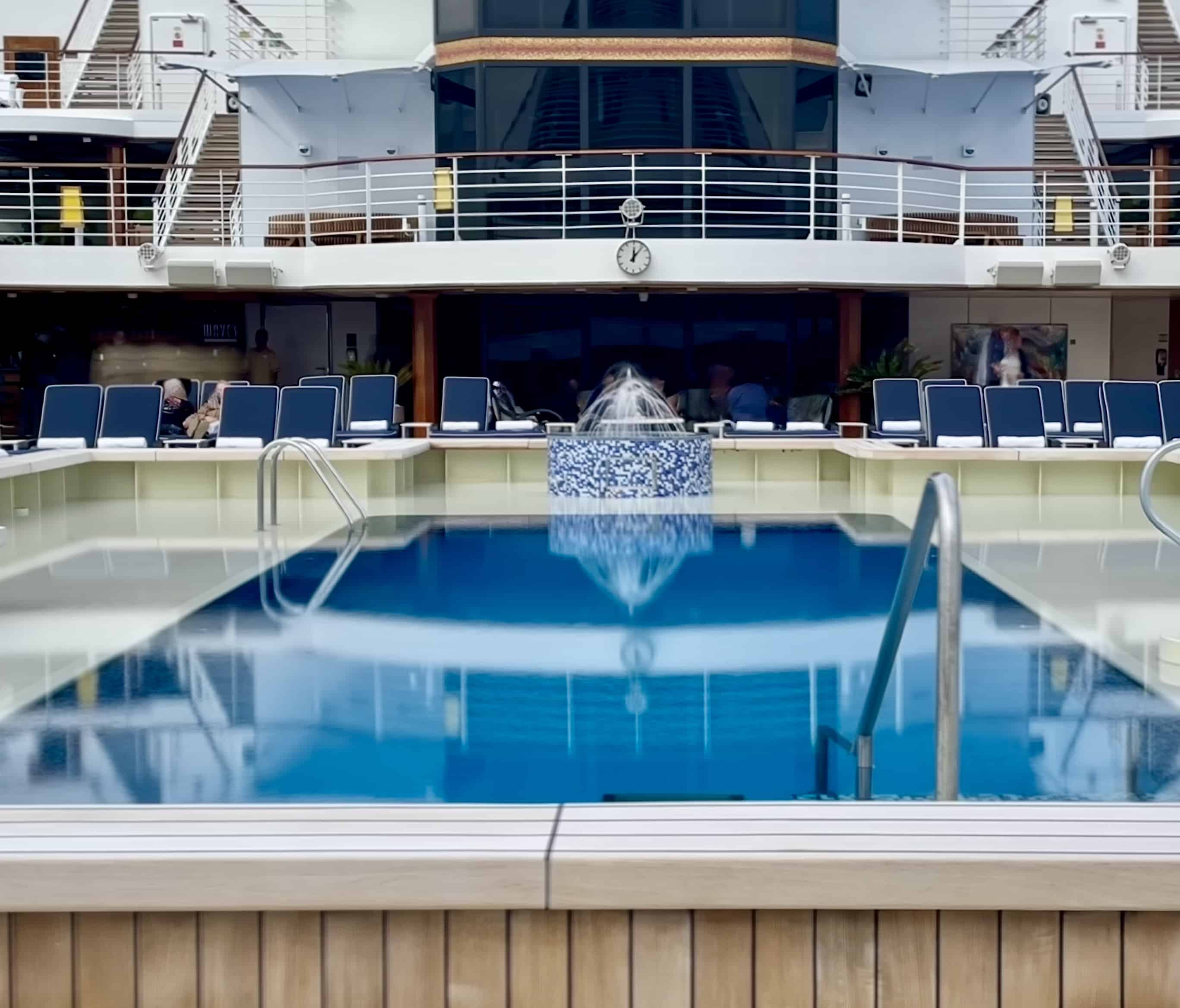 Tot slot maakten we nog een wandeling langs de spa, waar nieuwe ligbedmatrassen in frisse kleuren beschikbaar zijn, en het mooie zwembad midscheeps waar de handdoeken al voor je klaar liggen op de zonnebedjes.