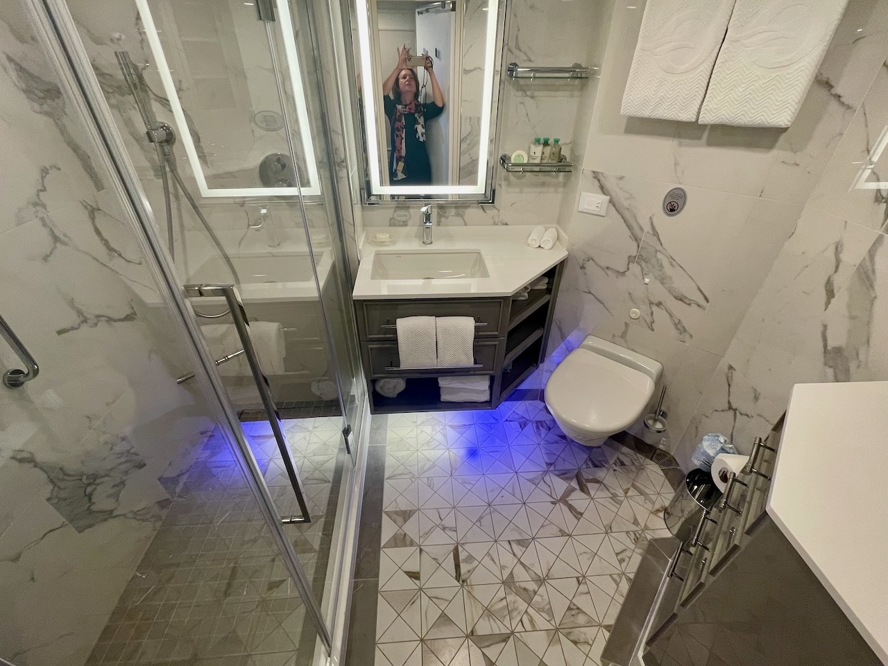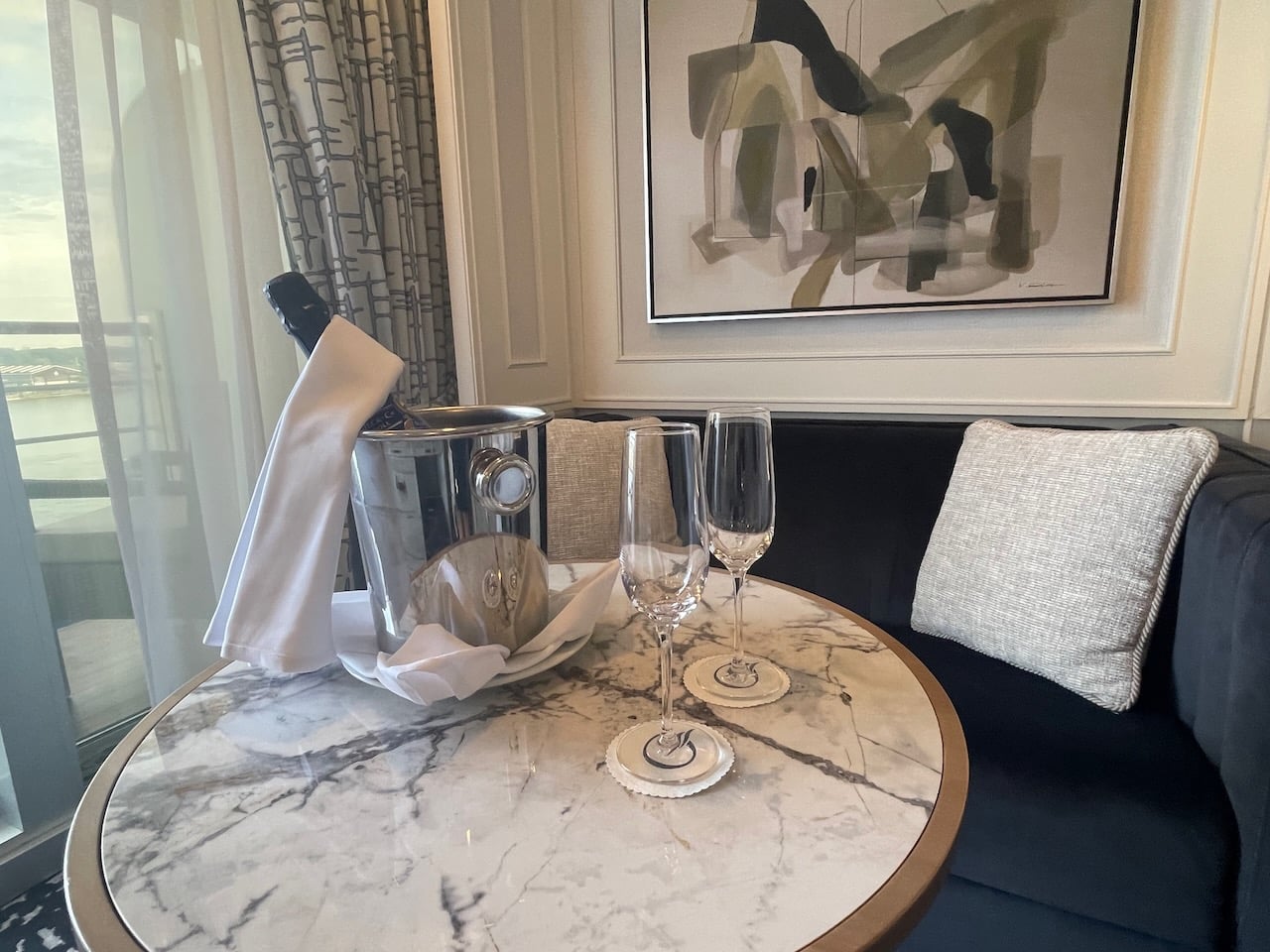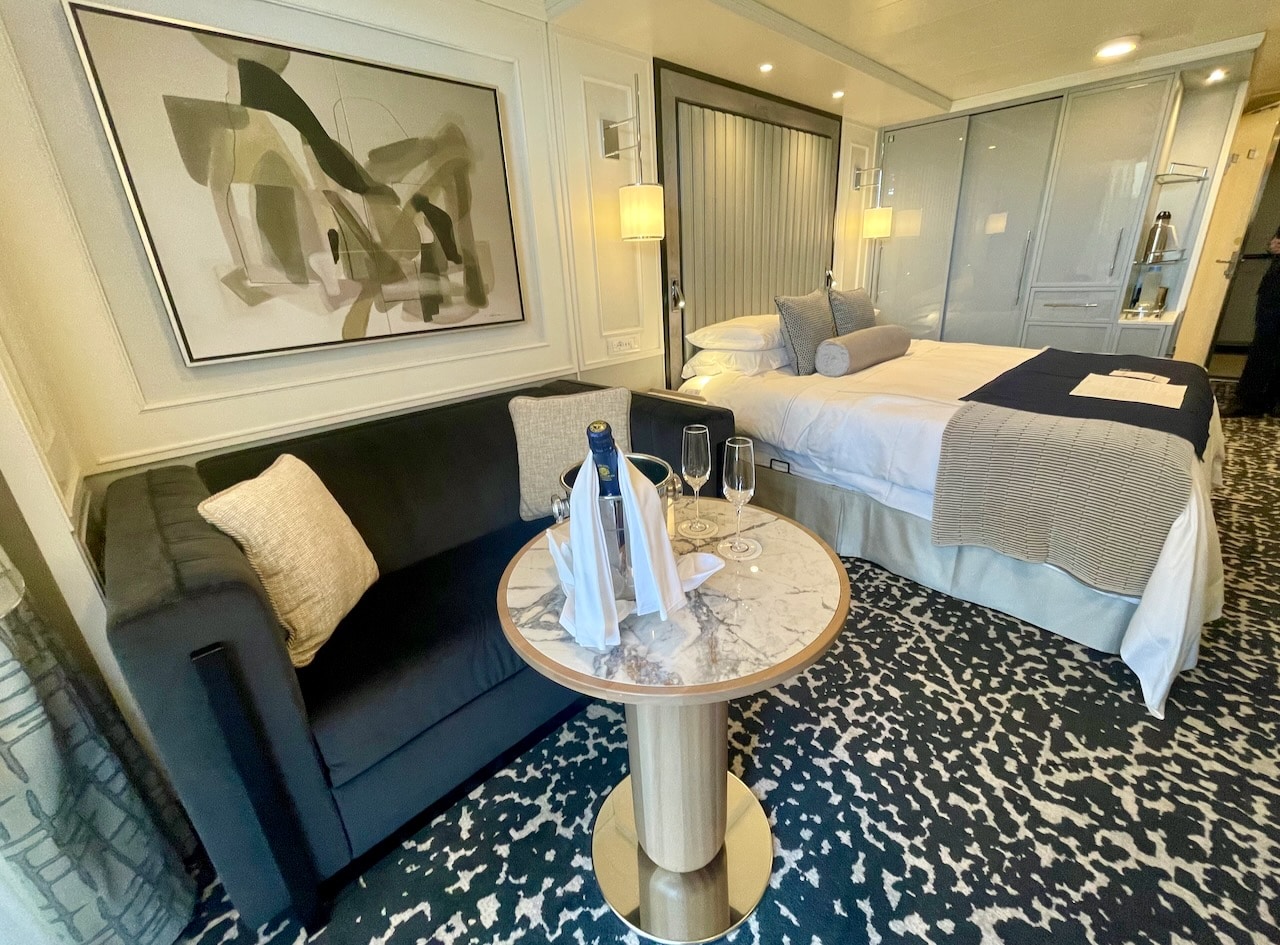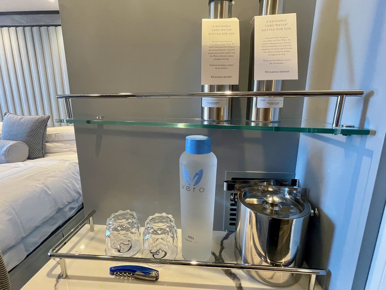 In de hut is vrijwel alles vernieuwd: tapijt, meubilair, bedbord, bureau, schilderijen, noem het maar op :). Bij Oceania Cruises krijg je bovendien als passagier een Vero hervulbare waterfles die je op diverse plekken aan boord zelf kunt vullen bij watertappunten. Zo hoeven er geen onnodig plastic waterflesjes gebruikt te worden.