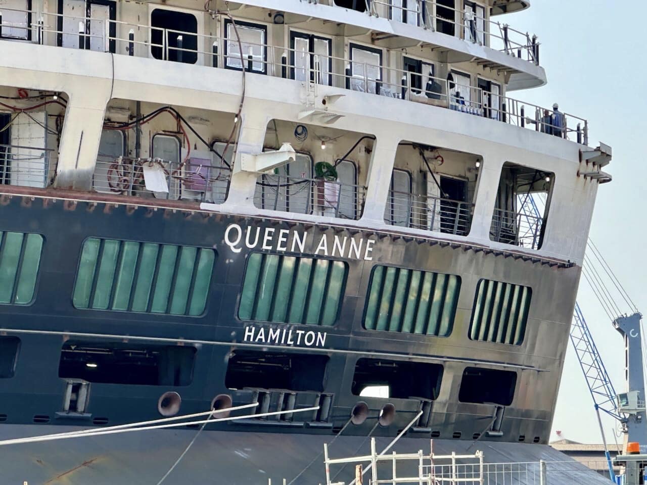 Met haar grijze boeg, met rood en wit, valt direct op dat een Cunard schip in het water ligt. Maar óók dat het een Pinnacle klasse schip is, waarvan moedermaatschappij Carnival er meer (voor Holland America Line) heeft laten bouwen bij deze scheepswerf. Met plek voor hooguit 3000 passagiers is het nog een redelijk middelgroot schip, maar doet ze niet mee met de reuzen van 4000-5000 passagiers.