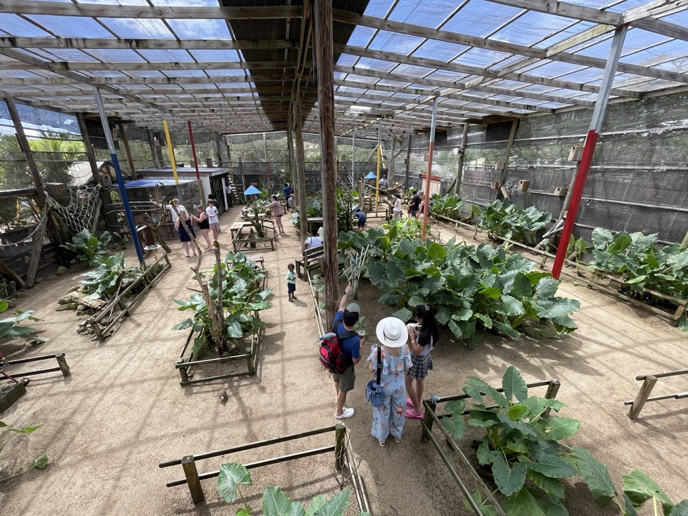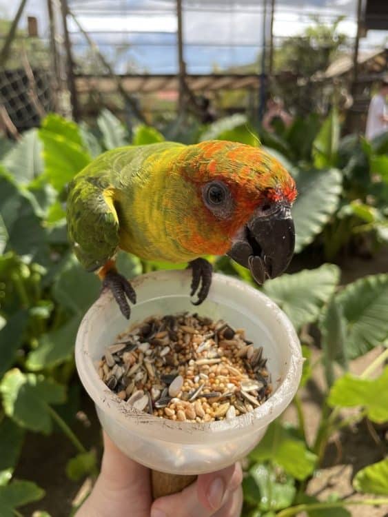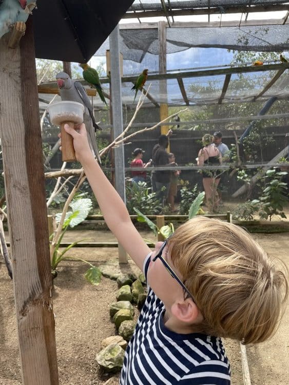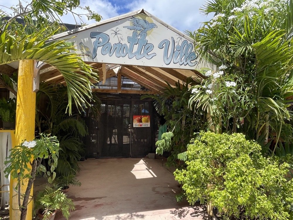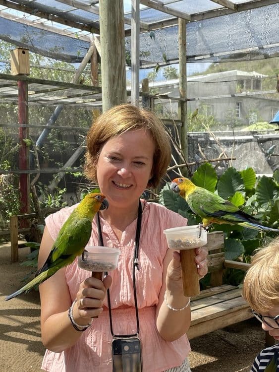Wat een start van de dag! Nascha bracht ons naar Parotte Ville, waar meer dan 170 vogels (25 soorten) een thuis hebben in de grote tropische volière. Het blijft niet bij kijken, want je mag met een bakje vol met zaadjes op pad in deze volière om de vogels van dichtbij te bekijken. De diverse soorten parkieten en papegaaien zijn zeer tam en komen dan ook snel naar je toe om op je arm en hand te komen zitten om te snoepen van de zaadjes. Oprichter George Parotte – de naam van het vogelpark is dus vernoemd naar hem – ving eerst vogels op in zijn eigen huis en tuin. Dat werden op een gegeven moment wel heel veel vogels en daarom startte hij Parotte Ville. Naast de vogelvolière ligt bovendien een klein historisch museum waar je oude gebruiksvoorwerpen van de mensen op het eiland kunt bewonderen. Bovendien werd er uitleg gegeven over de lokale bomen, struiken en vruchten. Kortom een hartverwarmend bezoek!